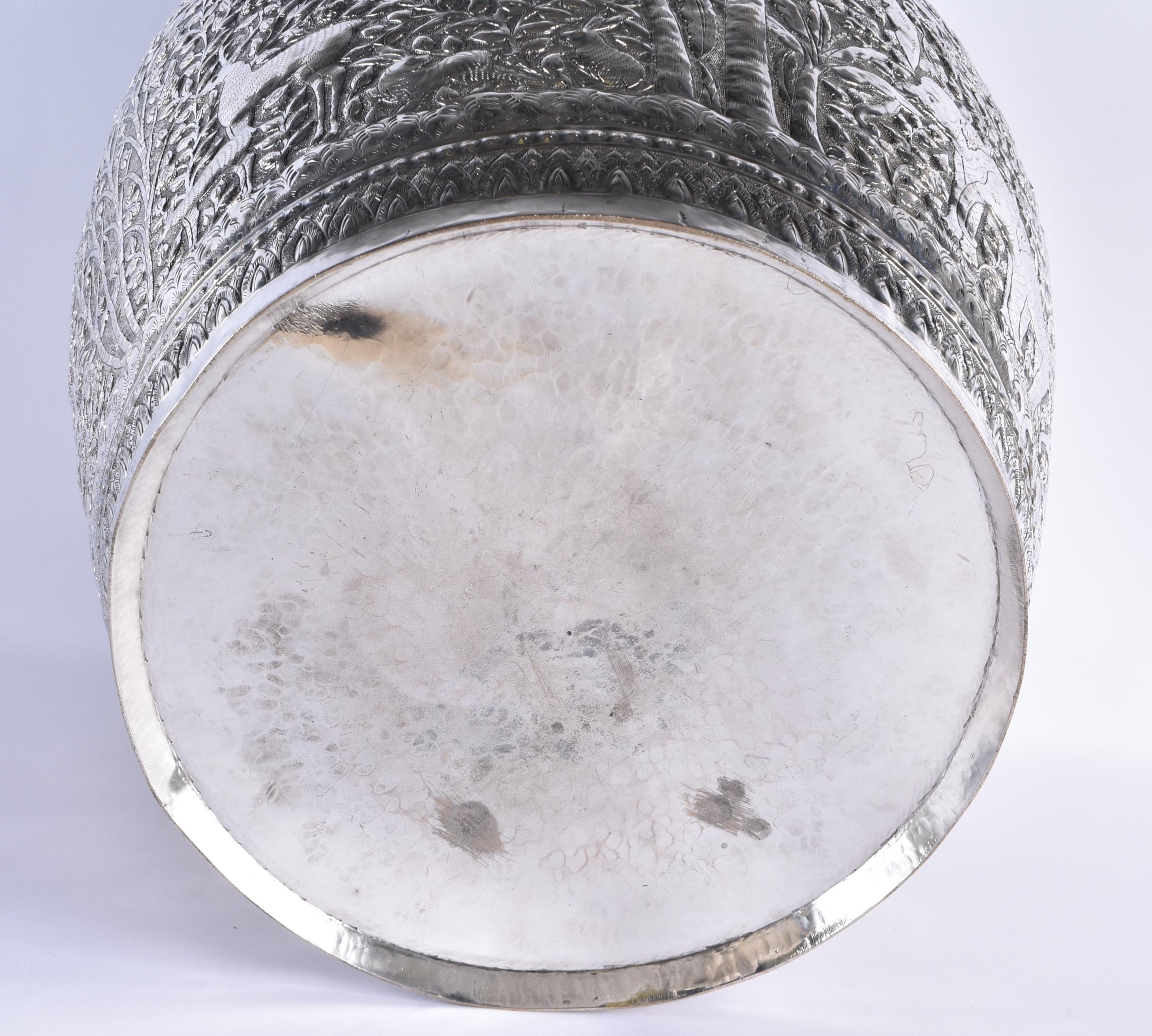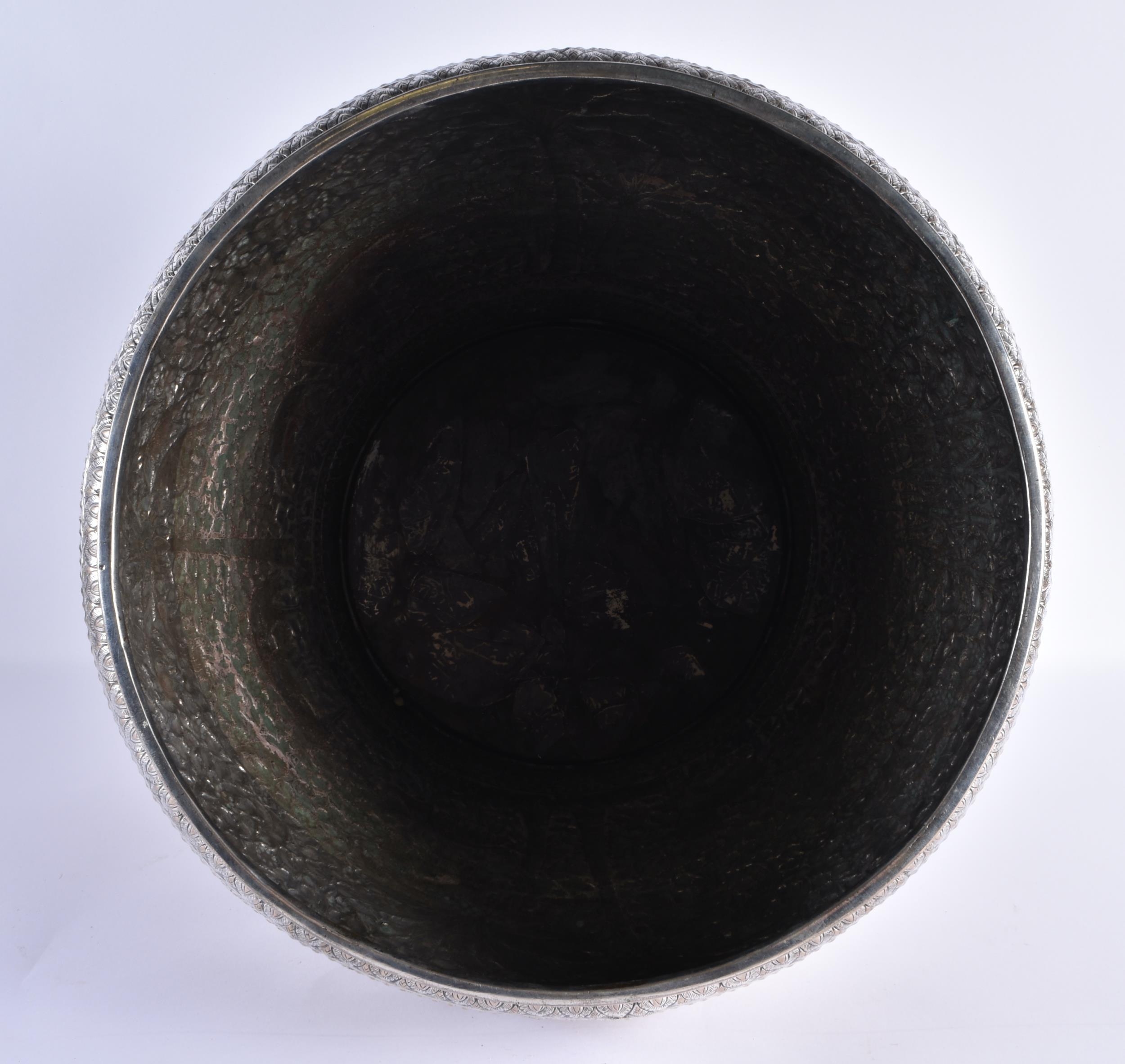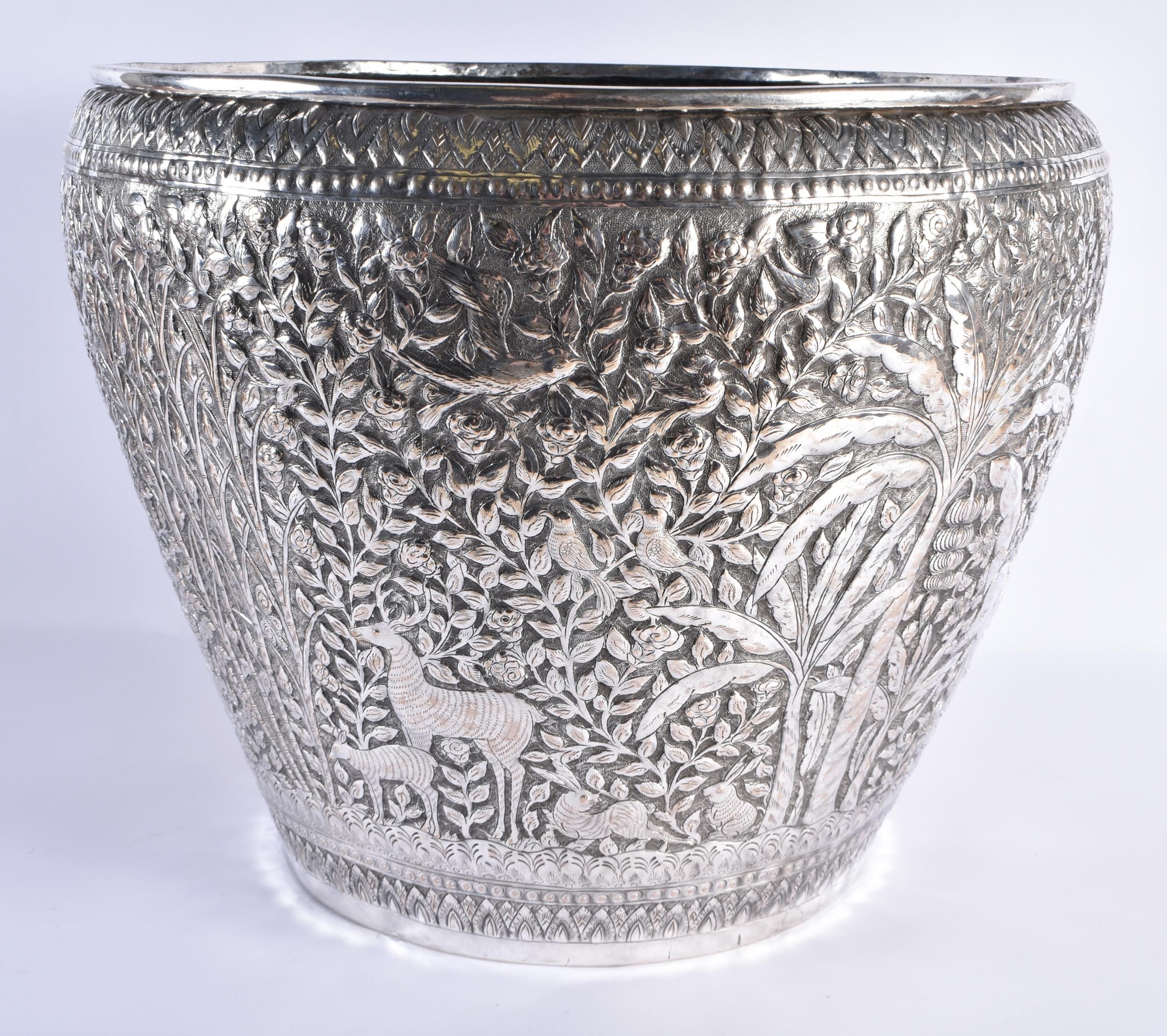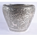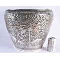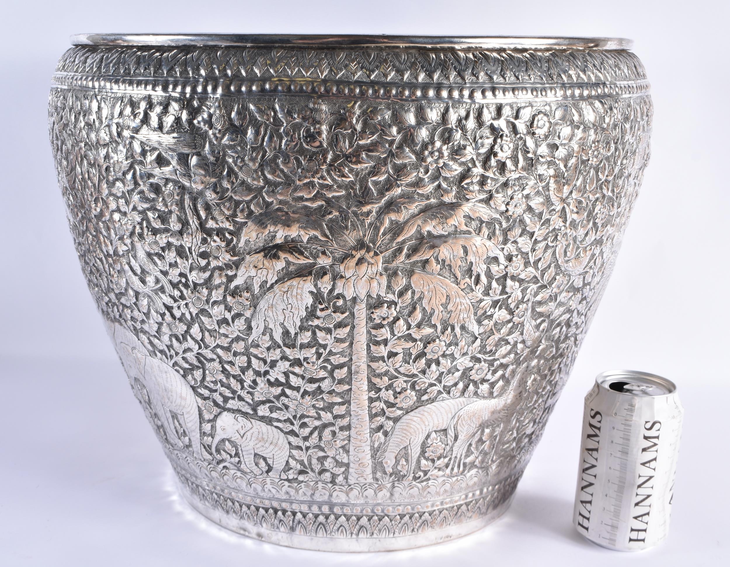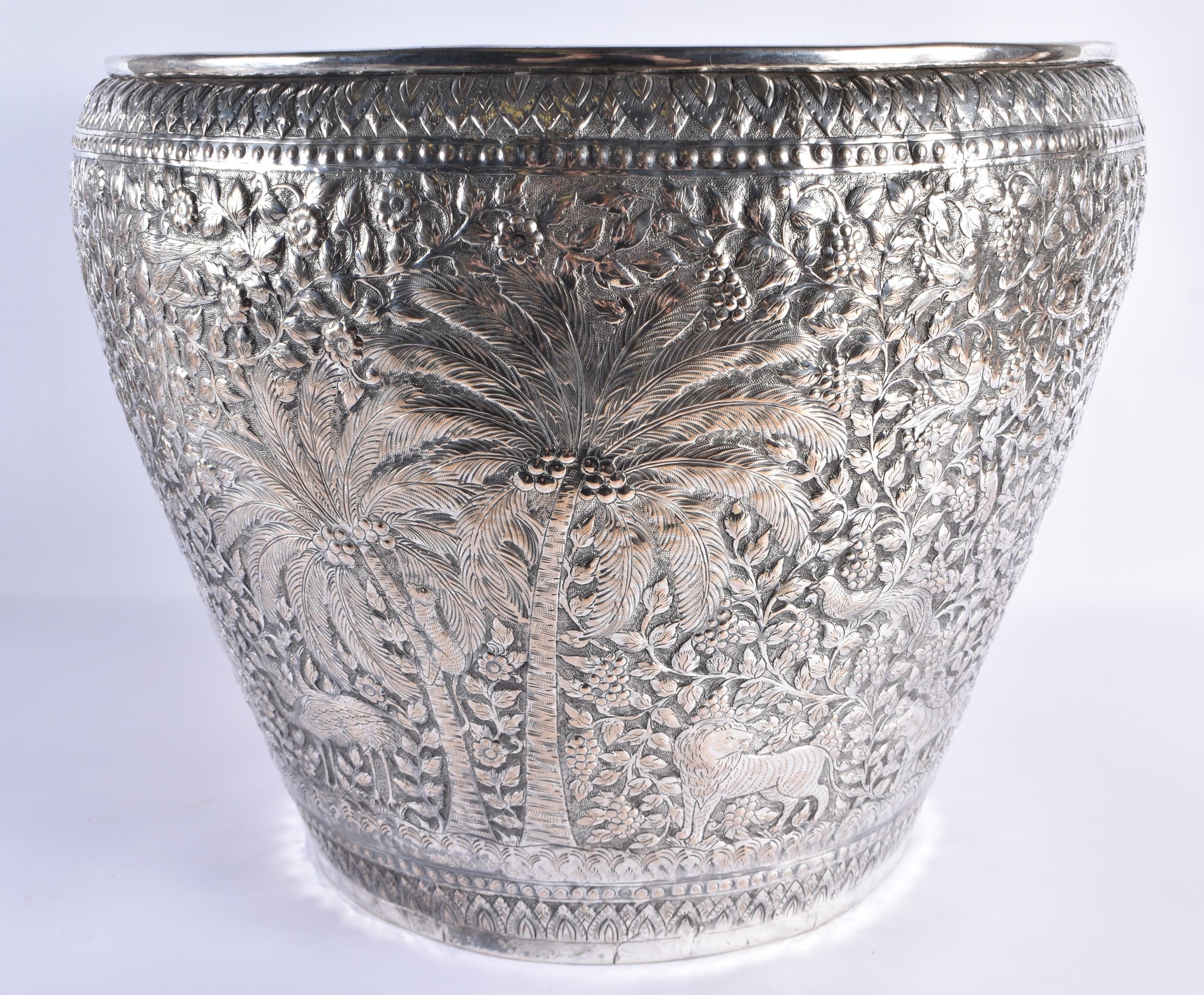A VERY LARGE LATE 19TH CENTURY INDIAN WHITE METAL JARDINIERE decorative with animals and palm trees, amongst extensive foliage. 3666 grams. 34 cm x 34 cm.