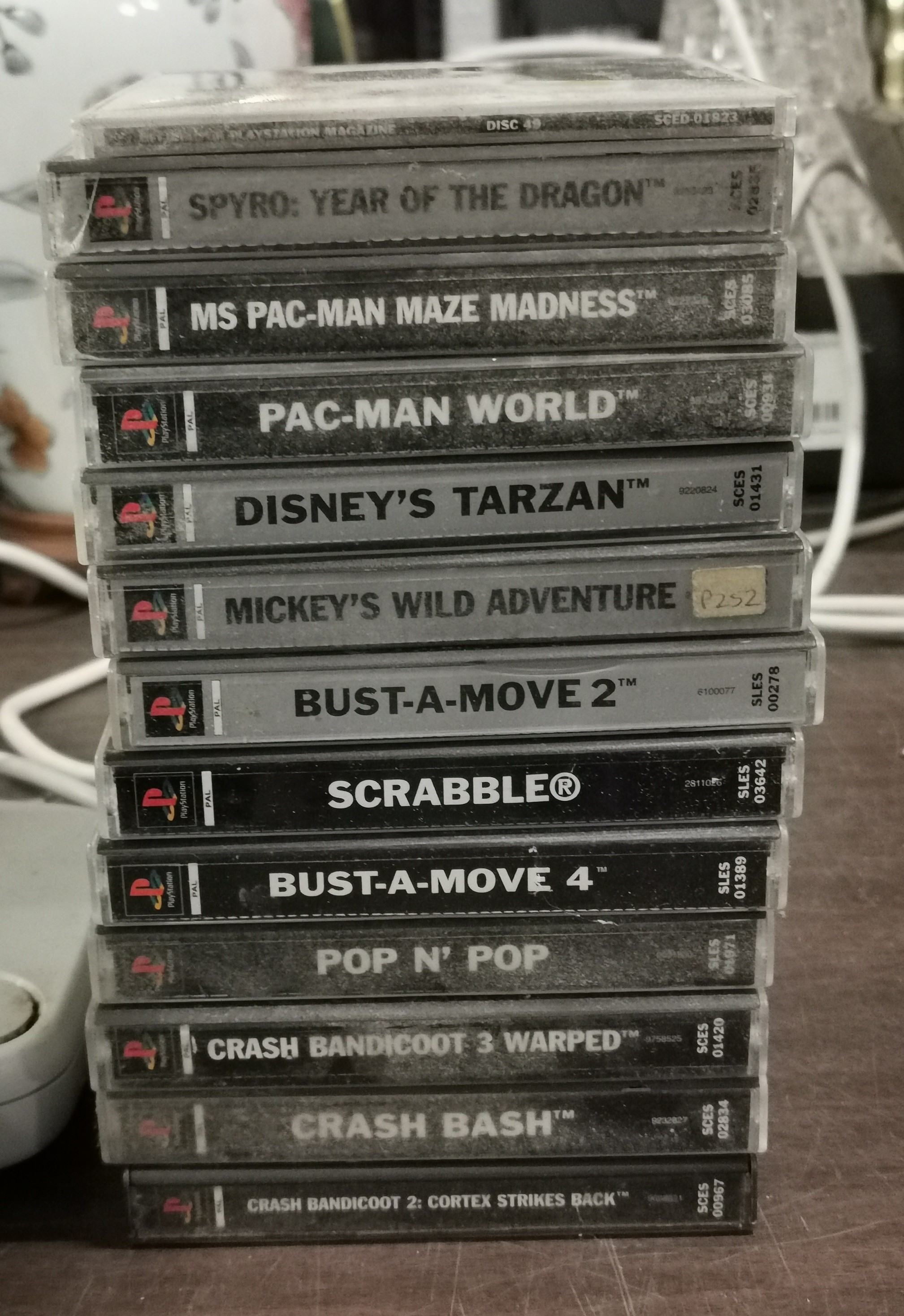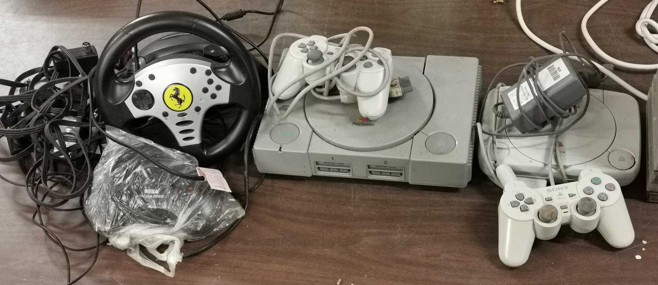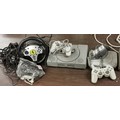 2 x Playstation consoles, controllers, steering wheel, Sega Megafire controller and bundle of assorted PS1 games