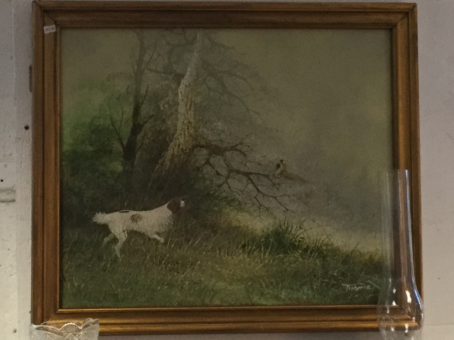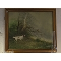 Oil on canvas of a dog chasing birds, indistinctly signed -