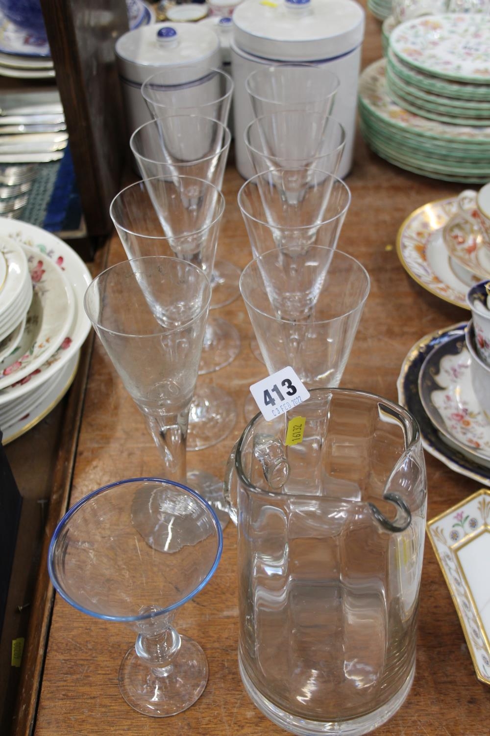 Eight drinking glasses, a jug, and another glass.