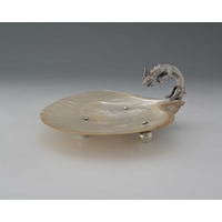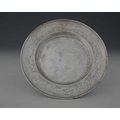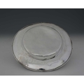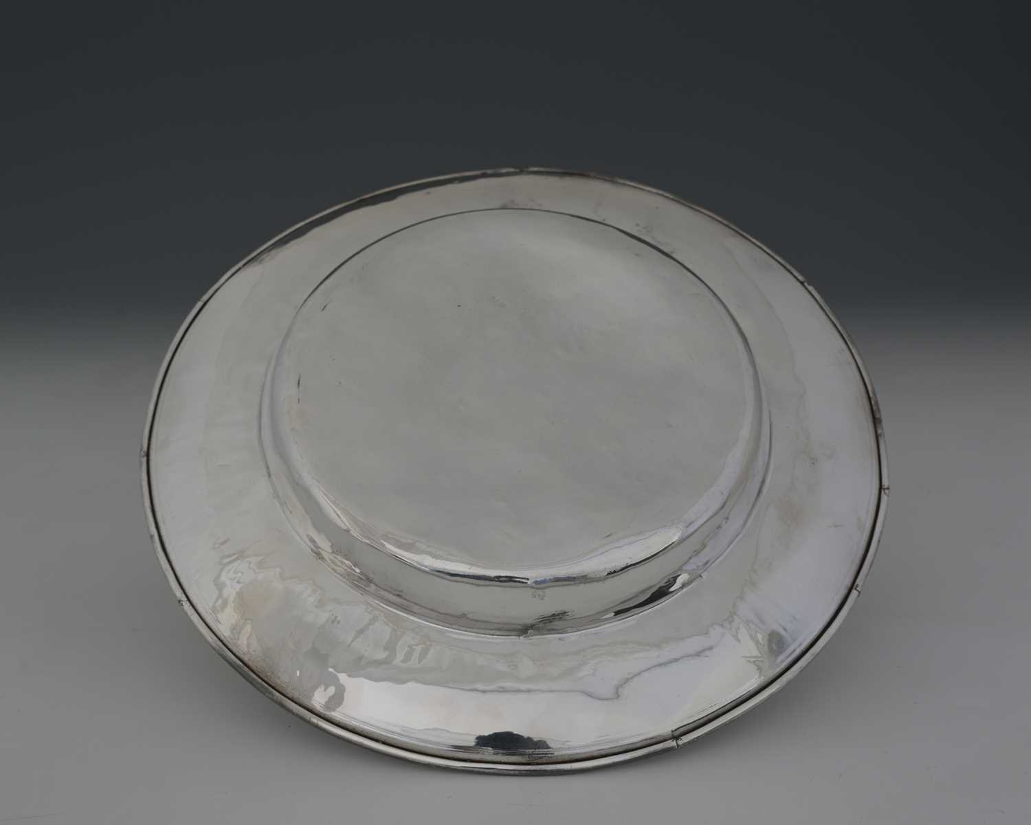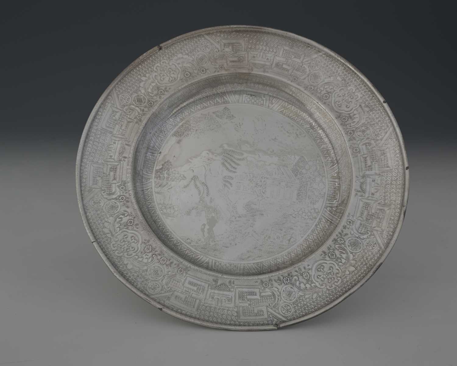 A Chinoiserie dish, decorated with temples and prunus, with scrolls and a diaper-work border, apparently unmarked, diameter 29.7cm, weight 405g/13.02ozt approx
