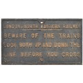 Cast iron sign, London & North Eastern Railway BEWARE OF TRAINS. Railway service paint front and rear, bolt rusted in lower hole. 22 x 12 1/2 inches. Shipping band - collection only.