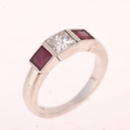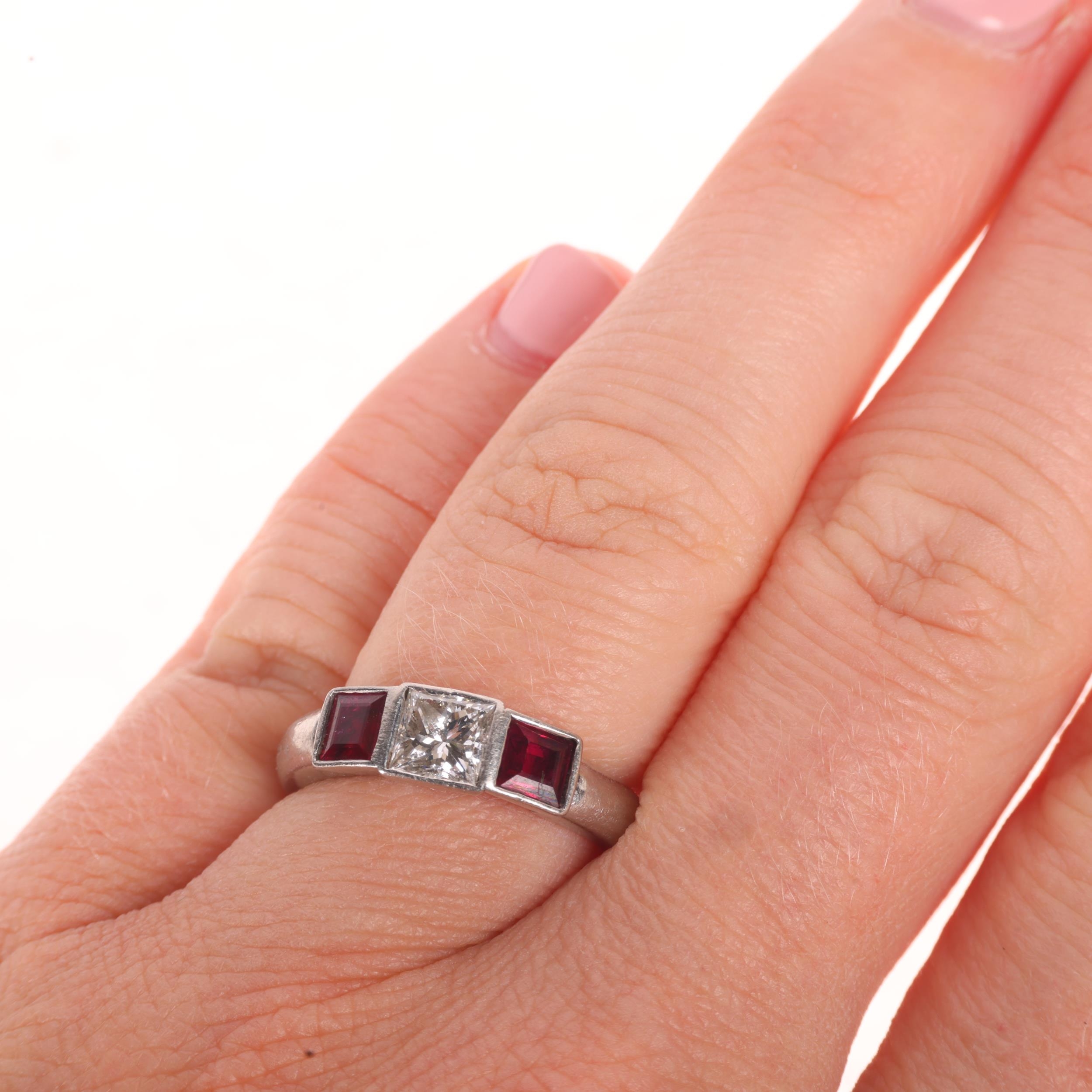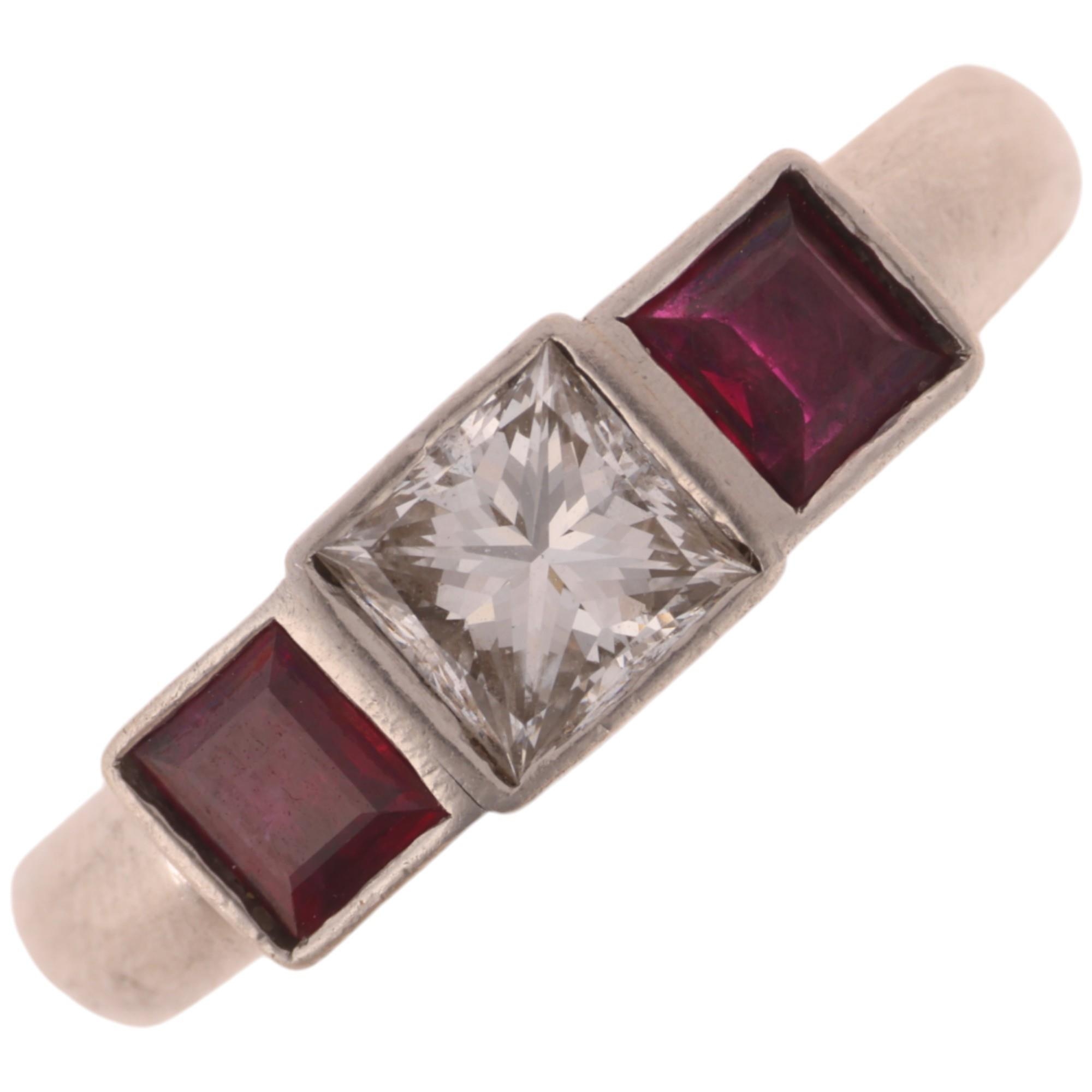 A platinum three stone ruby and diamond ring, rub-over set with 0.7ct Princess-cut diamond, colour approx G, clarity approx VS, and square step-cut rubies, setting height 5.4mm, size K, 7g, with GLS Jewellery report