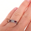 No damage, all stones present, diamond quite bright and lively with a slight yellow tint and no obvious internal inclusions under a loupe, rubies are a deep red with indications of heat treatment, light wear to high points of settings and still heavy gauge, full UK hallmarks clear, stamped 950