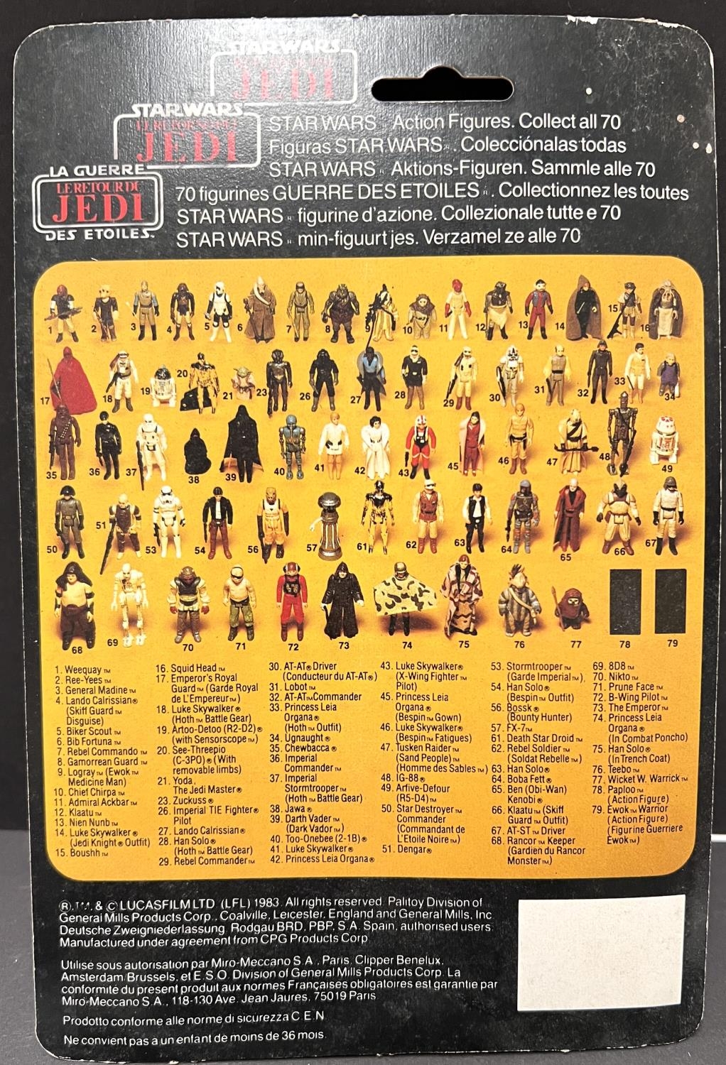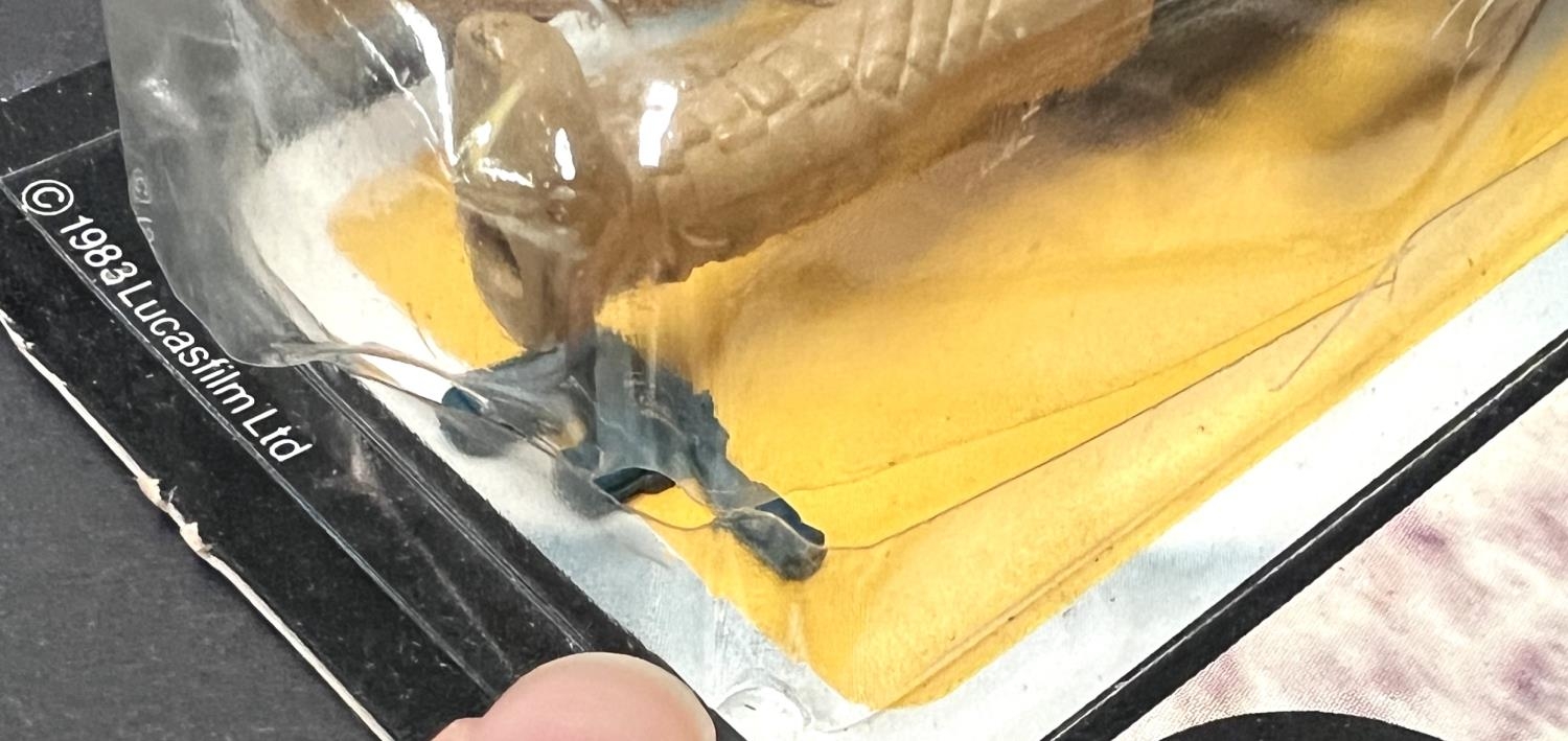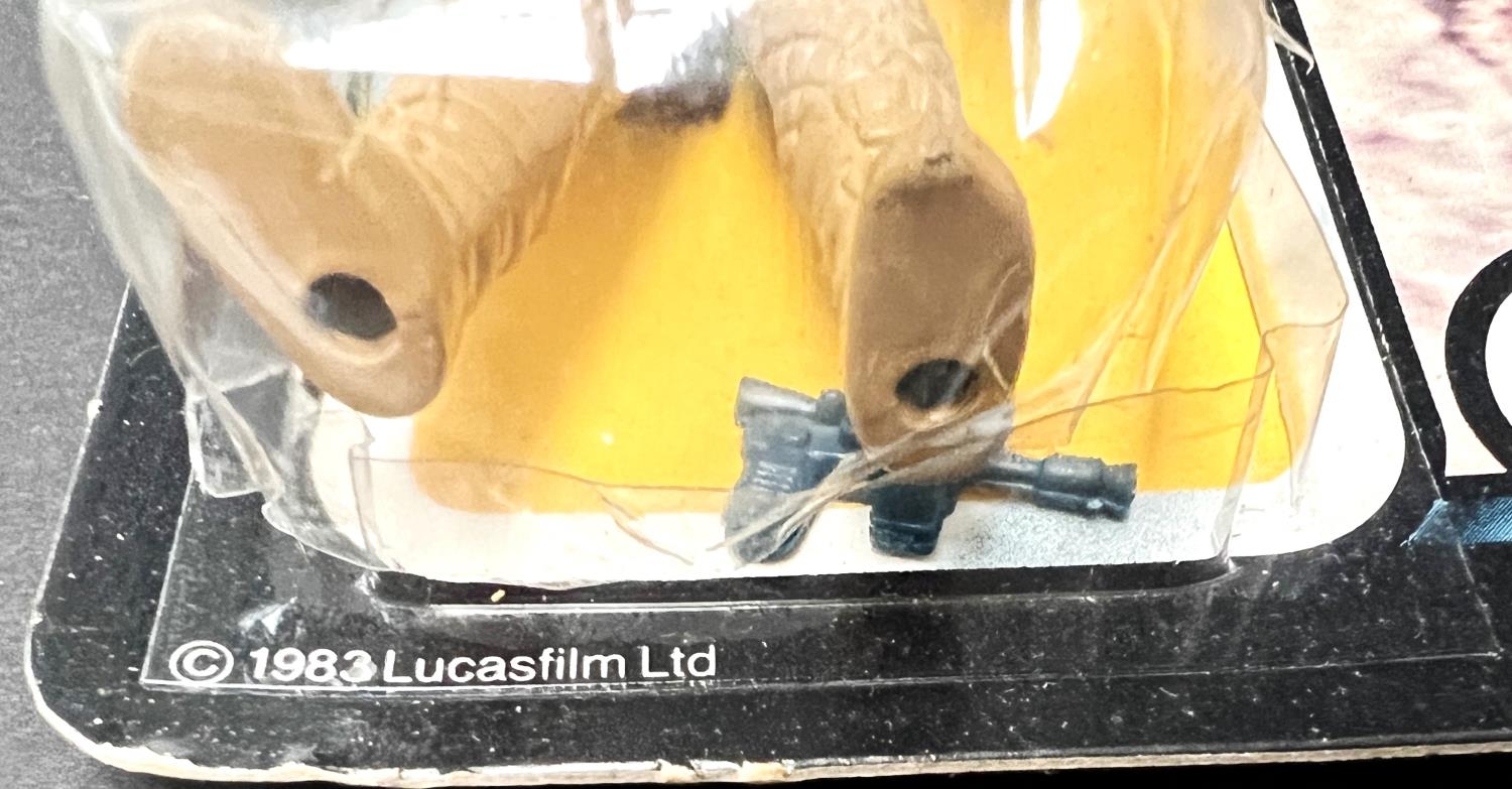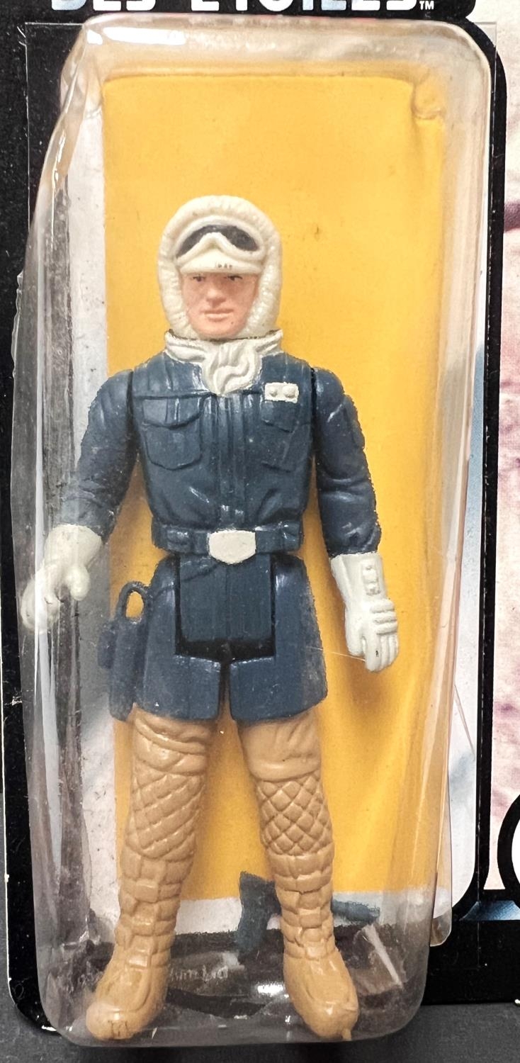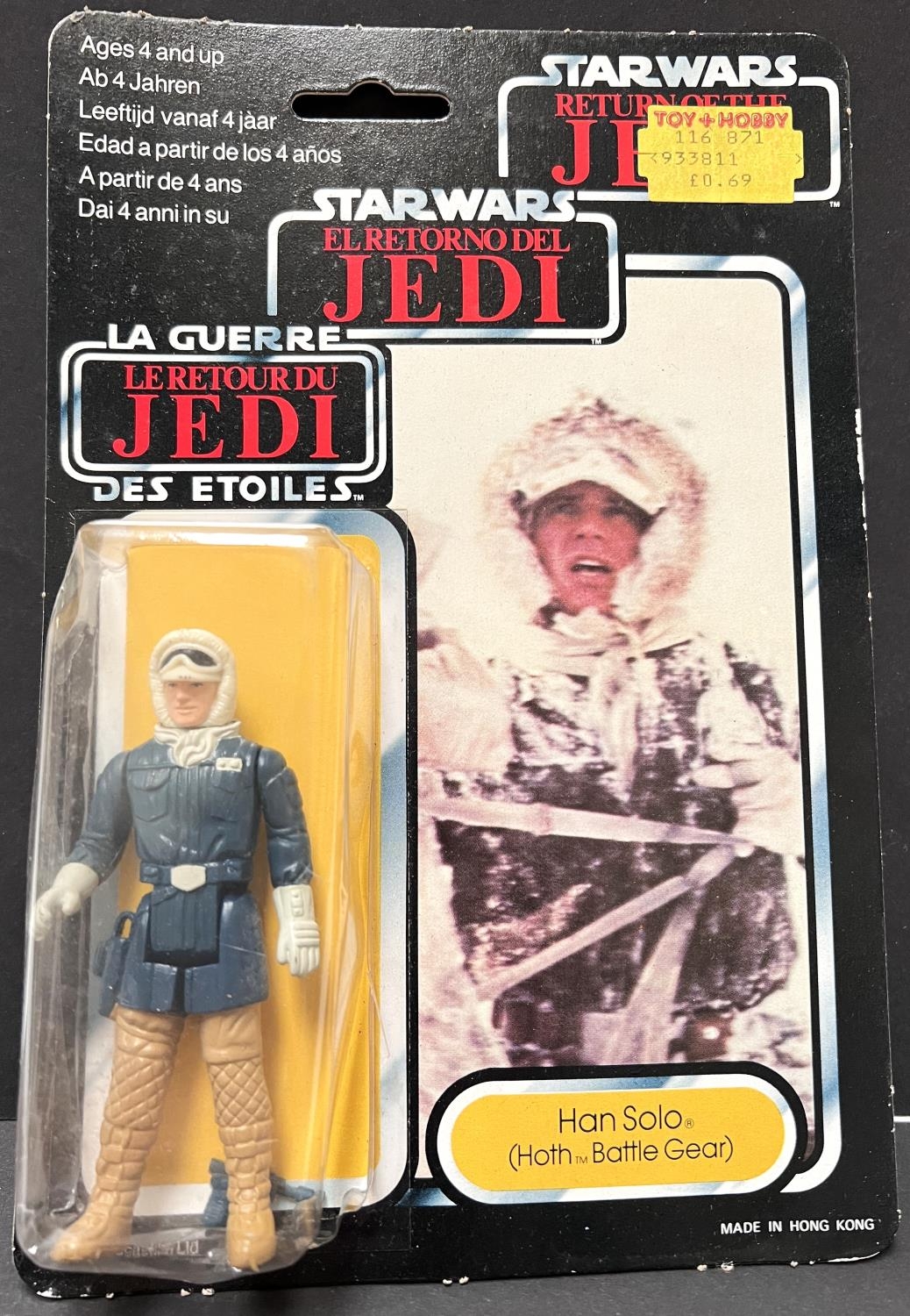 A Palitoy General Mills Return of the Jedi figure on card: Han Solo in Hoth Battle Gear, Tri-Logo, Toy & Hobby Shop label to top right, blister back split, 3.75"