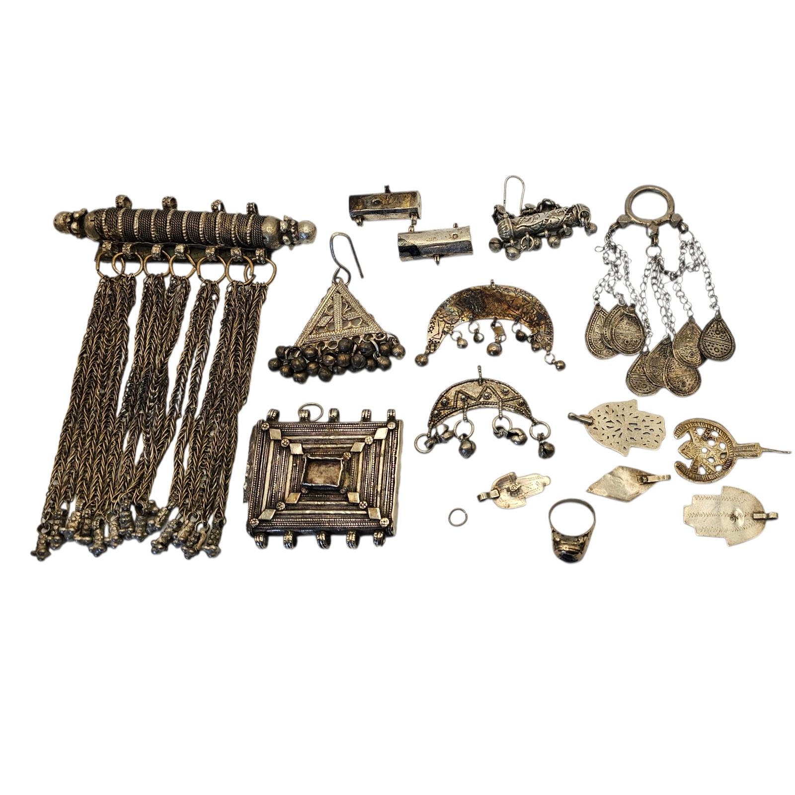 A group of Berber and Bedouin jewelry, including a Moroccan Hirz amulet box, several Hamsa pendants, and a heavy Tizabit bar with cascading chains, high grade silver with characteristic tribal wear and aged patina.