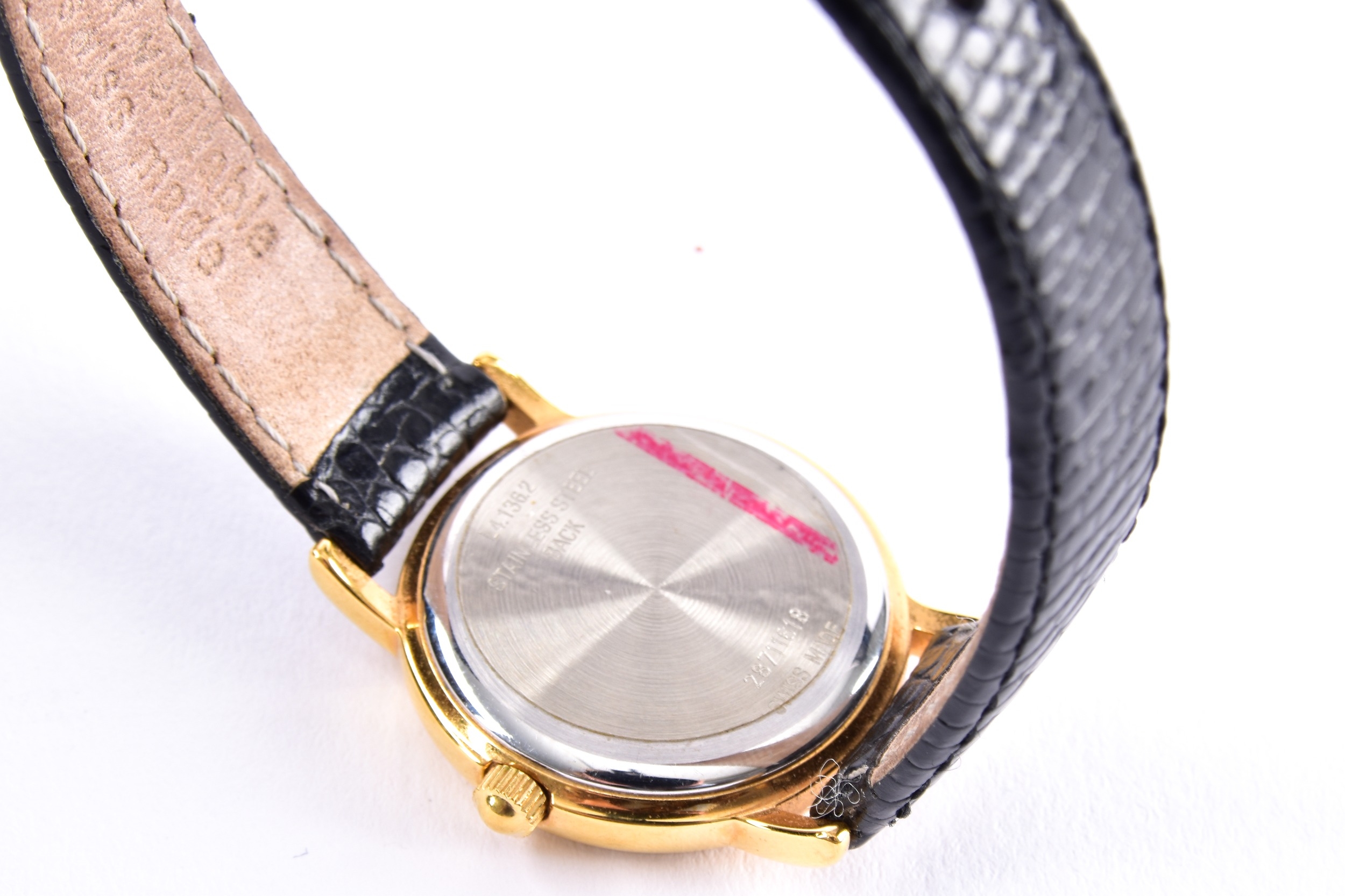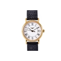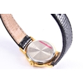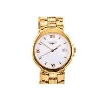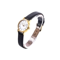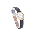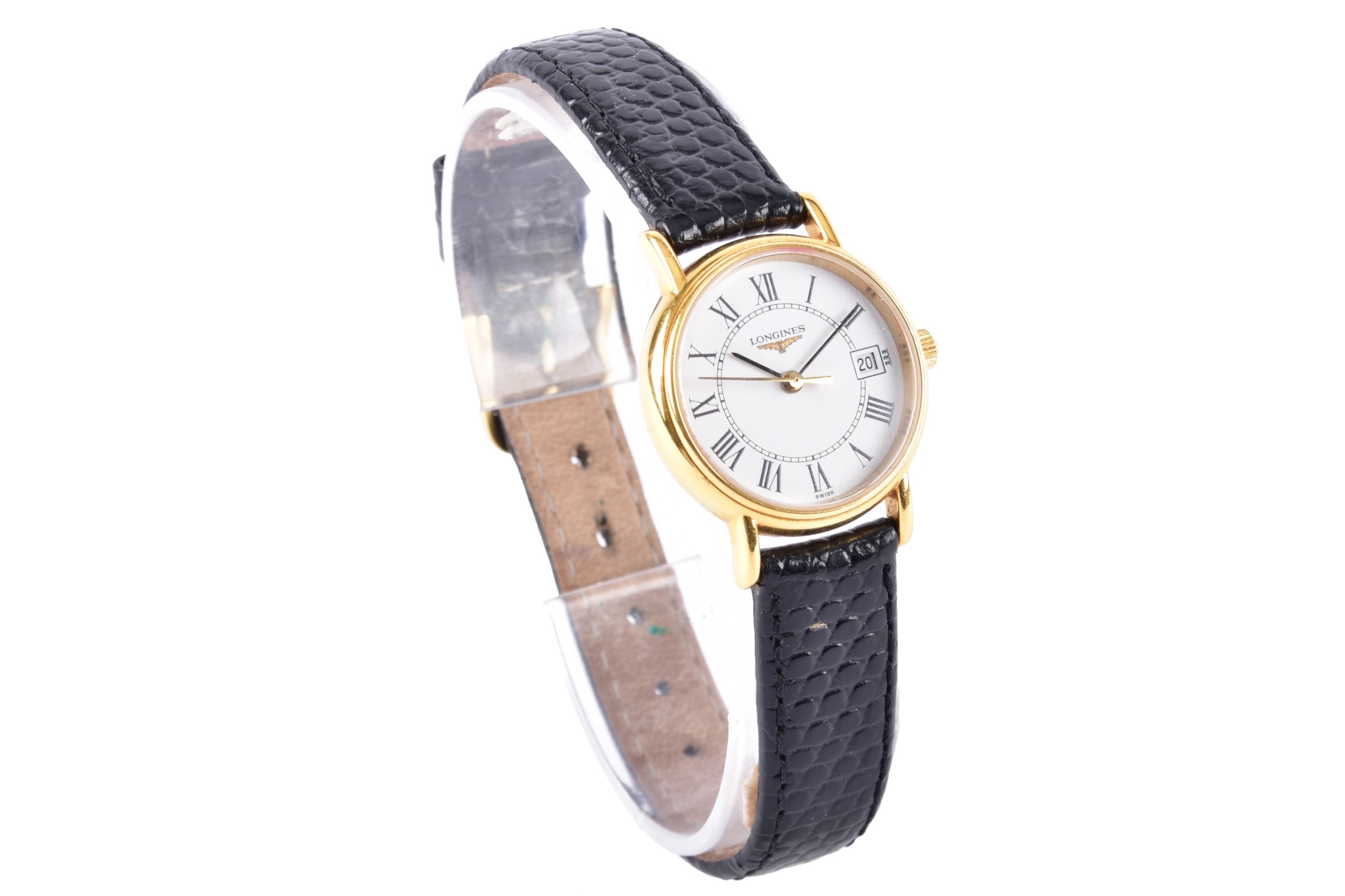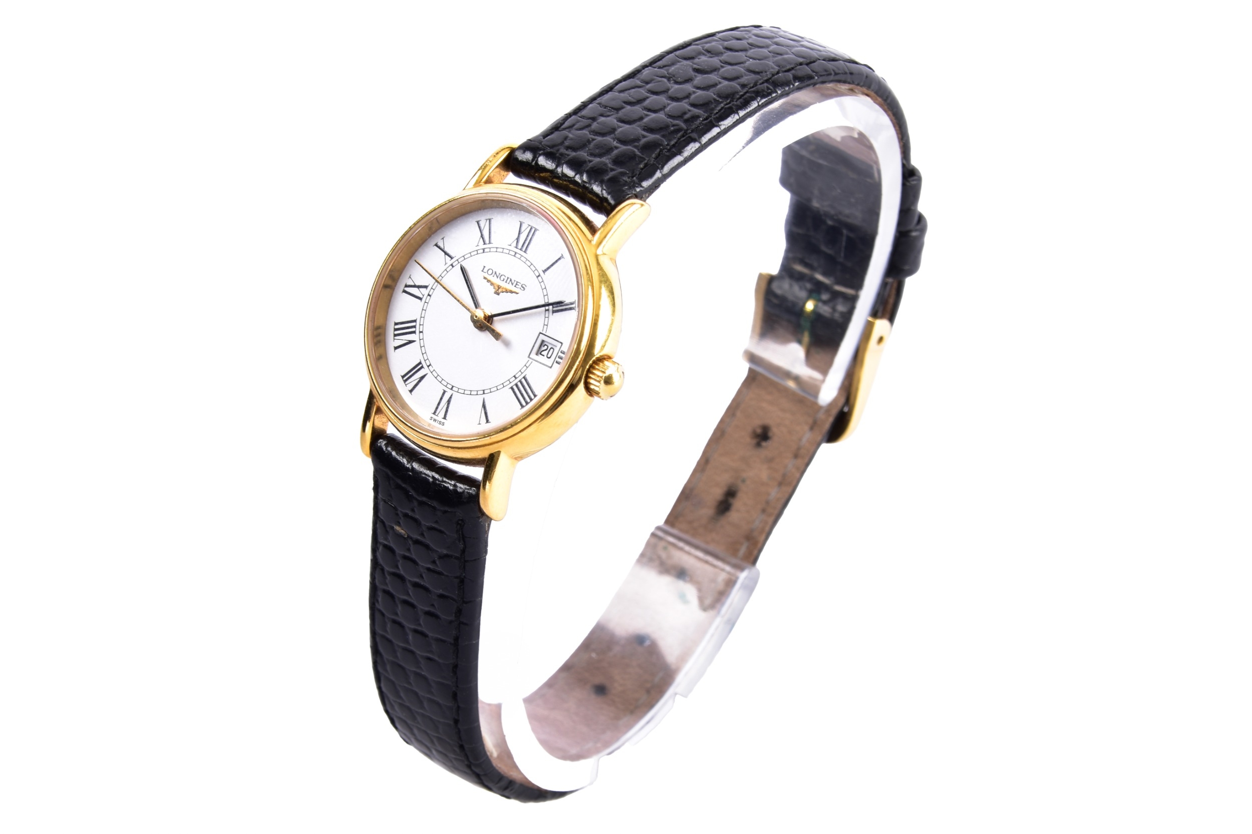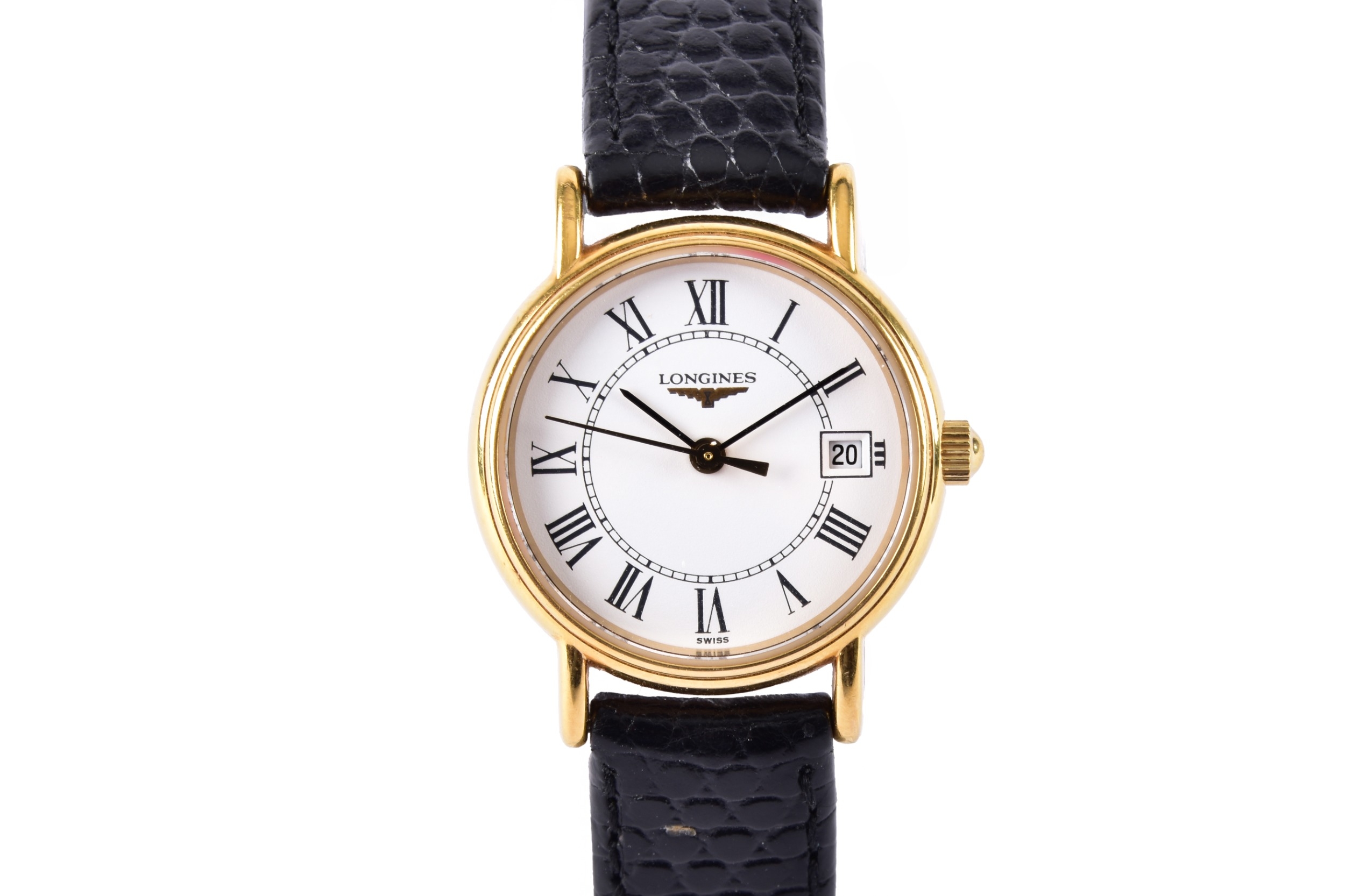 A gold plated ladies L4.1362 Longines watch, the white dial with roman Numeral indices, date aperture at 3, case size 23 mm, Serial number 28711618, fitted with a Longines black strap.