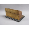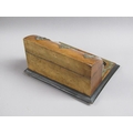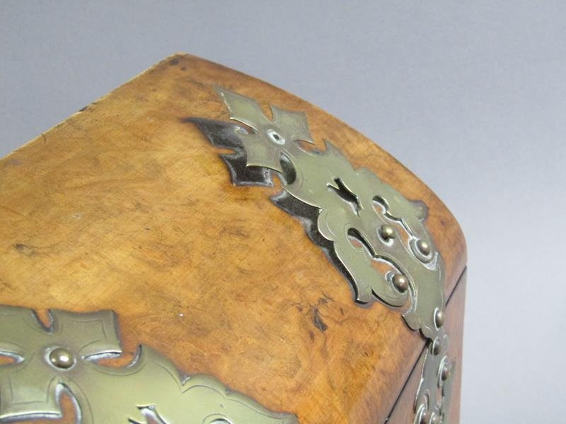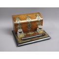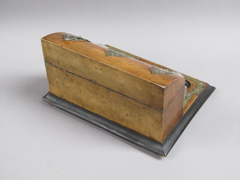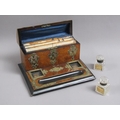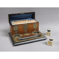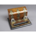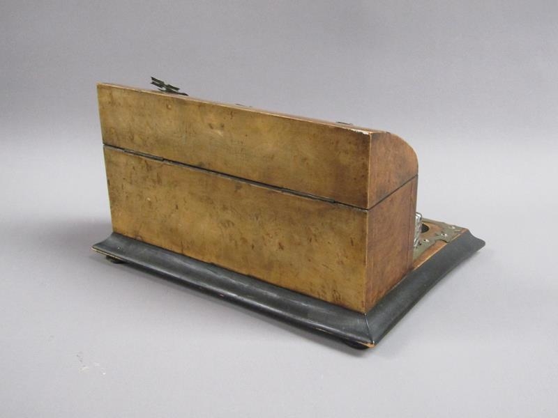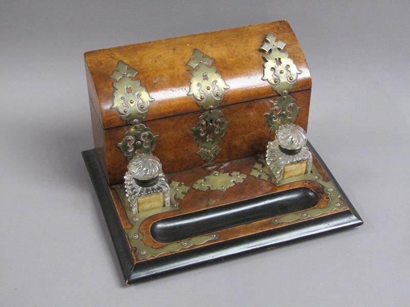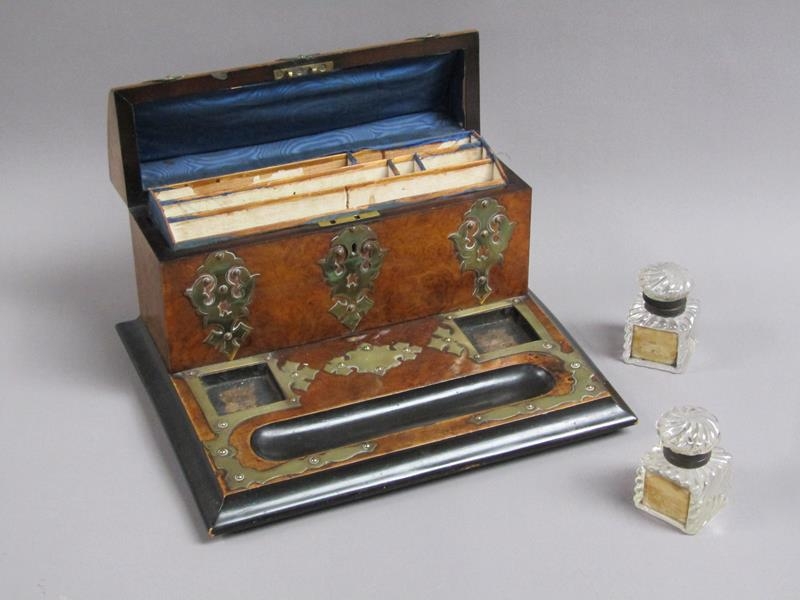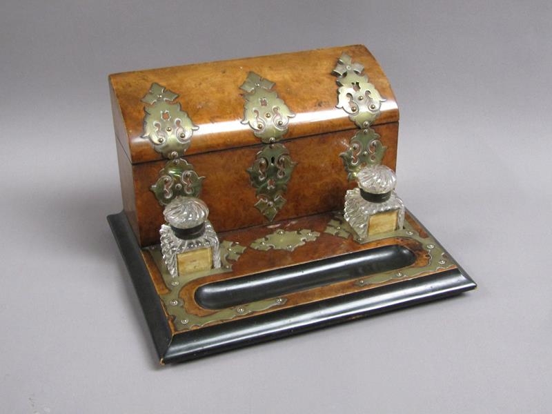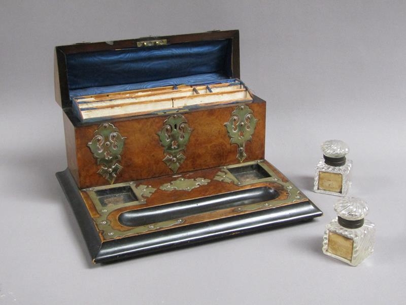 A Victorian burr walnut two bottle inkstand with pen tray and a stationery box fitted and with hinged rising top, the whole with cut brass mounts and having two writhen moulded inkwells with covers, 34cm w, 19cm h.
