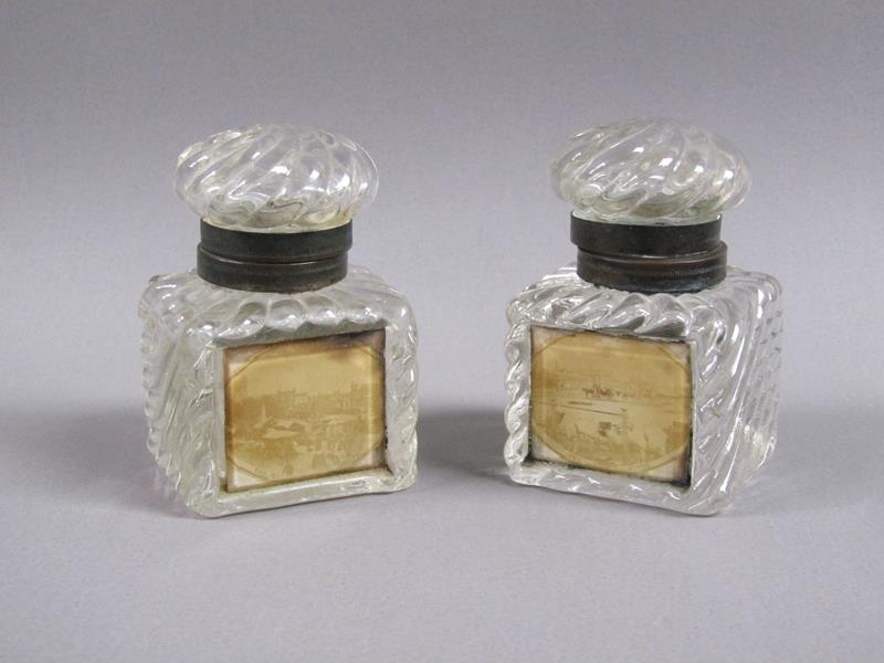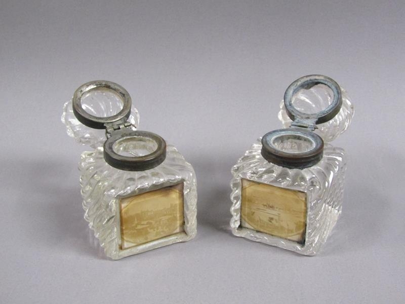Good original condition. The fittings in the stationary need attention. The right hand cut glass plate requires a pin to attached it to the lid.
