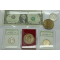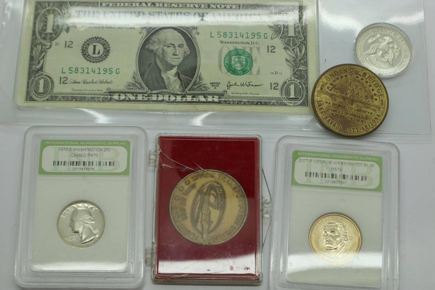 INB slabbed 2007 US $1 and 1976 US 25c, with other US denominations and commemoratives. UK P&P Group 1 (£16+VAT for the first lot and £2+VAT for subsequent lots)