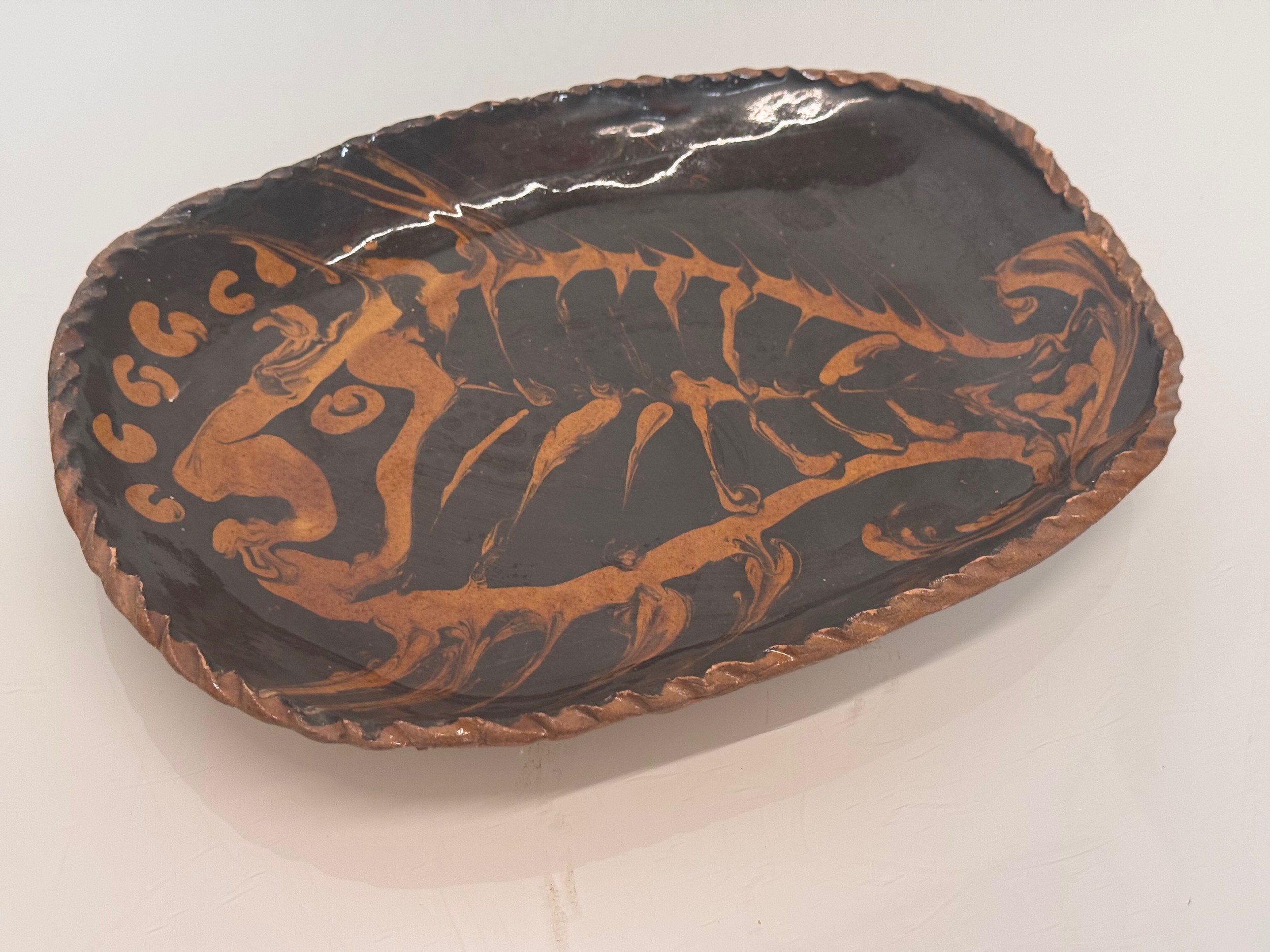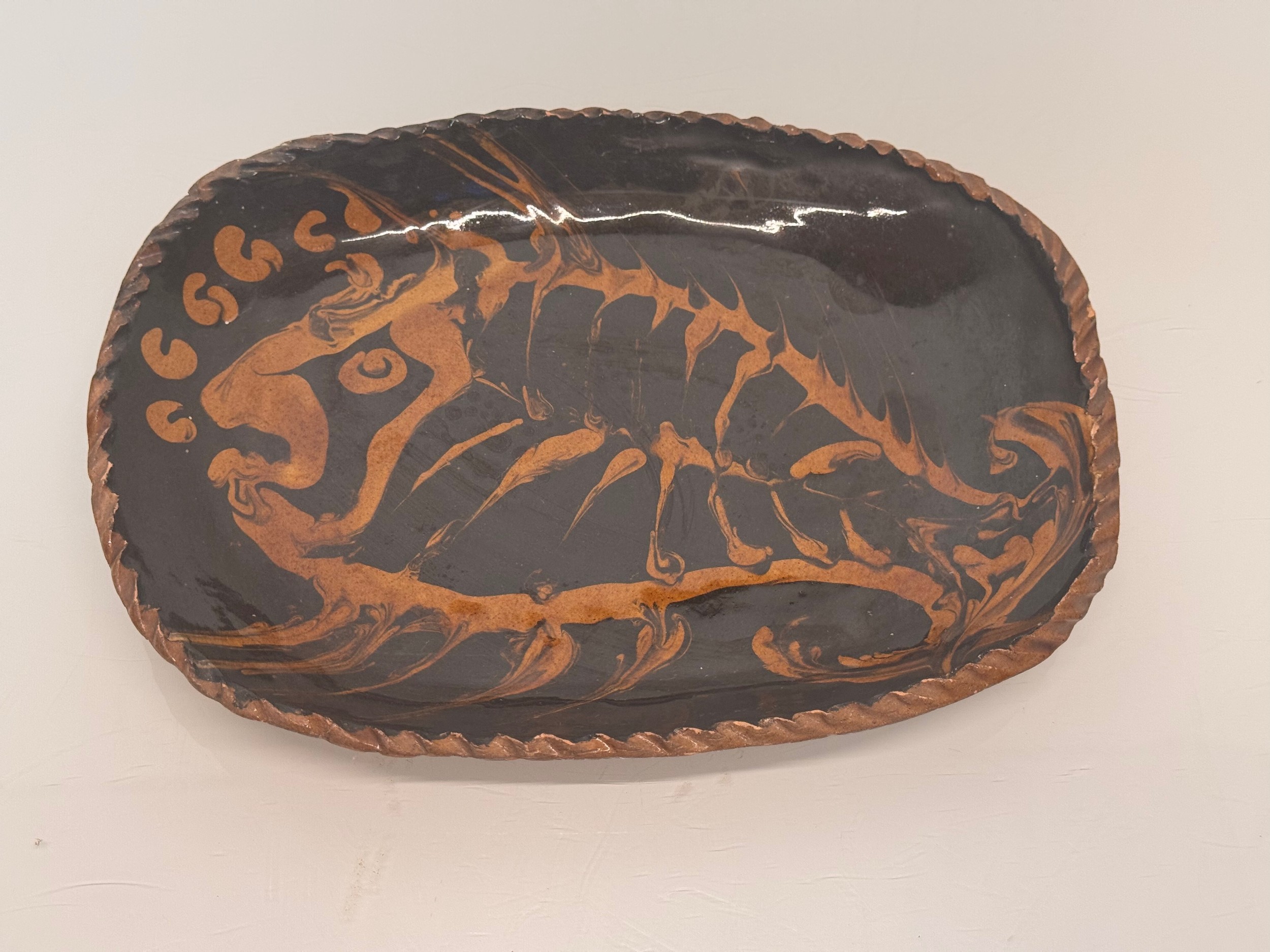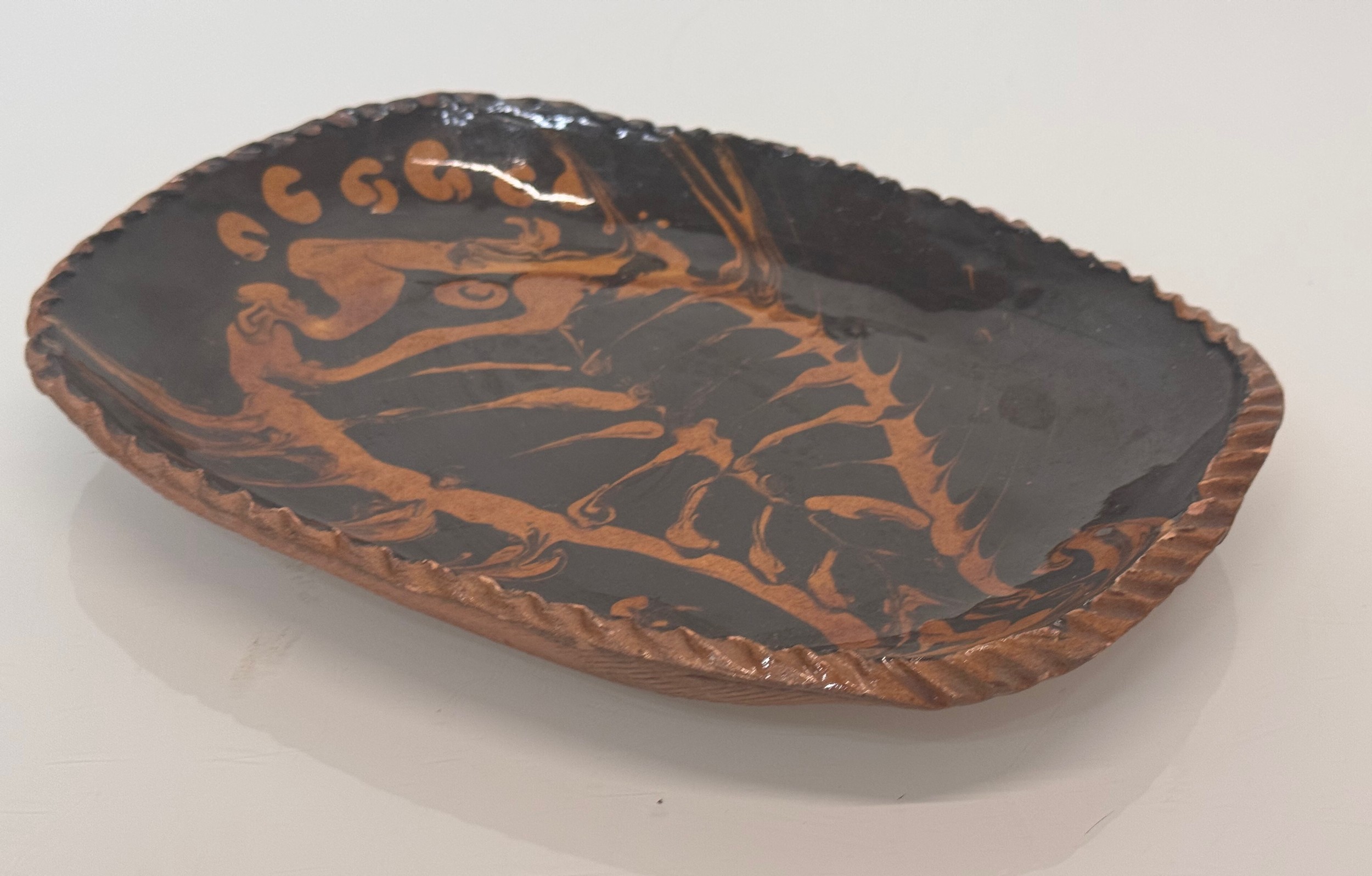 English slip ware dish, illustrated with a fish, 29 cm wide.This lot is available for in-house shipping
