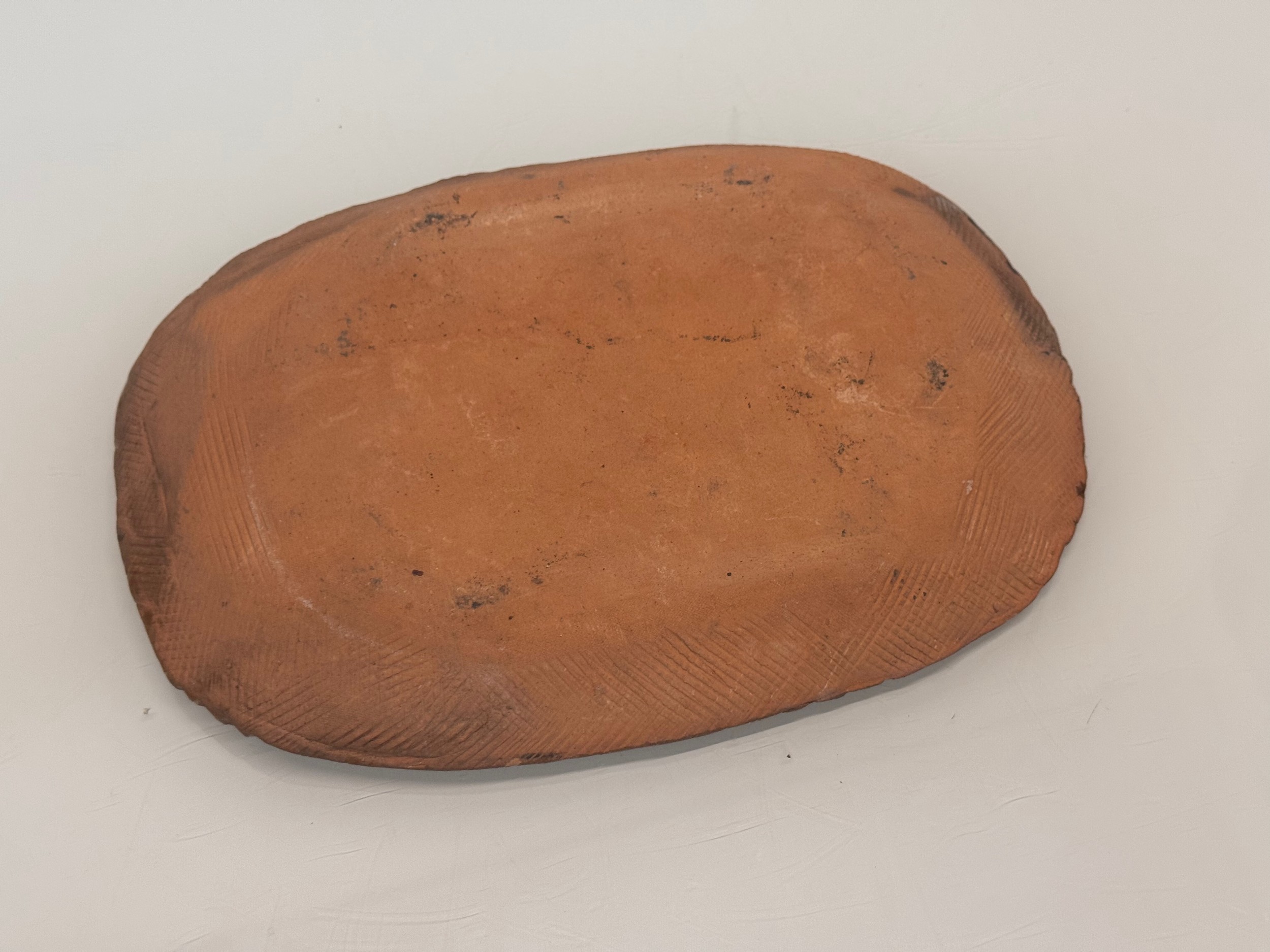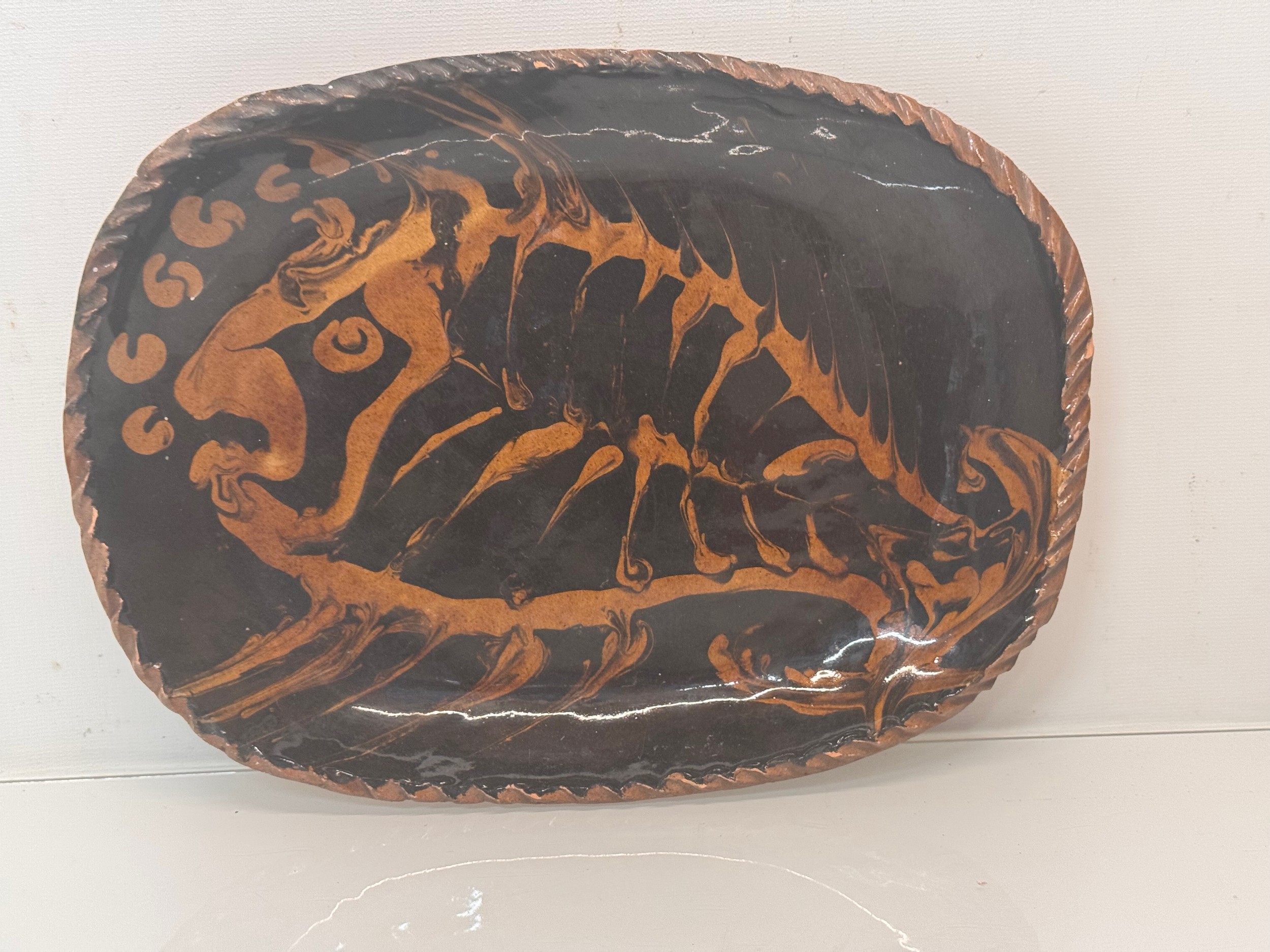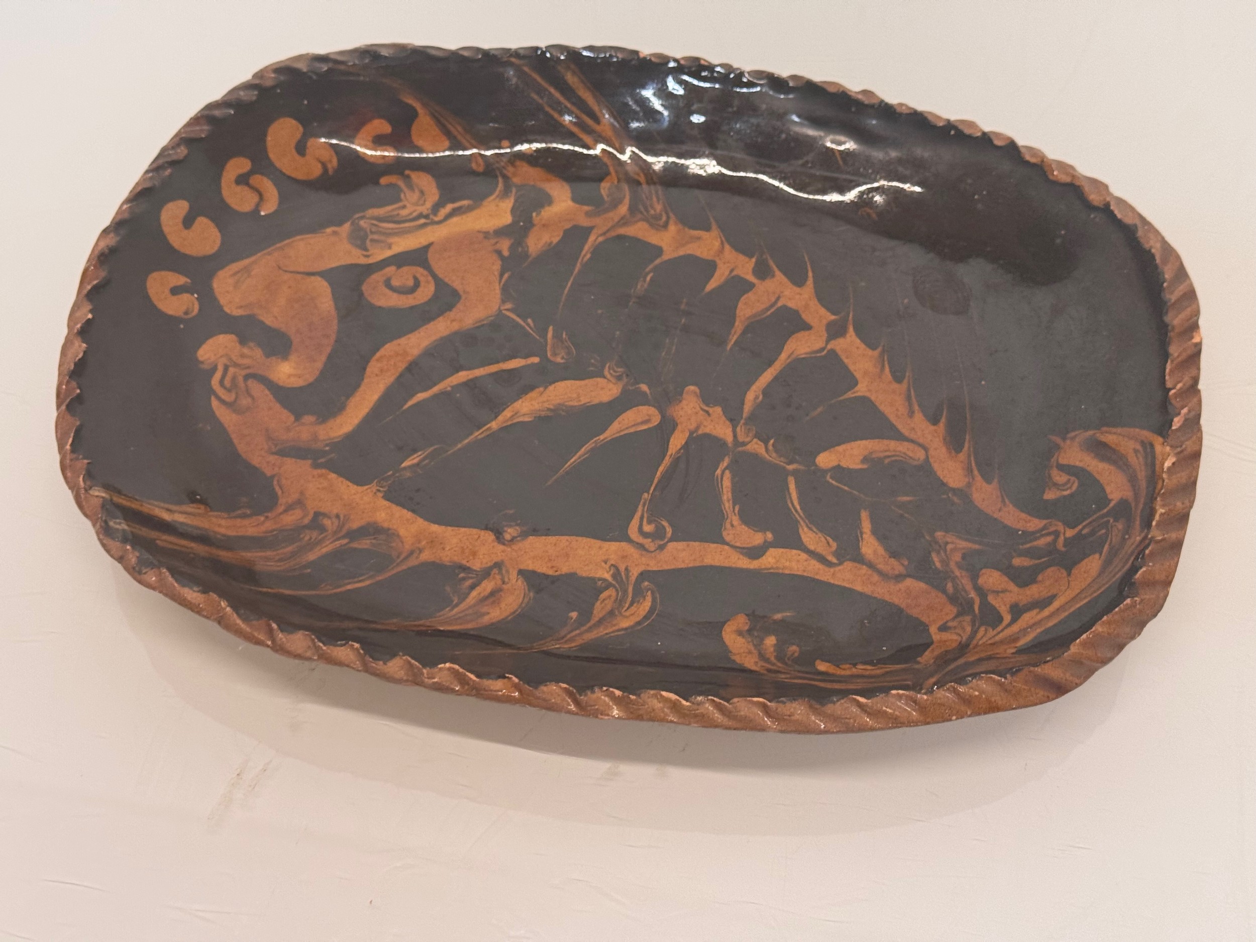 English slip ware dish, illustrated with a fish, 29 cm wide.This lot is available for in-house shipping