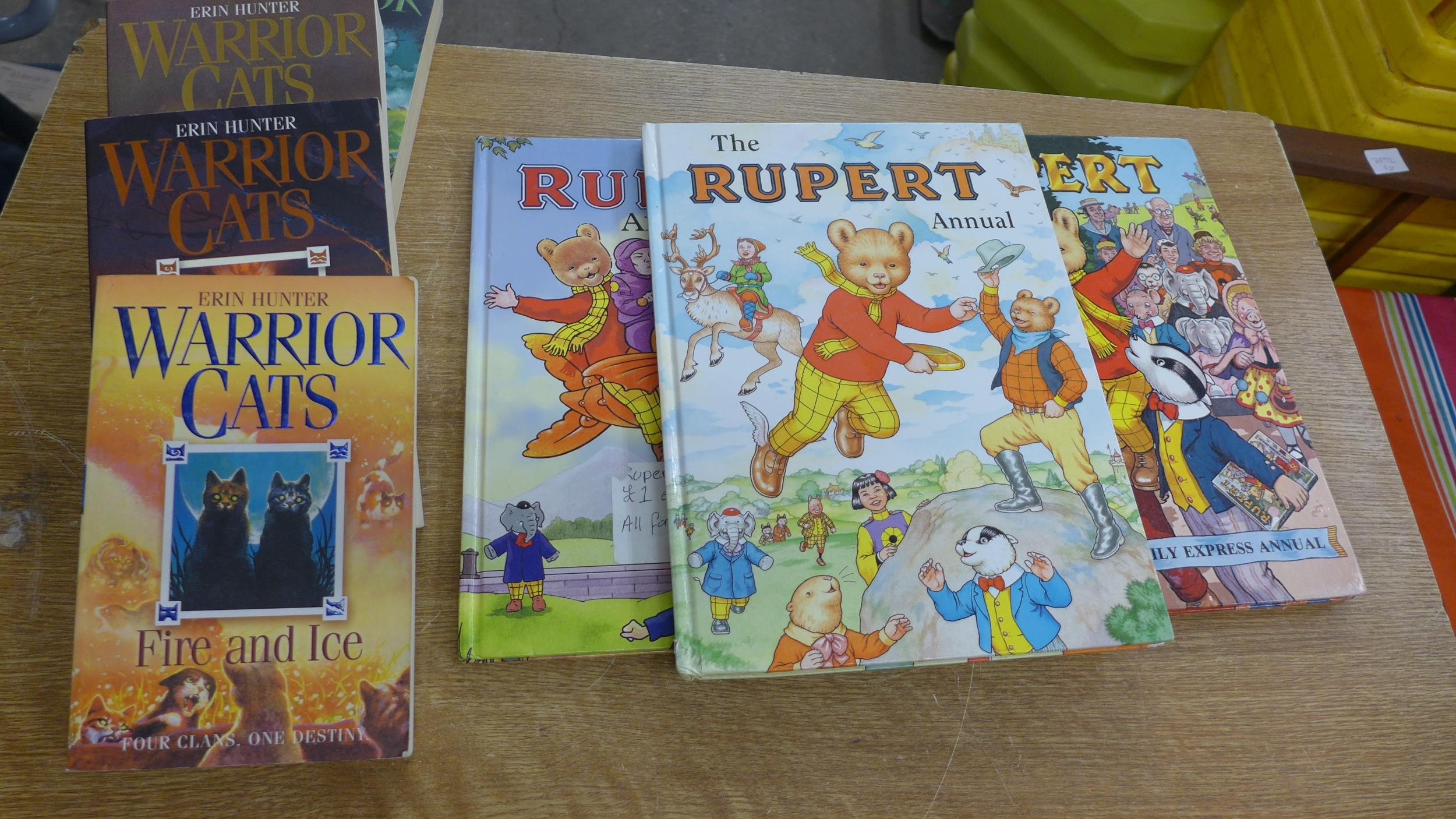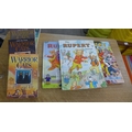 Bag of mixed books, inc 11x Rupert The Bear annuals, box of party related items, Turtles, Power Rangers, Barbie, Bob The Builder, etc. and ab ox of roller skate spares (Bauer) and a pair of leather 1980's figure skates