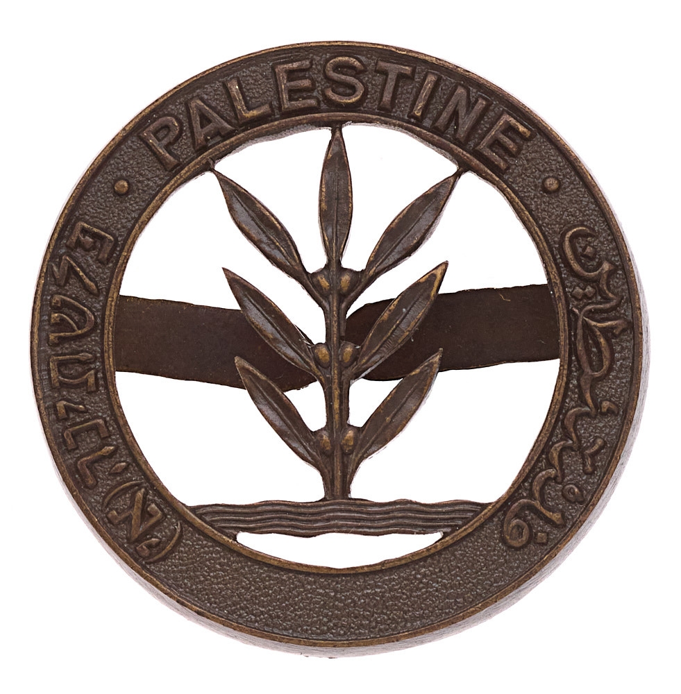 Palestine Regiment OSD cap badge c. 1942-48. Good scarce die-cast bronze Olive tree within a circlet inscribed PALESTINE in English, Hebrew and Arabic. Raised J.R. Gaunt London Blades. VGC Palestine Regiment was formed in September 1942, disbanded August 1948.