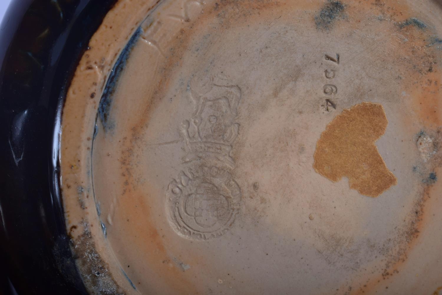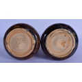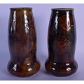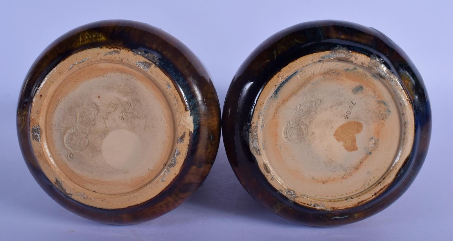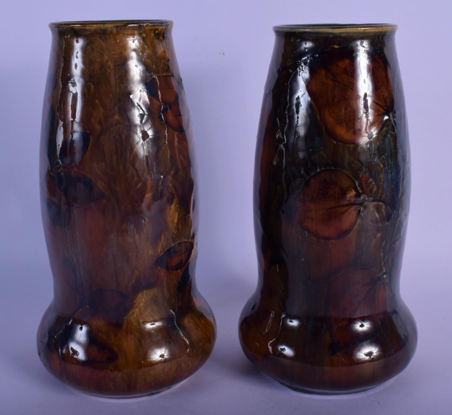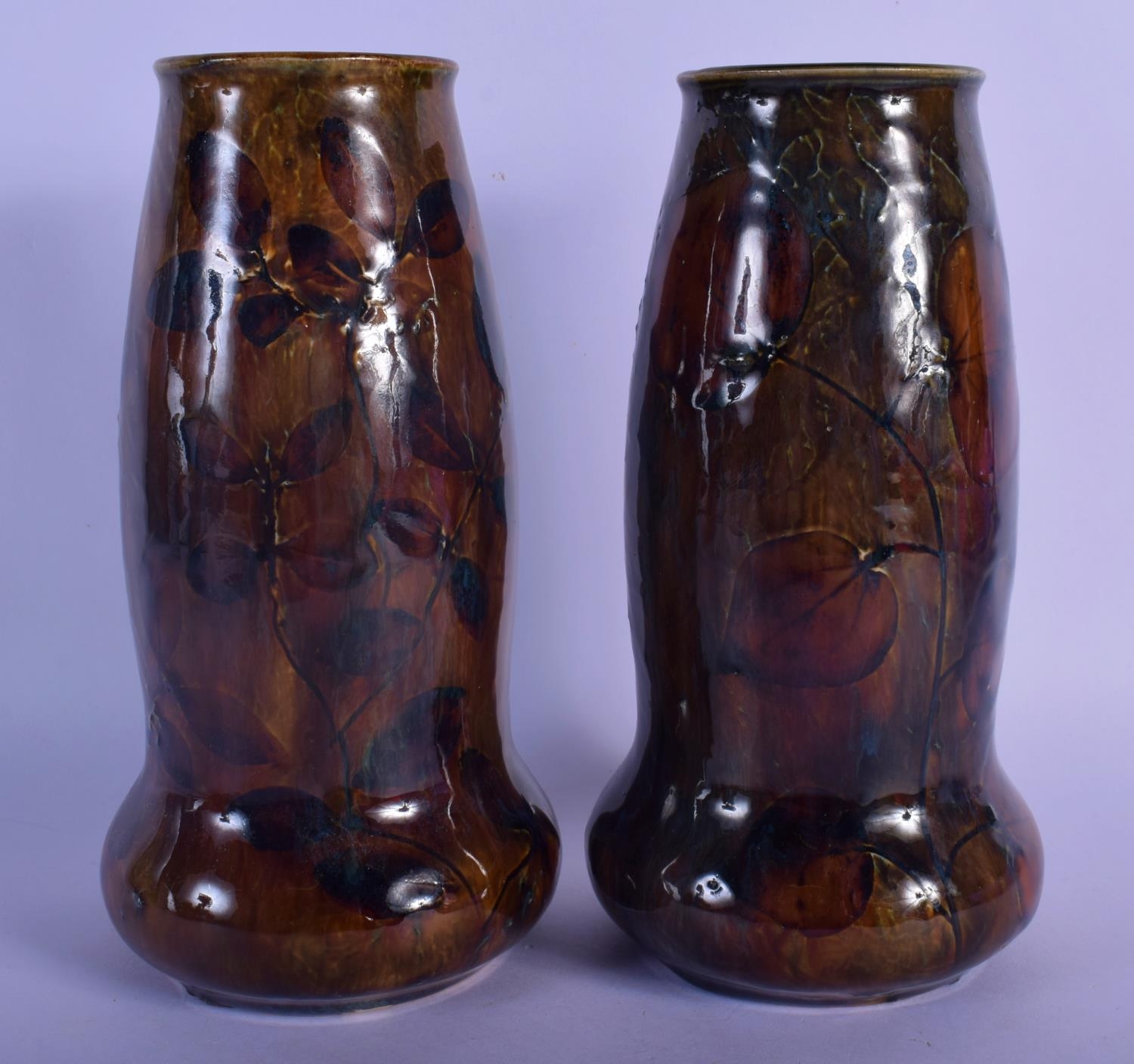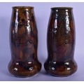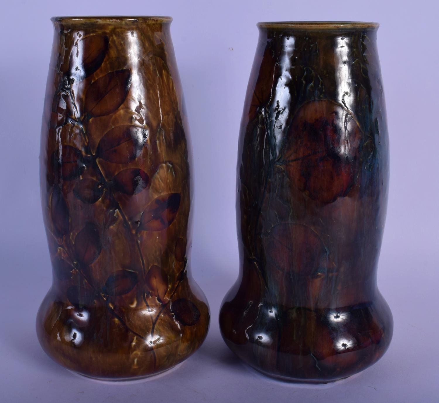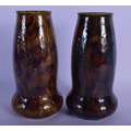A PAIR OF ROYAL DOULTON STONEWARE VASES painted with leaves. 20 cm high.