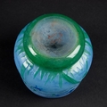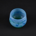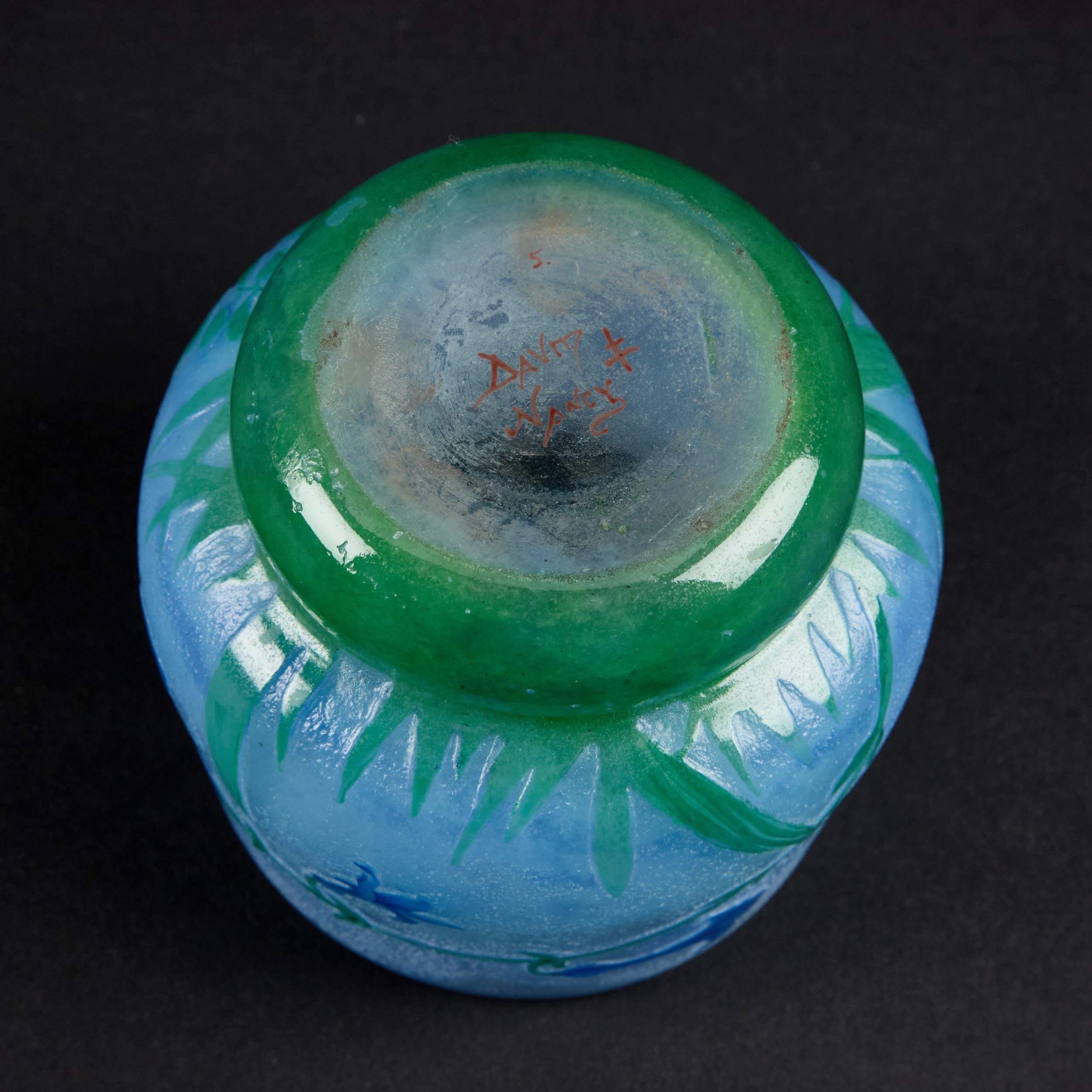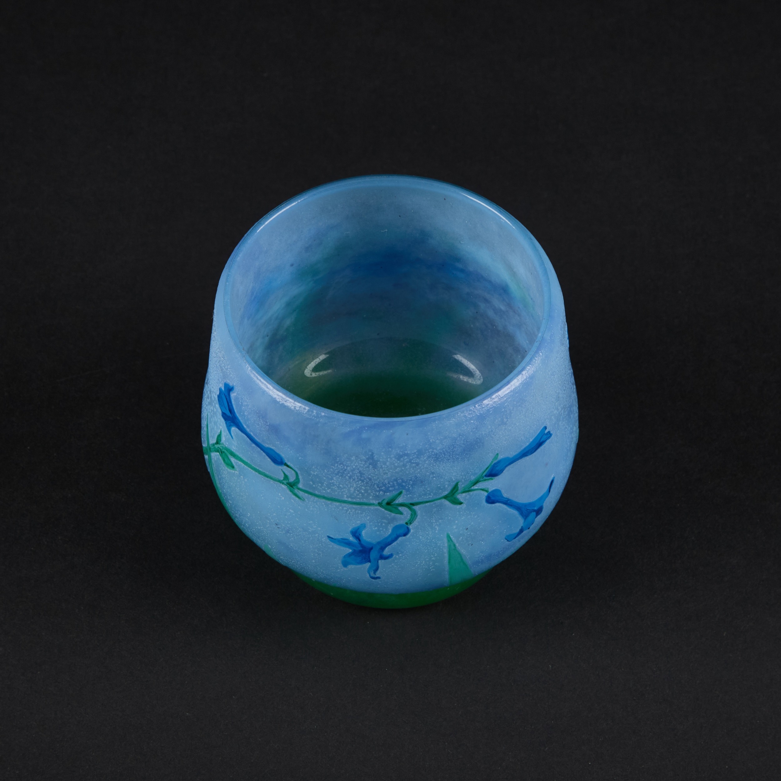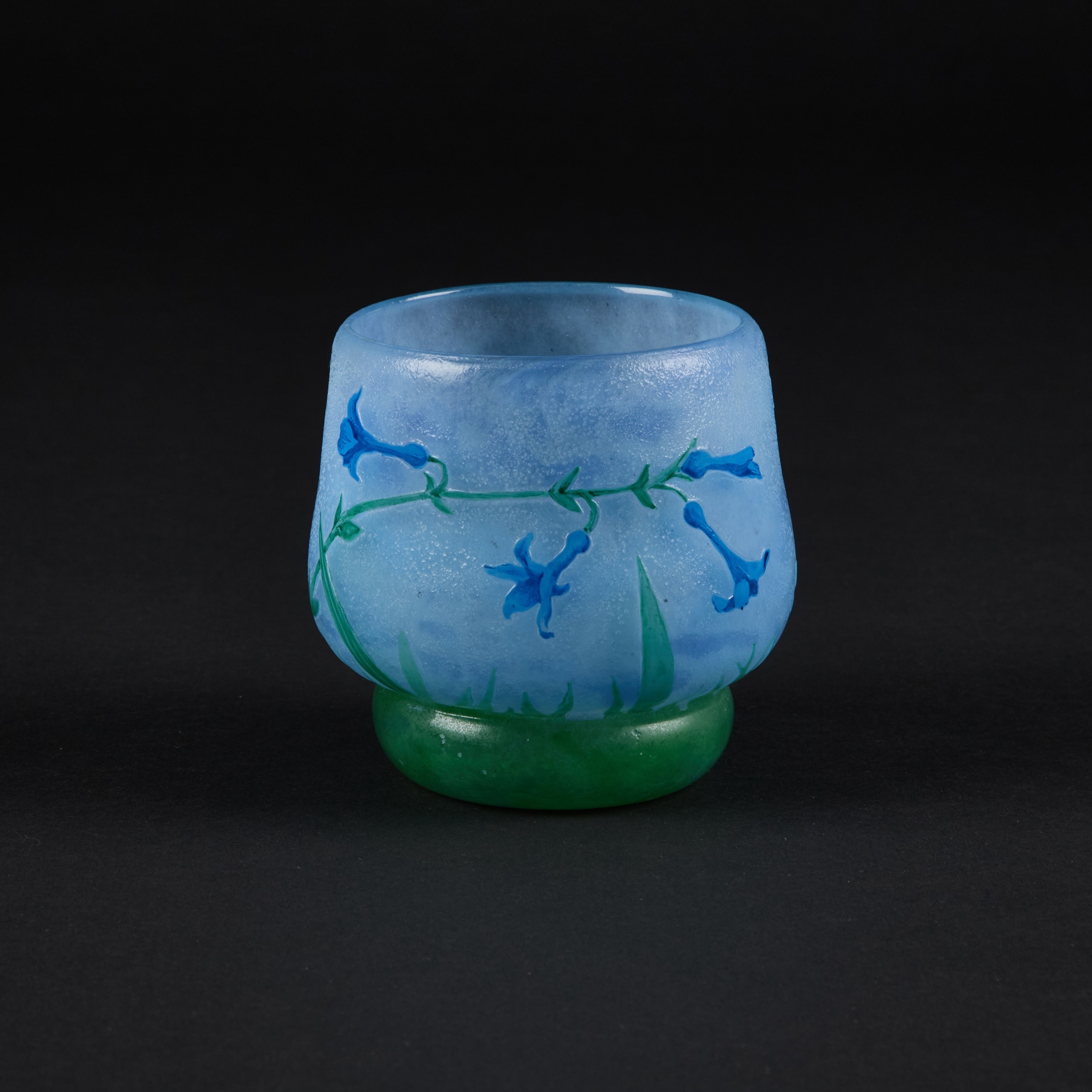 the circular body with tapering sides and a rounded recessed base, decorated with blue flowers on green stems against a pale blue ground, signed DAUM NANCY. 9cm high