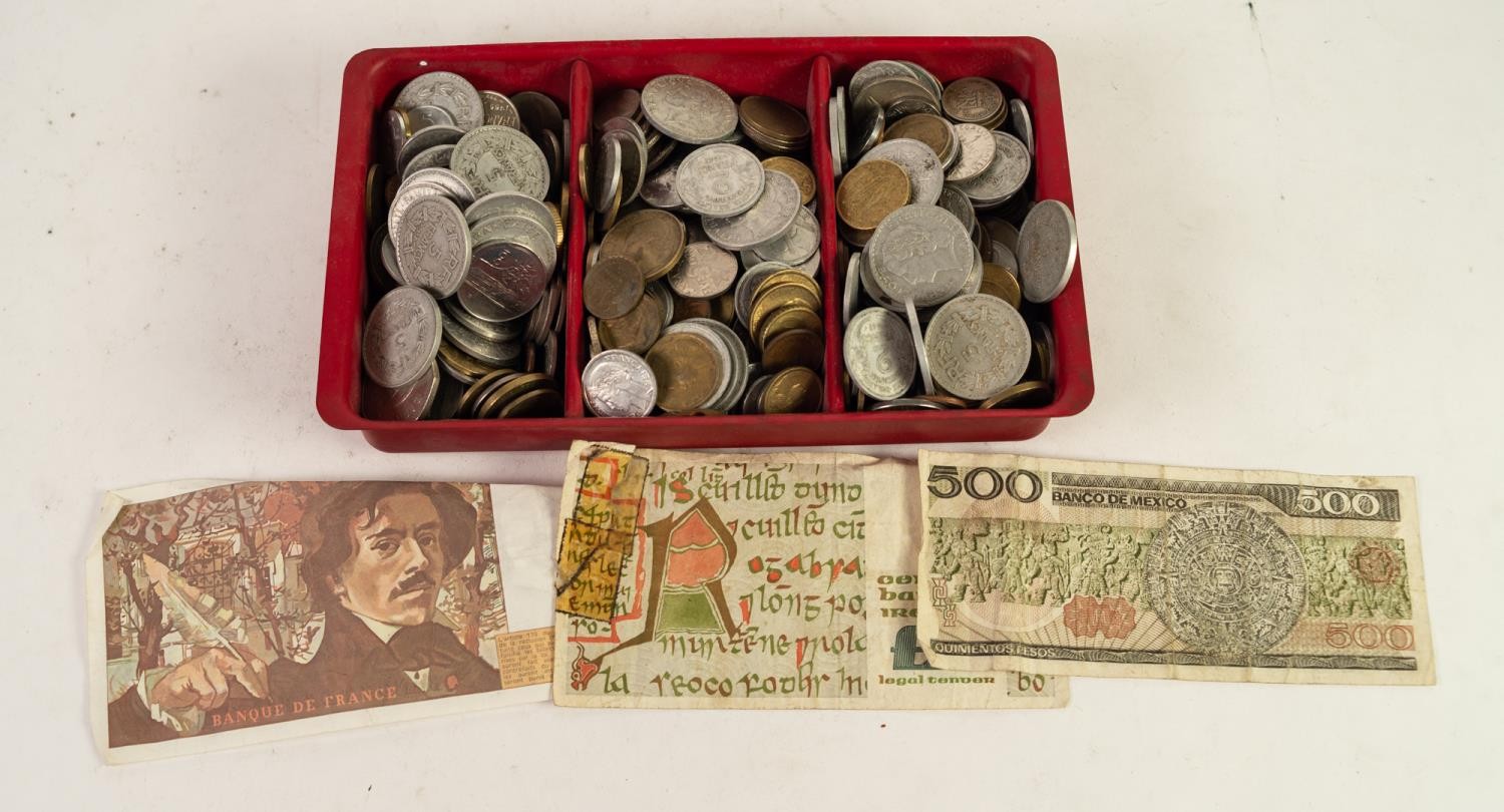 QUANTITY OF RELATIVELY MODERN WORLD COINAGE and 3 Mexico, France and Ireland BANK NOTES