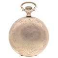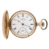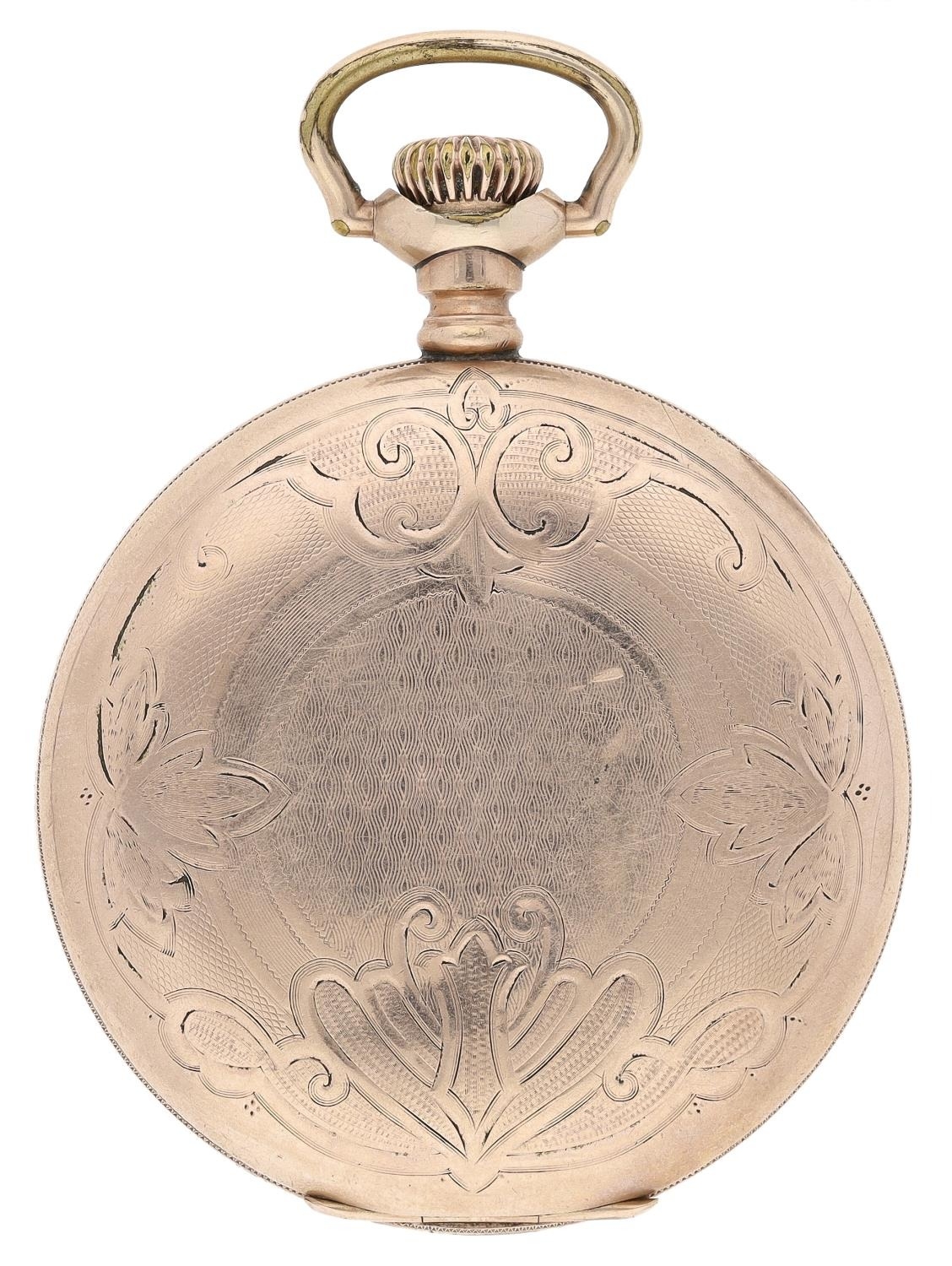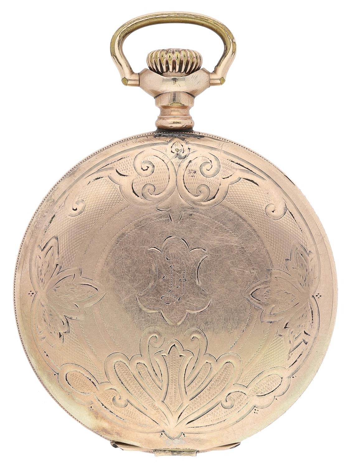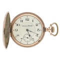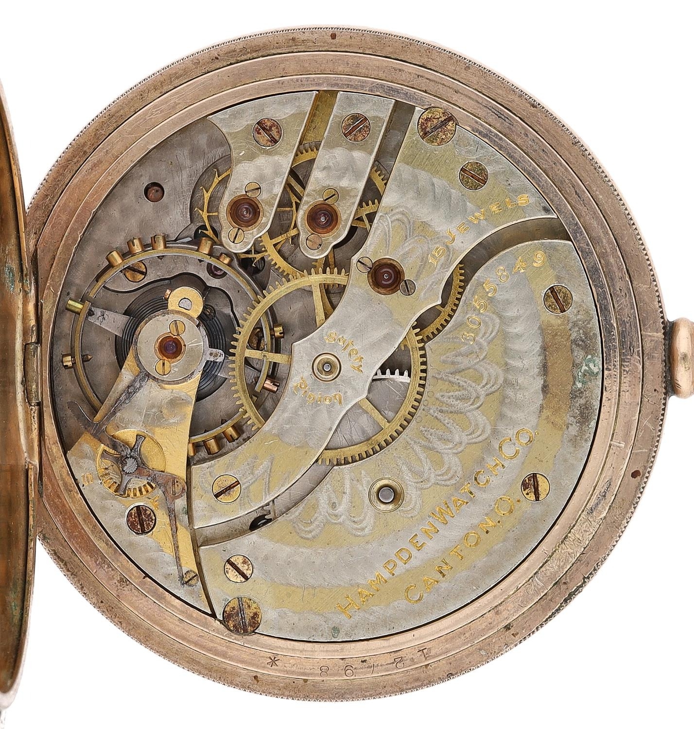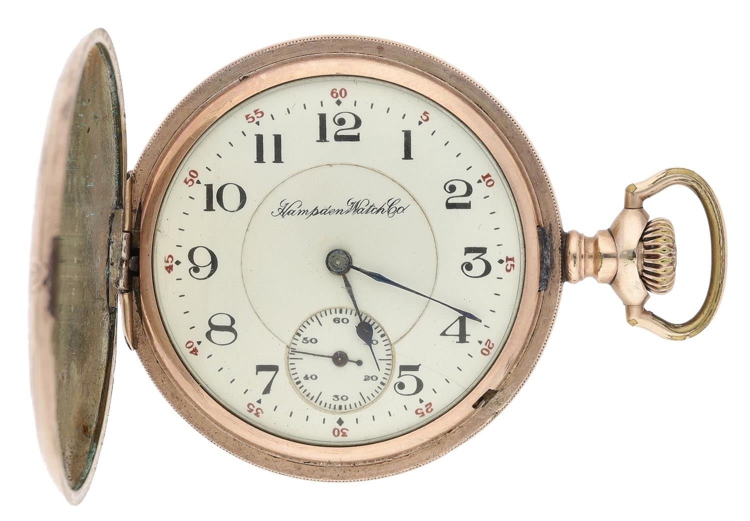 Hampden Watch Co. gold plated lever set hunter pocket watch, serial no. 3055849, circa 1915, signed 15 jewel movement with compensated balance and regulator, hinged cuvette, signed dial with Arabic numerals, minute markers with red five minute divisions and subsidiary seconds, blued steel hands, within a Dueber engraved and engine turned case, 51mm