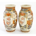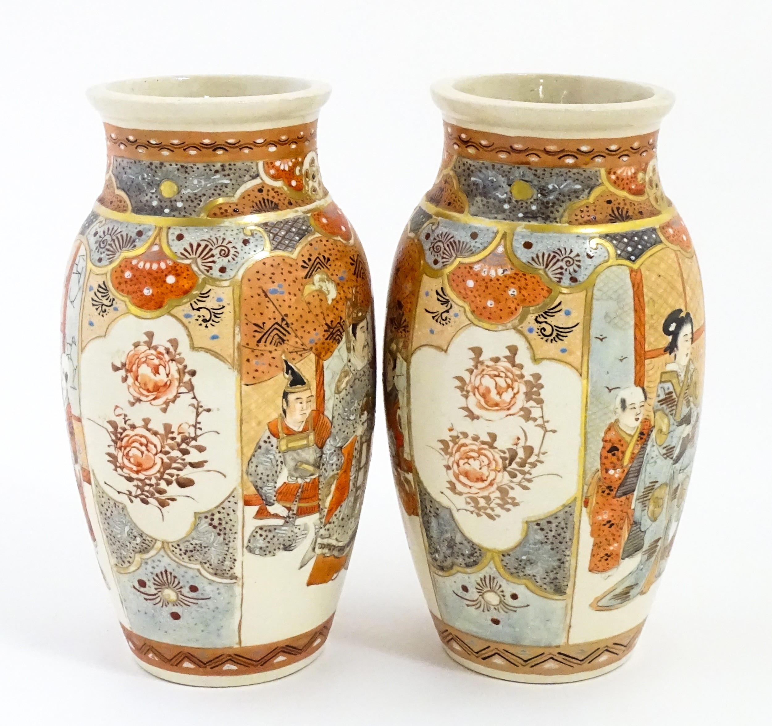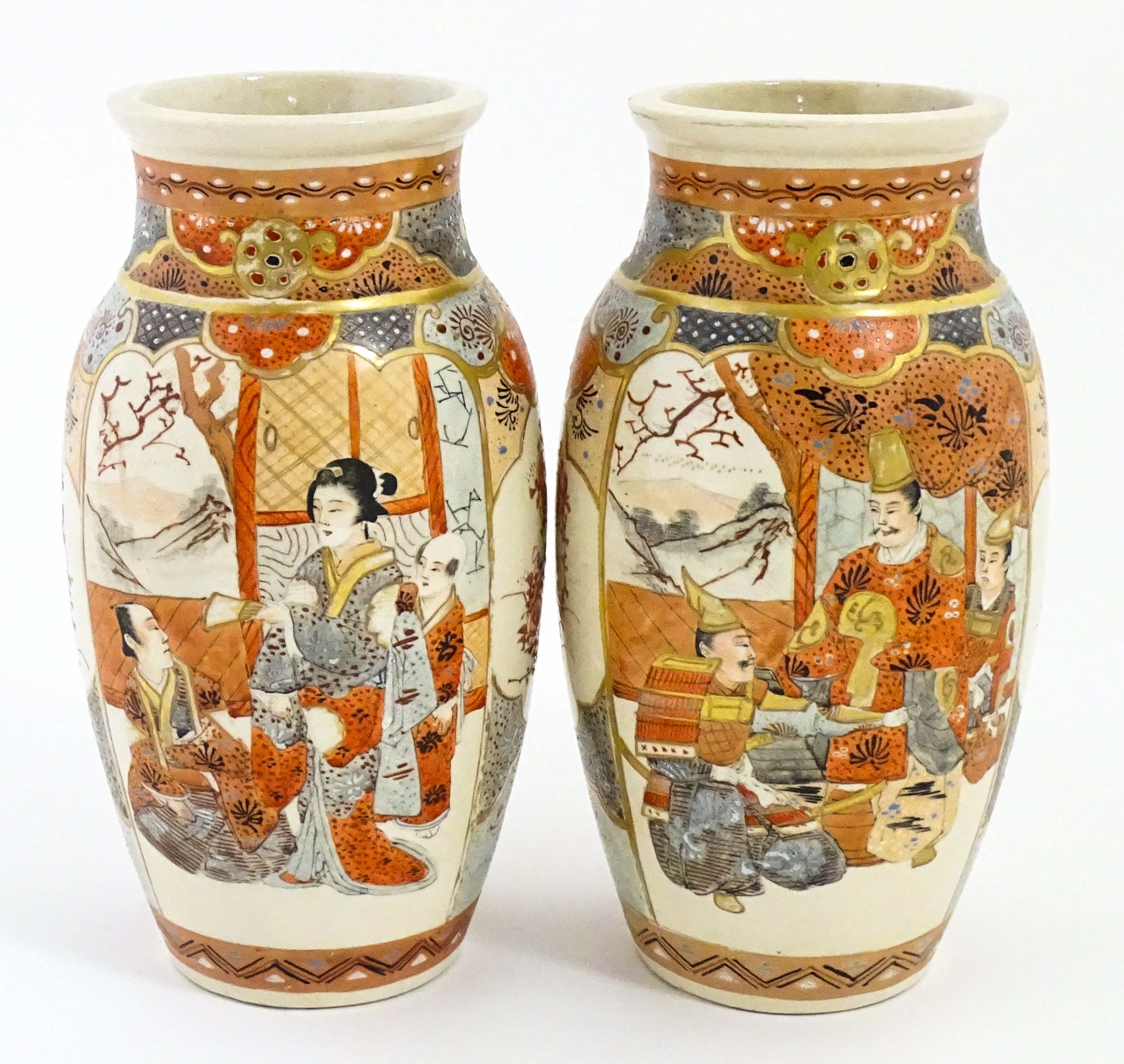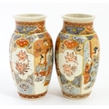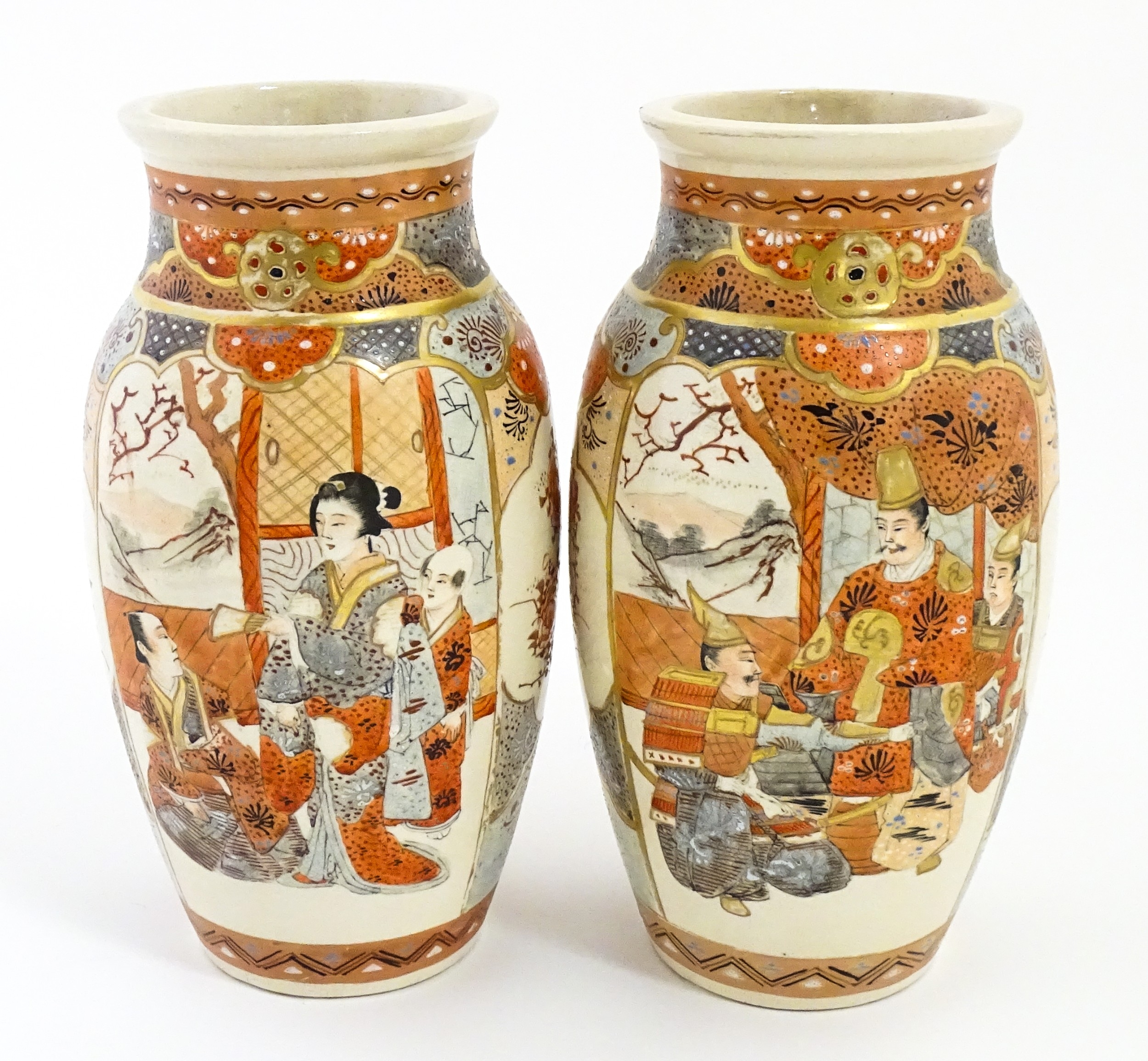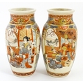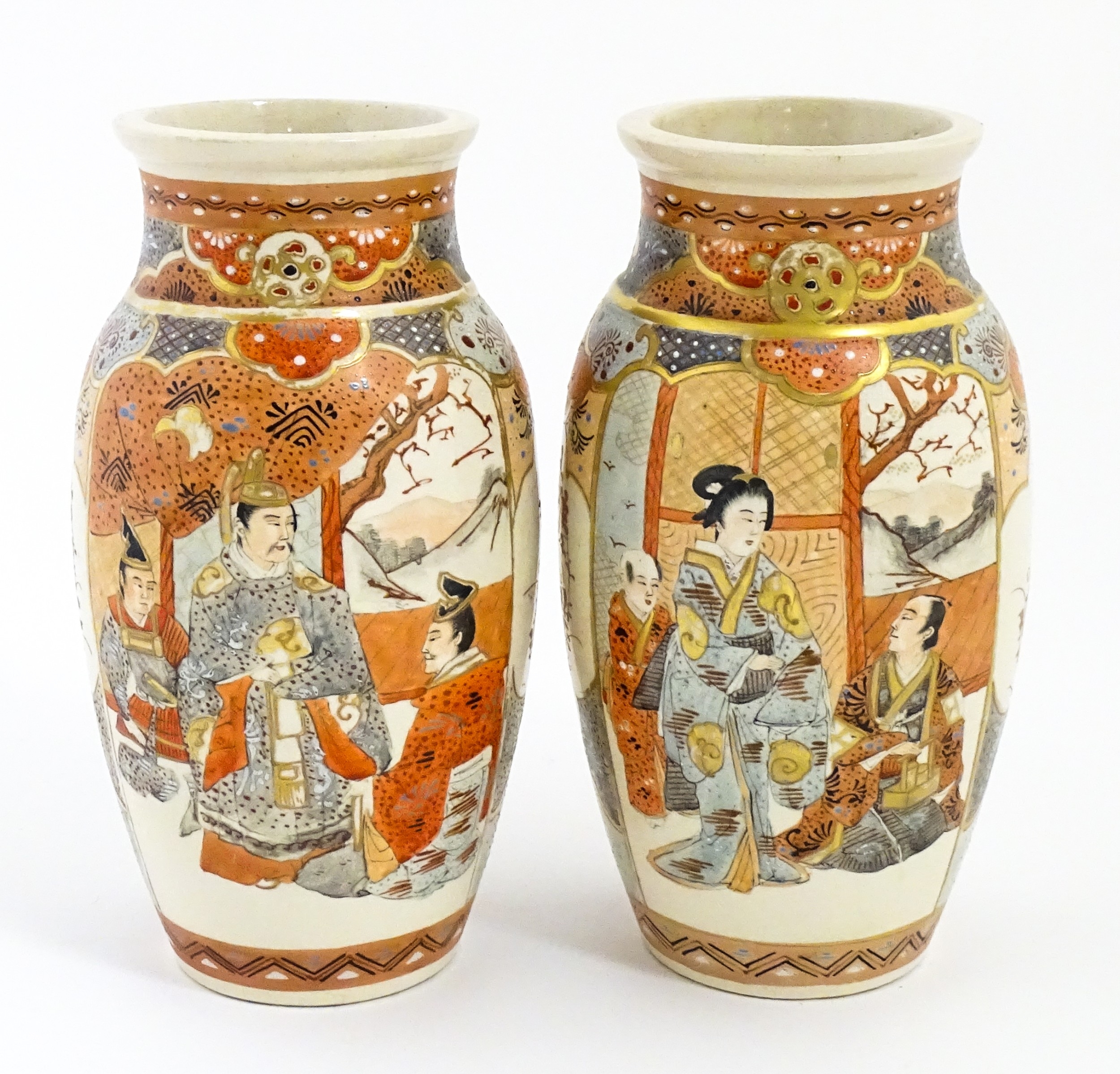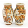 A pair of Japanese Satsuma vases decorated with an Imperial figure and attendants, and a female figure with attendants. Marked under. Approx. 9" high (2)