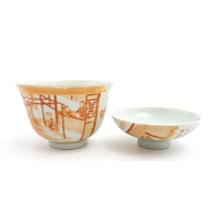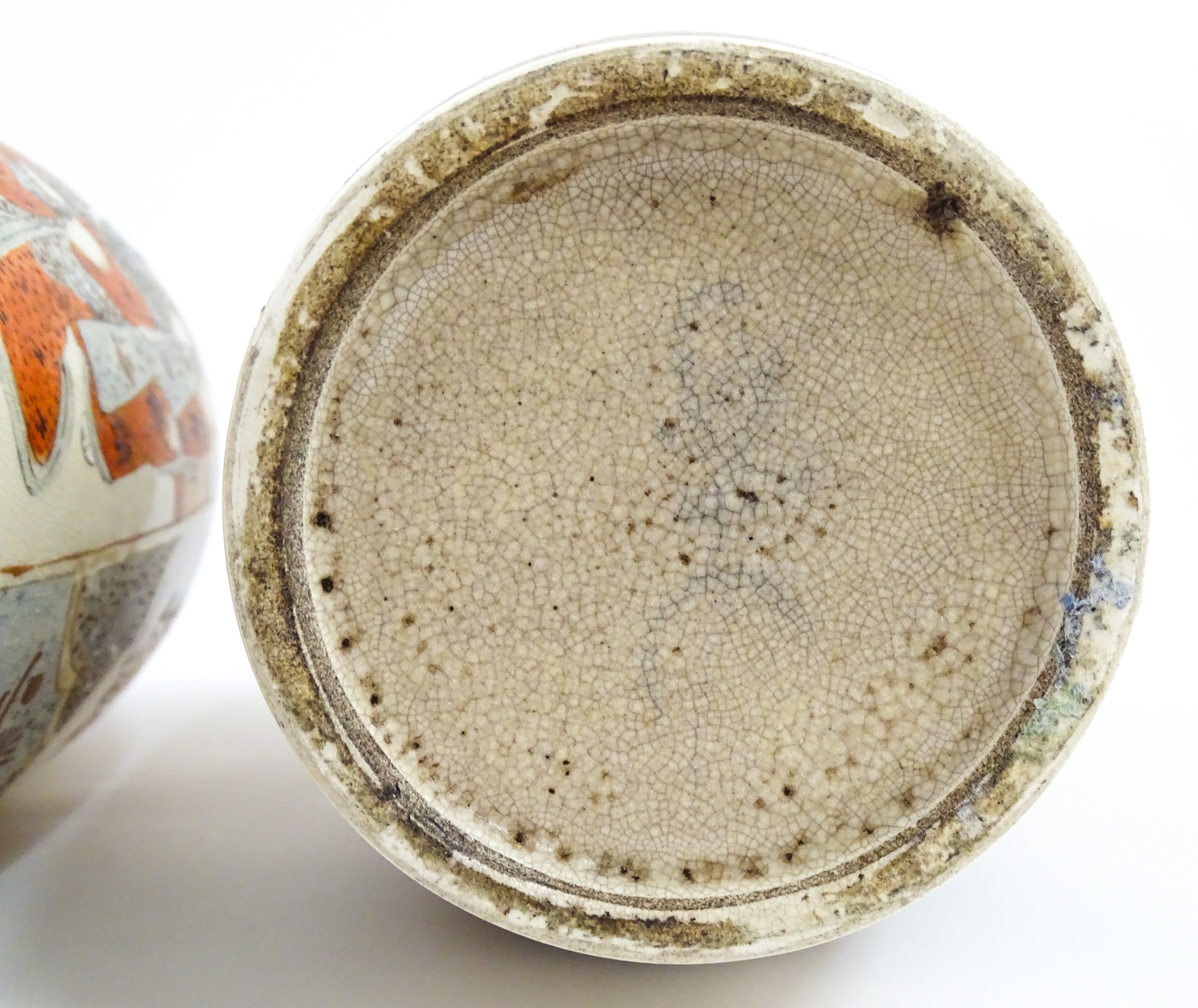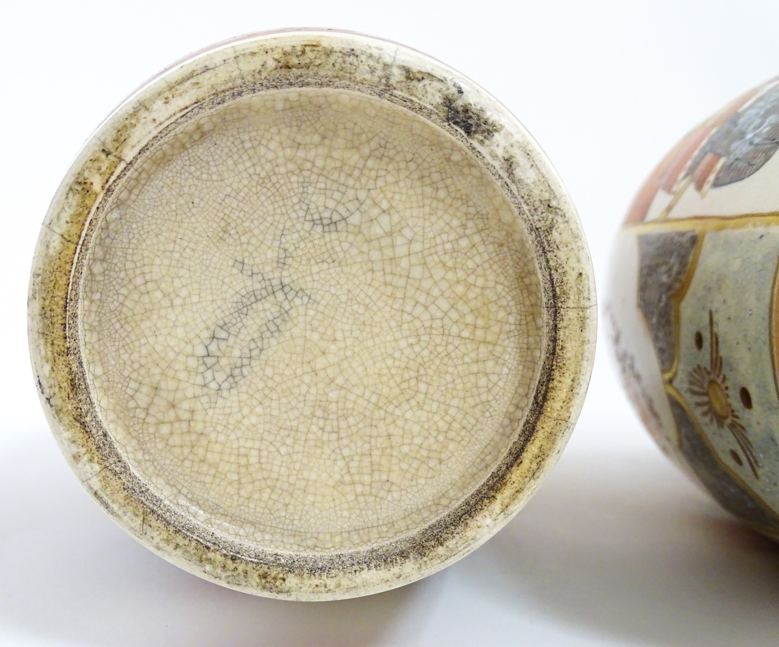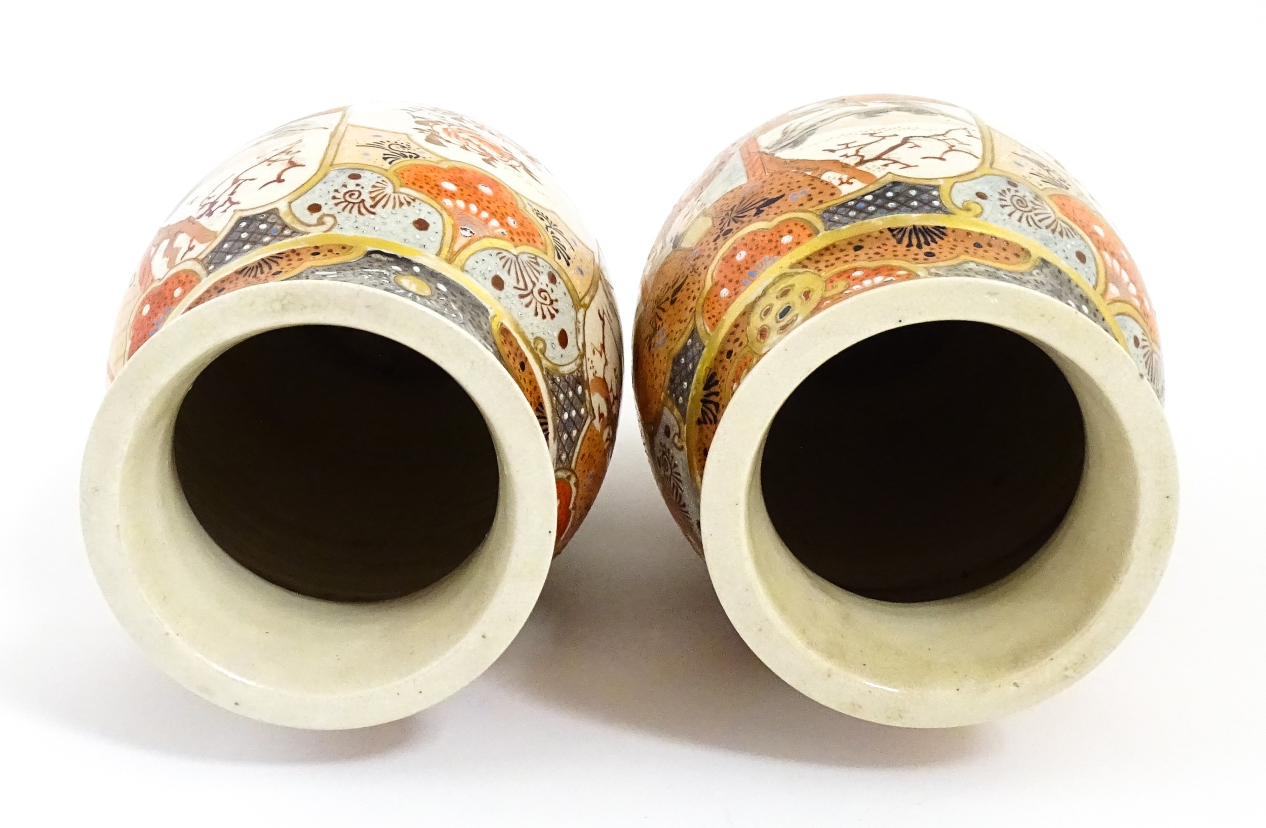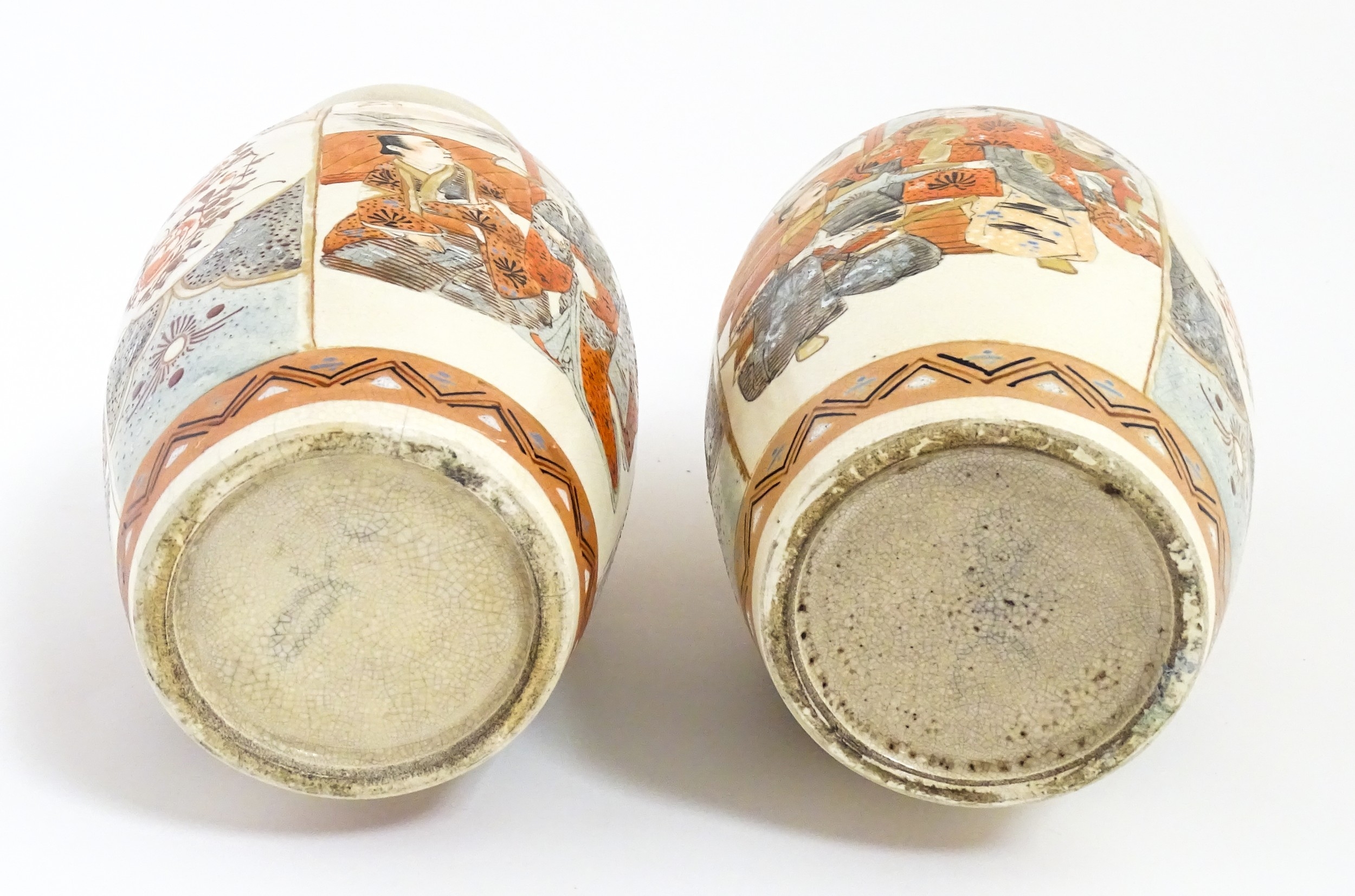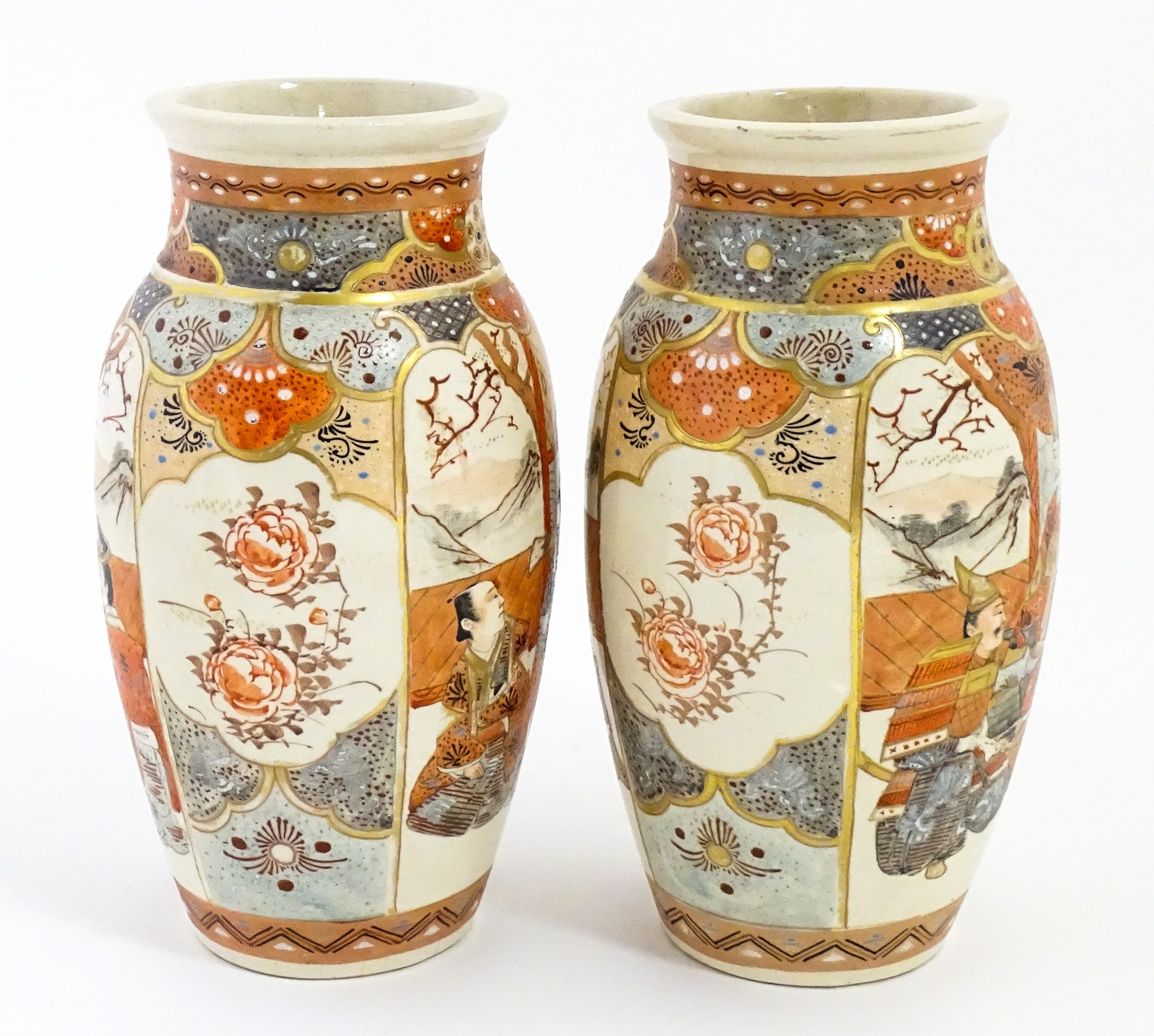 A pair of Japanese Satsuma vases decorated with an Imperial figure and attendants, and a female figure with attendants. Marked under. Approx. 9" high (2)