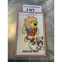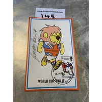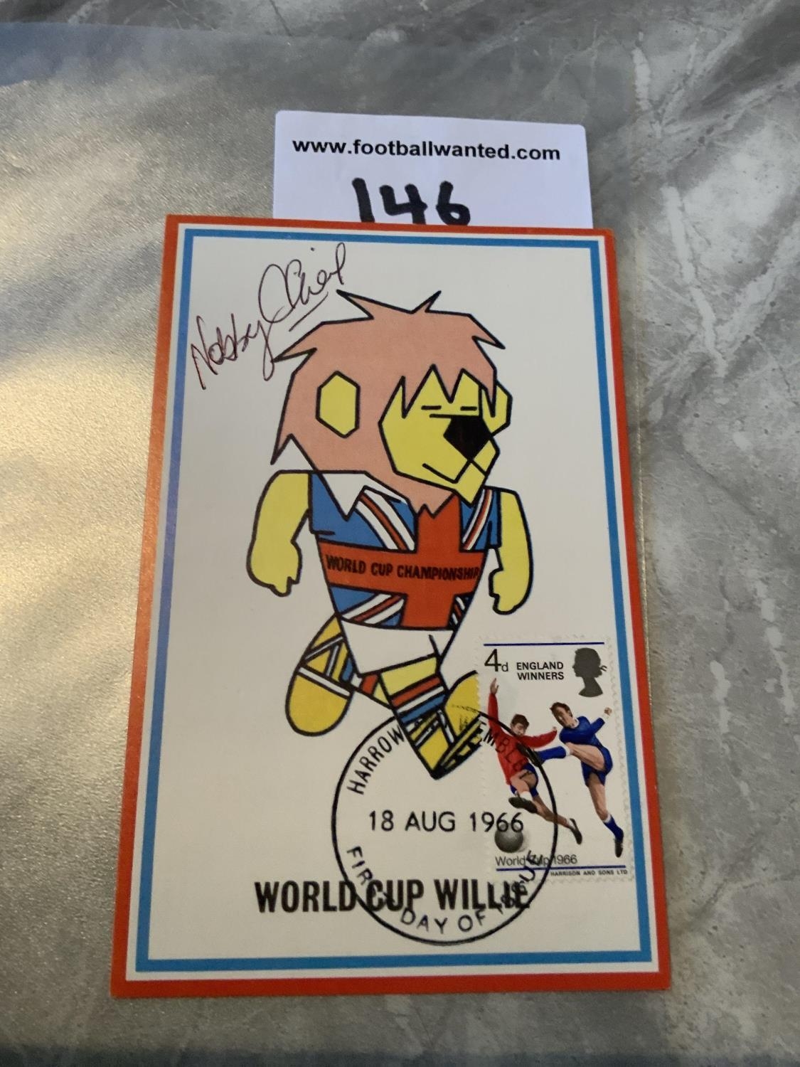Nobby Stiles 1966 Signed World Cup Willie Postcard: Original 55 year old postcard with 4d England Winners stamp, hand stamped Wembley 18 8 1966 the day of issue of the stamp. Signed clearly to the front in biro.