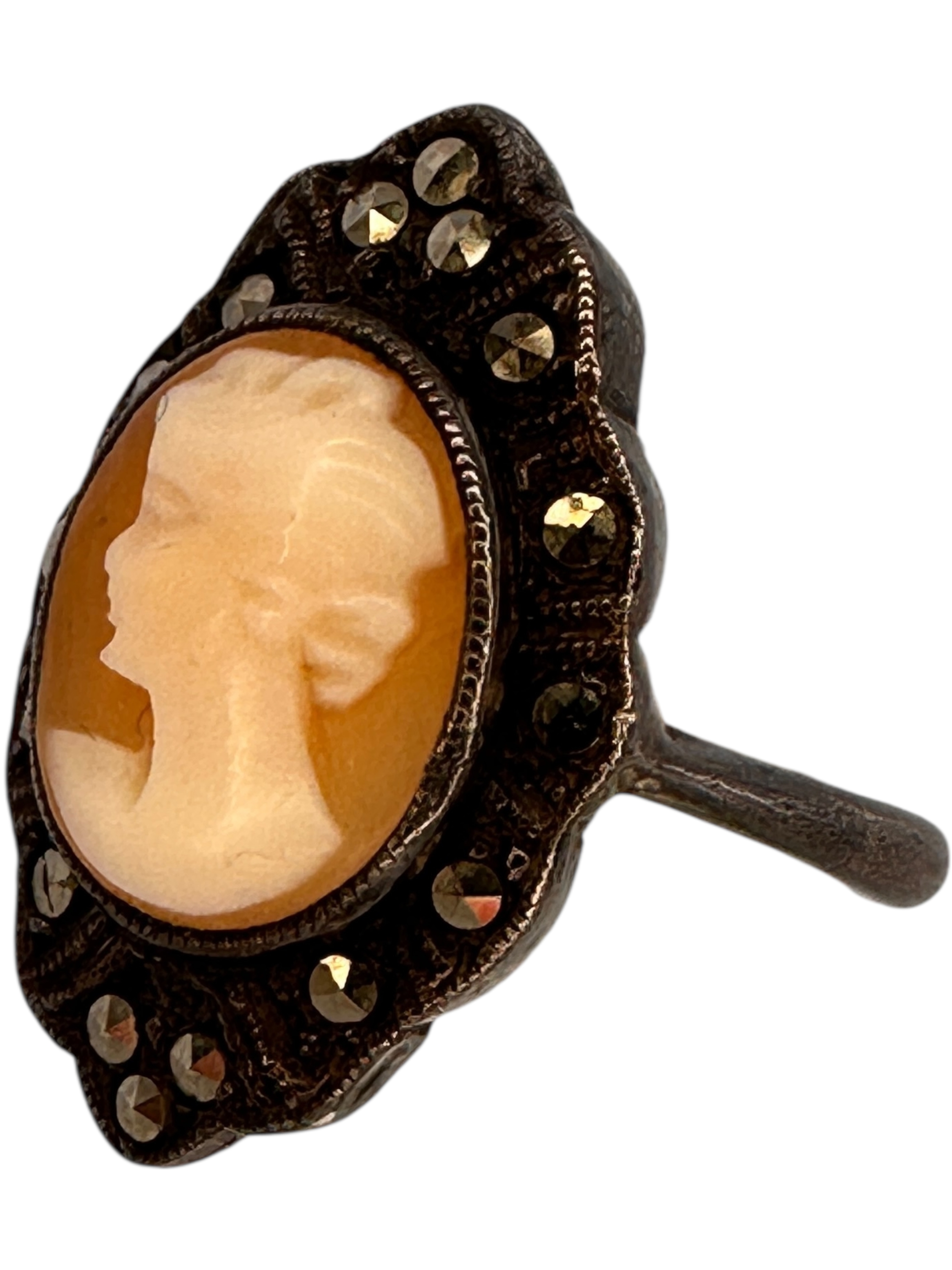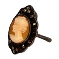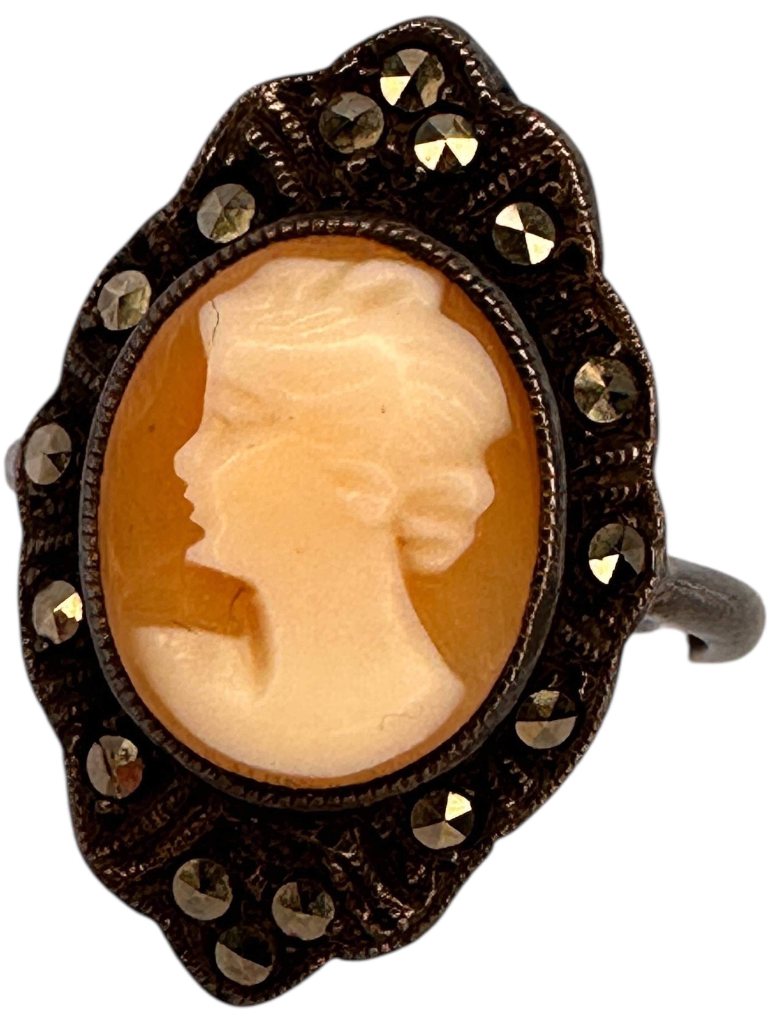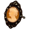 Silver and Marcasite Cameo Ring, size L. Rubbed Marks.