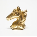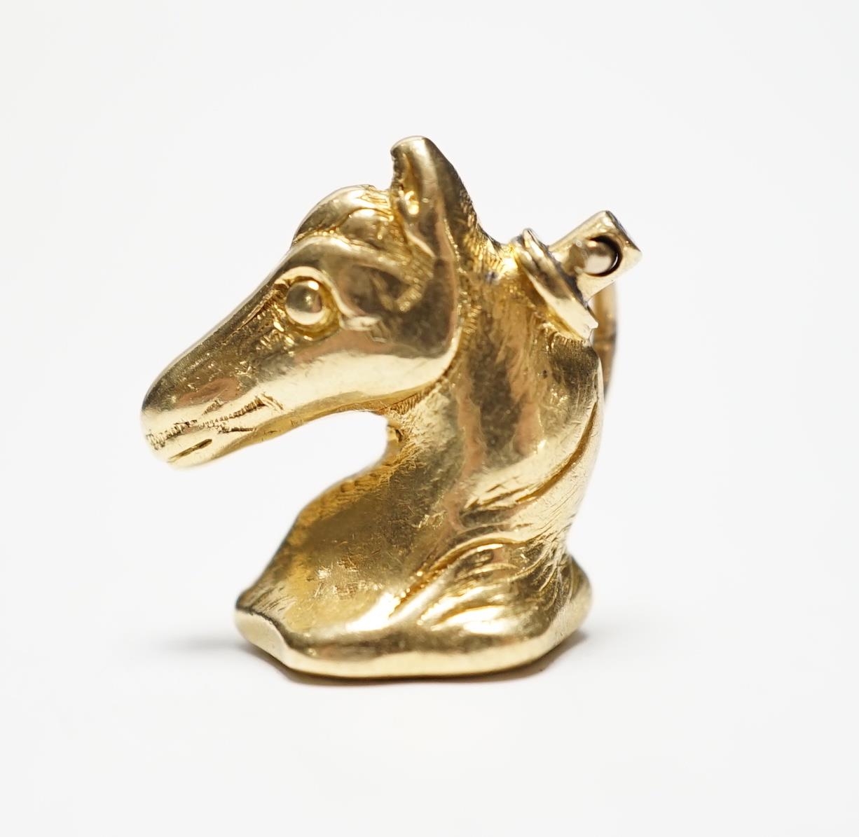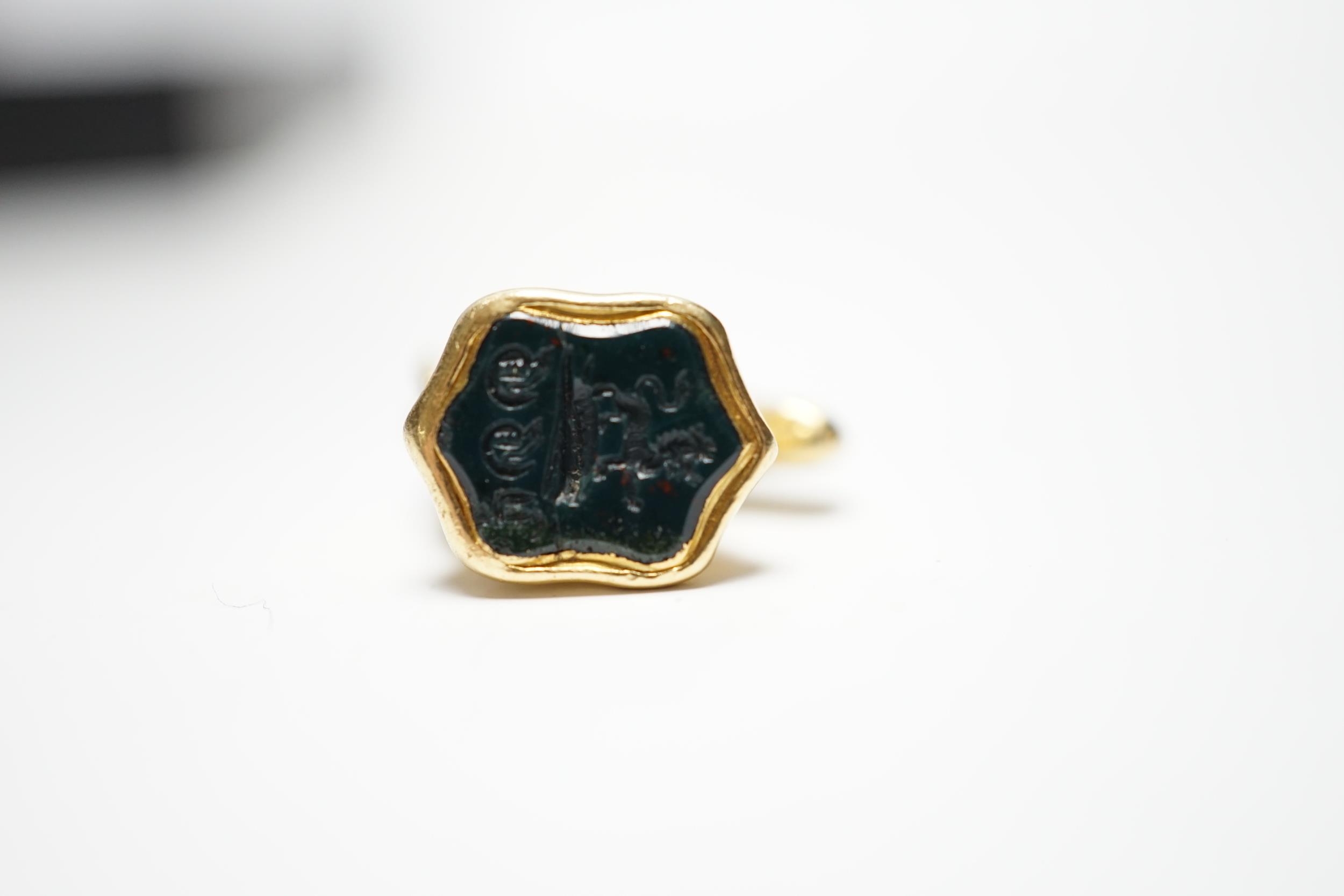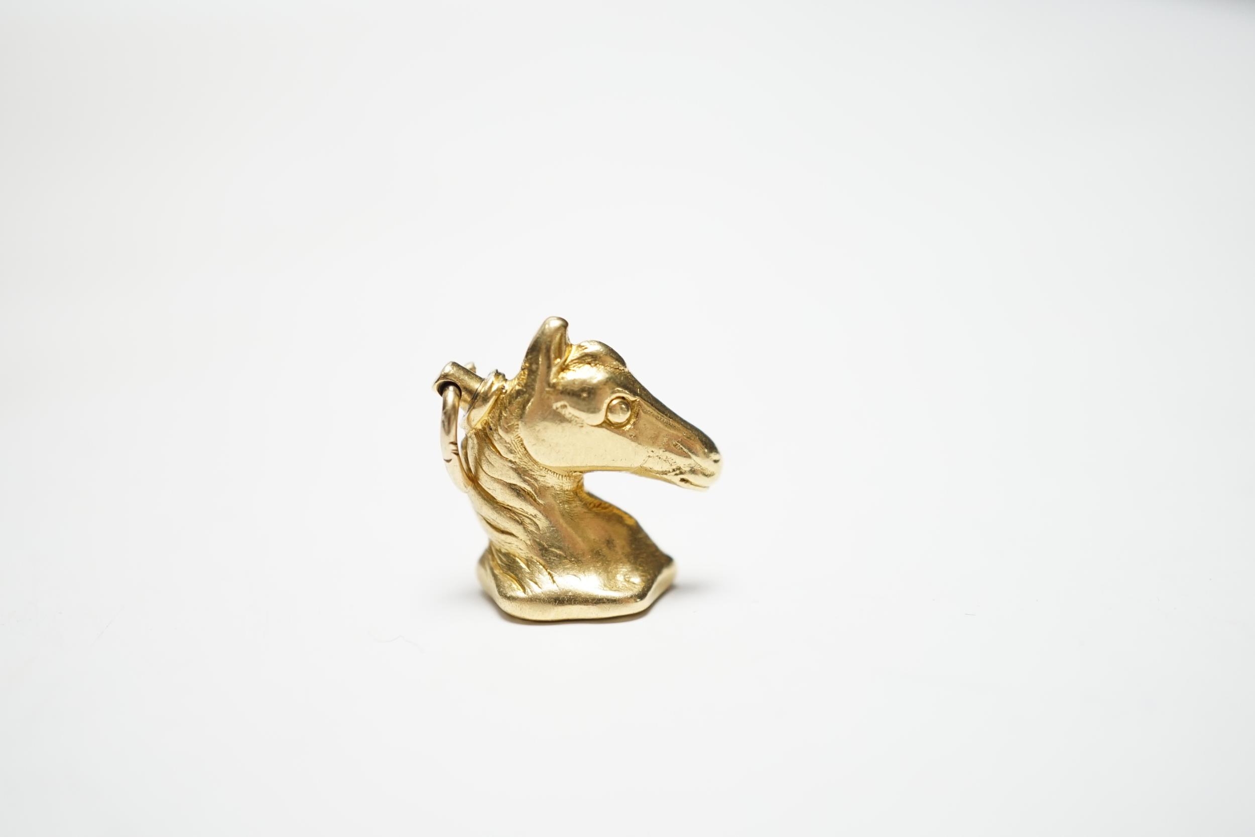 A 19th century yellow metal and bloodstone inset horse's head seal, the matrix carved with crest, 18mm.