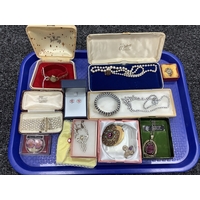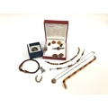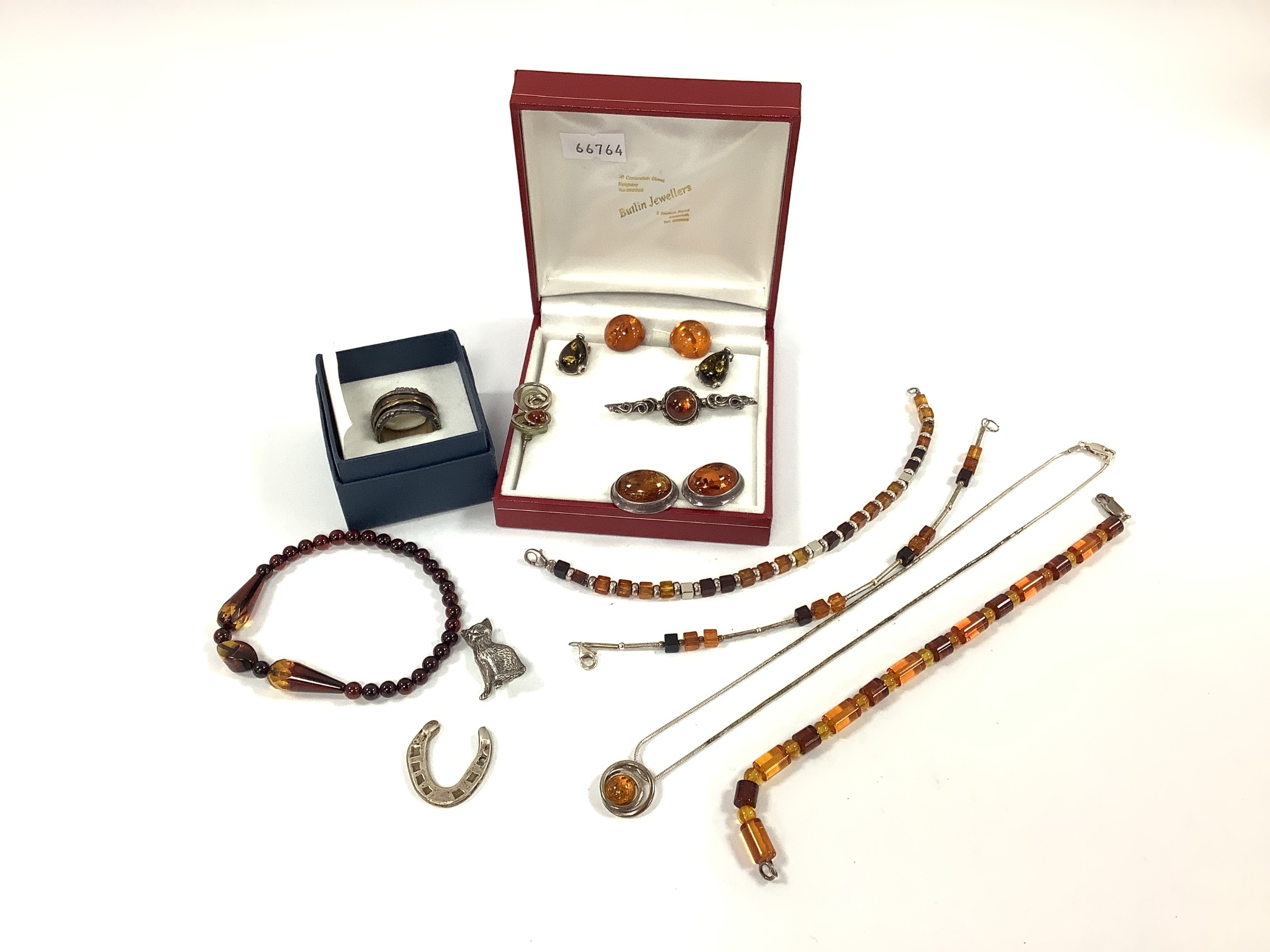 A Collection of Amber Coloured "925" and other Jewellery, including cabochon earstuds, a bar brooch, pendant on chain, bead bracelets, a modern style ring, together with a hallmarked silver horseshoe "GOOD LUCK" token, and a seated cat brooch, stamped "925".