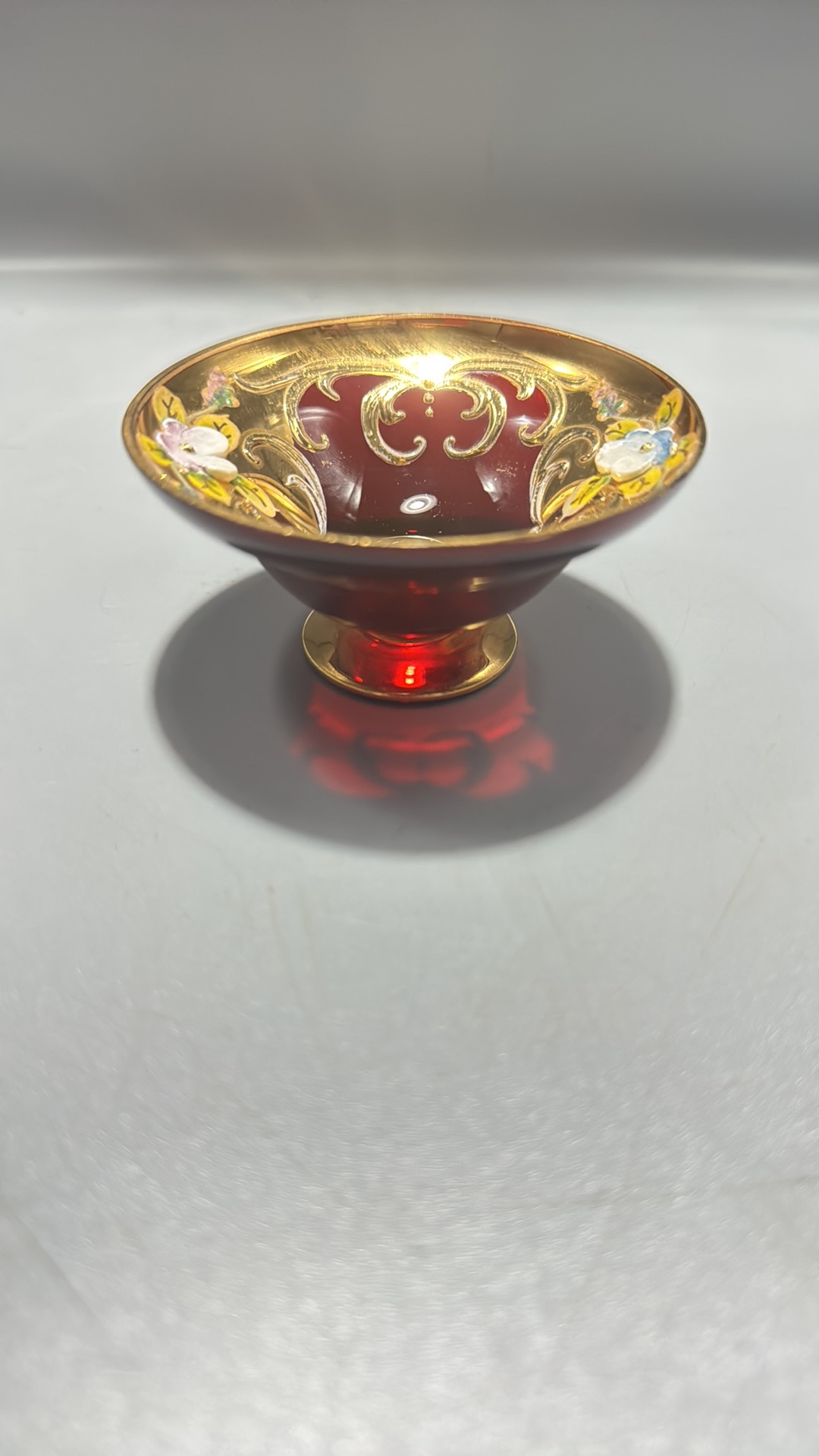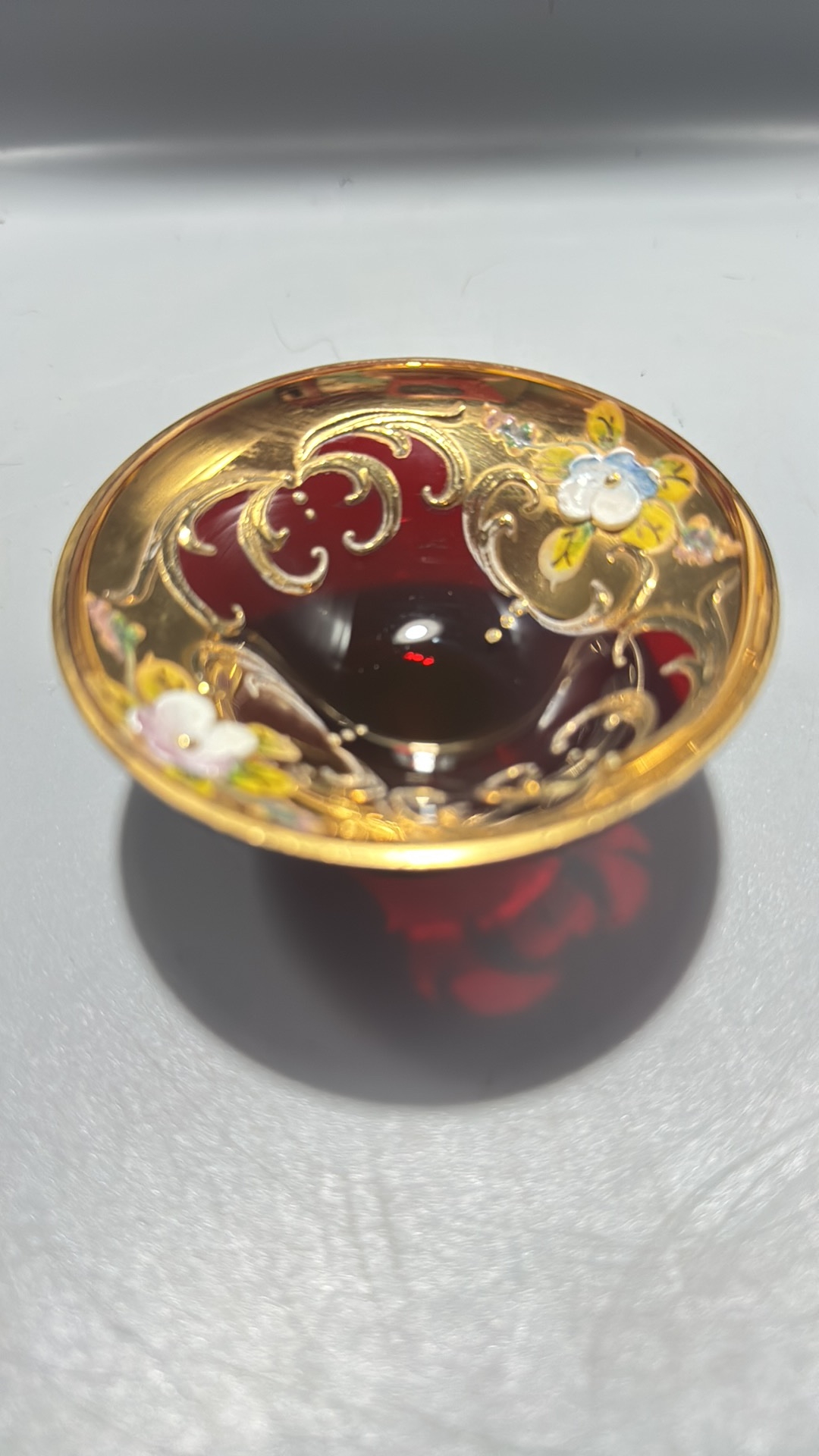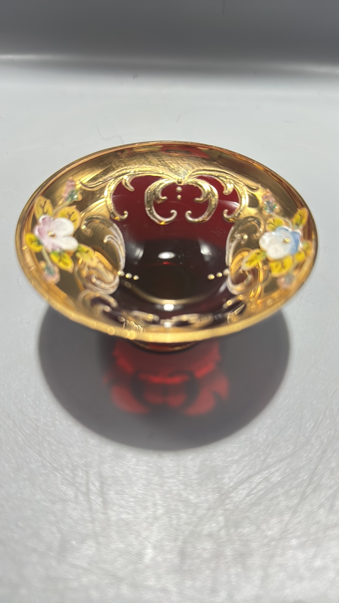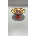 Ruby red Italian glass miniature pedestal bowl, richly gilt with scrollwork and applied polychrome enamel floral motifs.