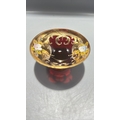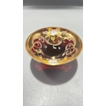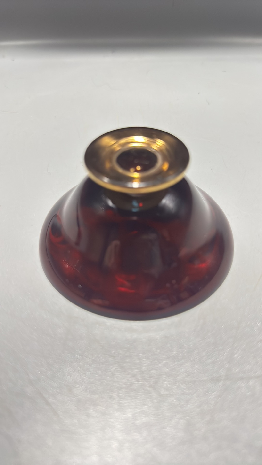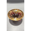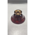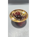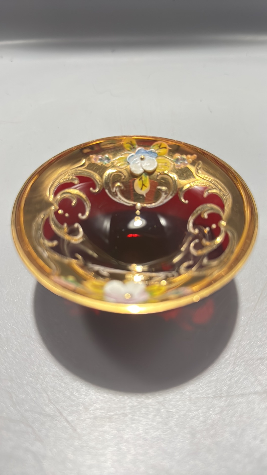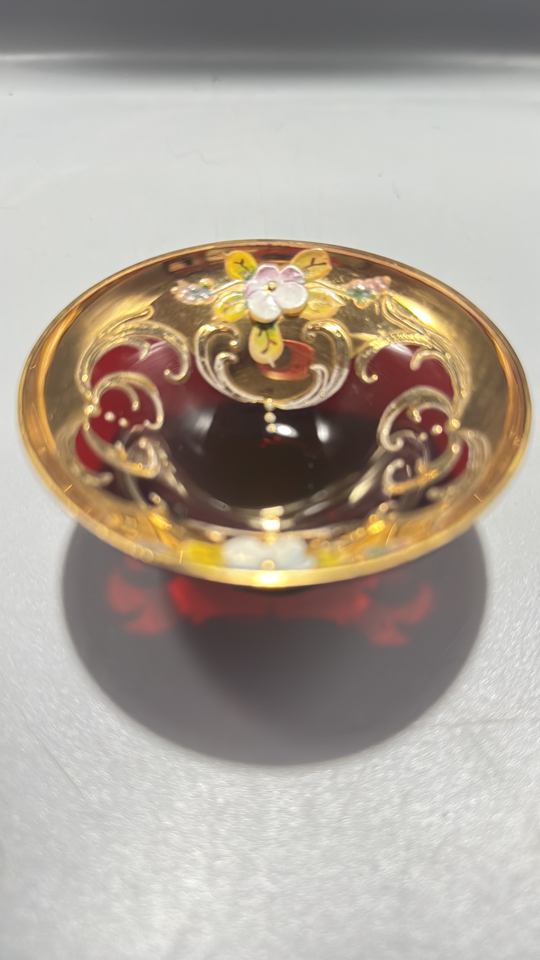 Ruby red Italian glass miniature pedestal bowl, richly gilt with scrollwork and applied polychrome enamel floral motifs.