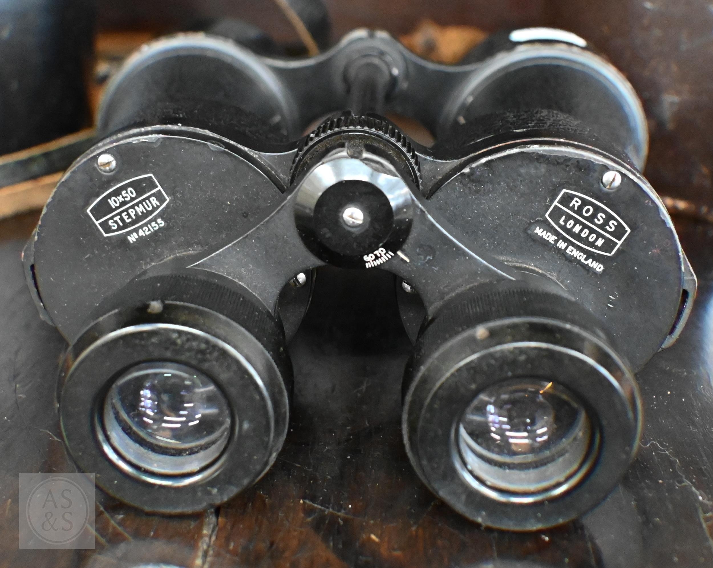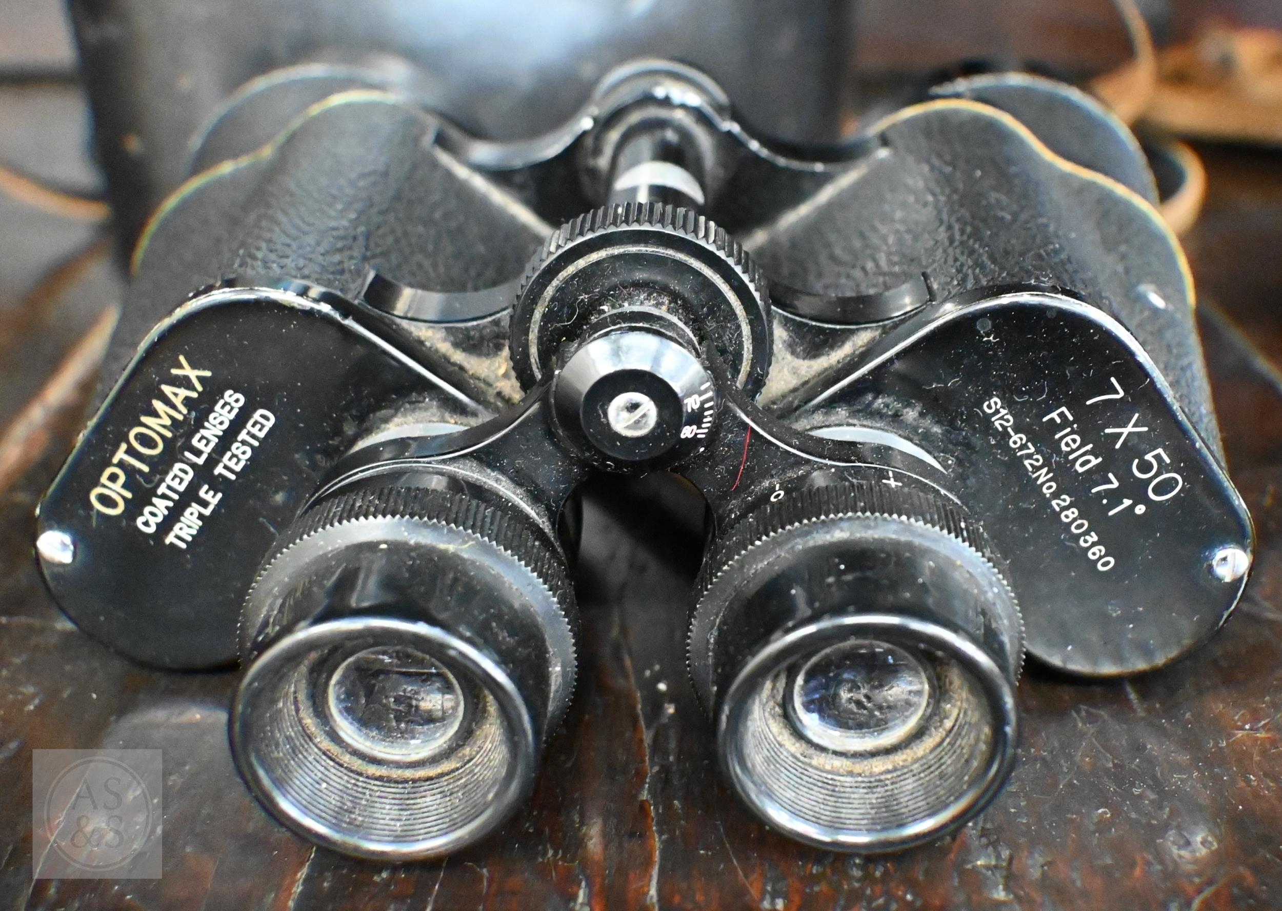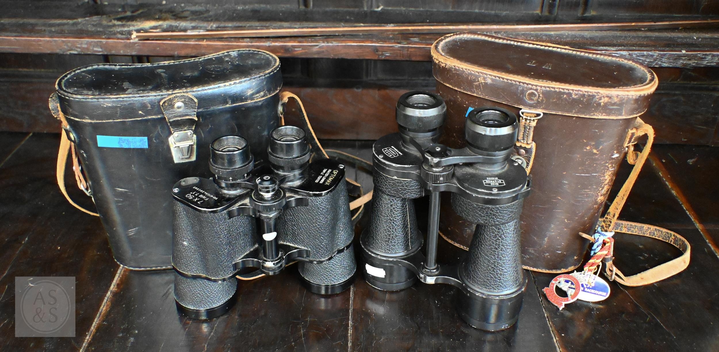#A vintage pair of Ross (London) 10 x 50 Stepmur binoculars no. 42155, to/w a pair of Optomax (Japan) 7 x 50 binoculars (2 - both with leather cases)