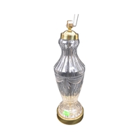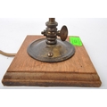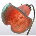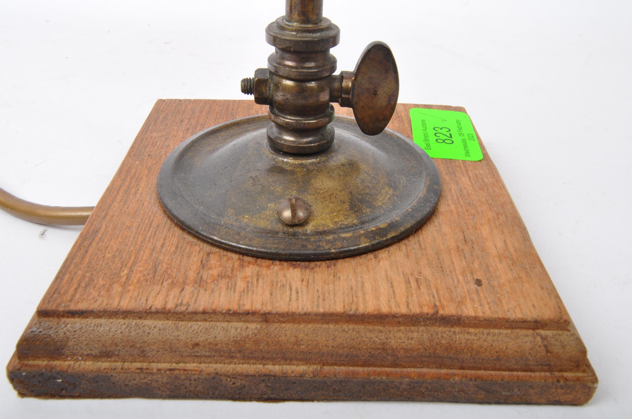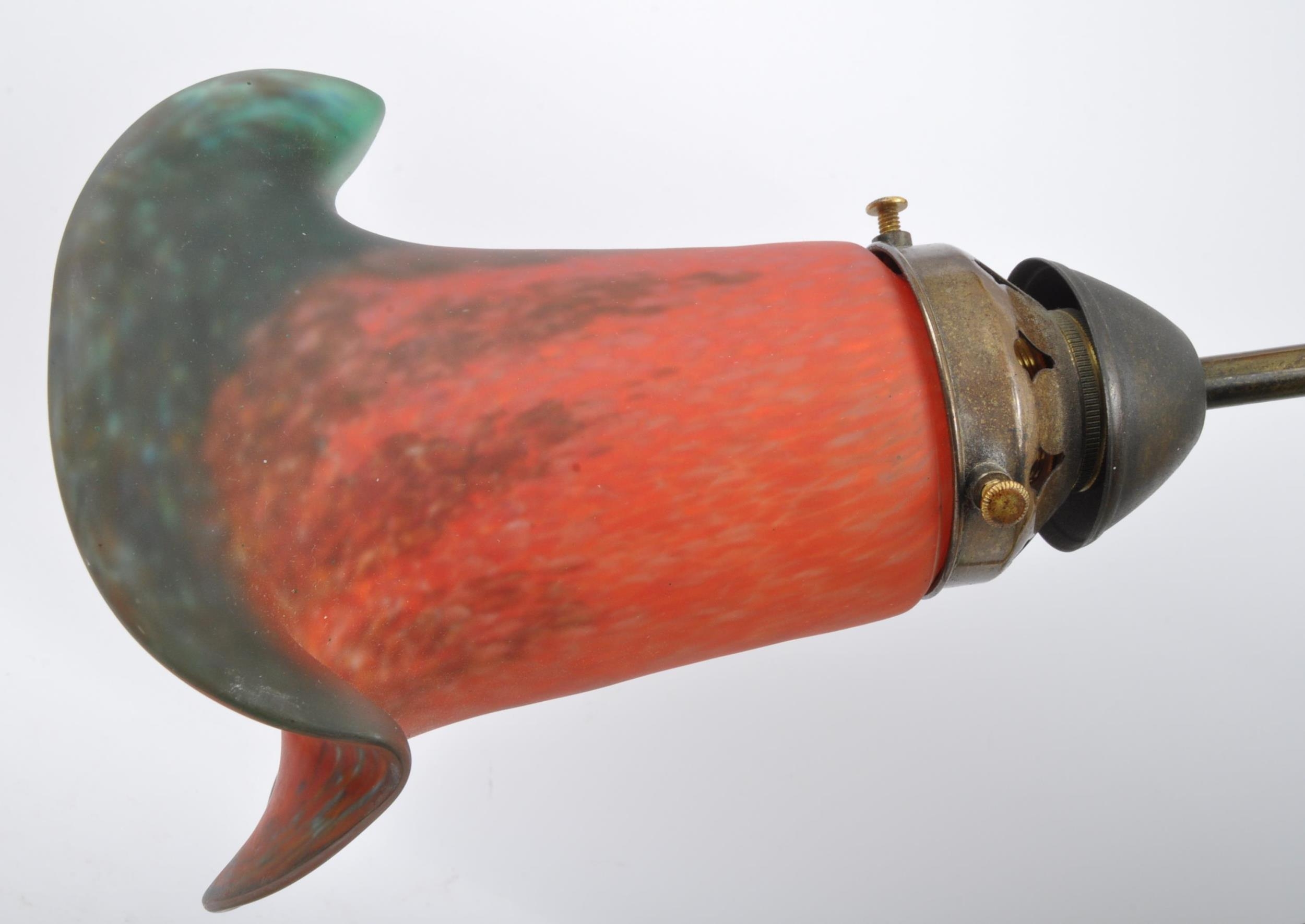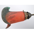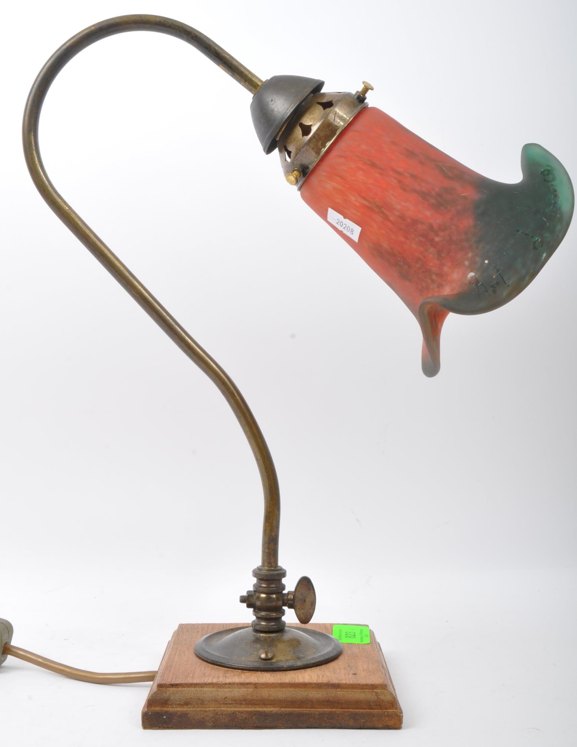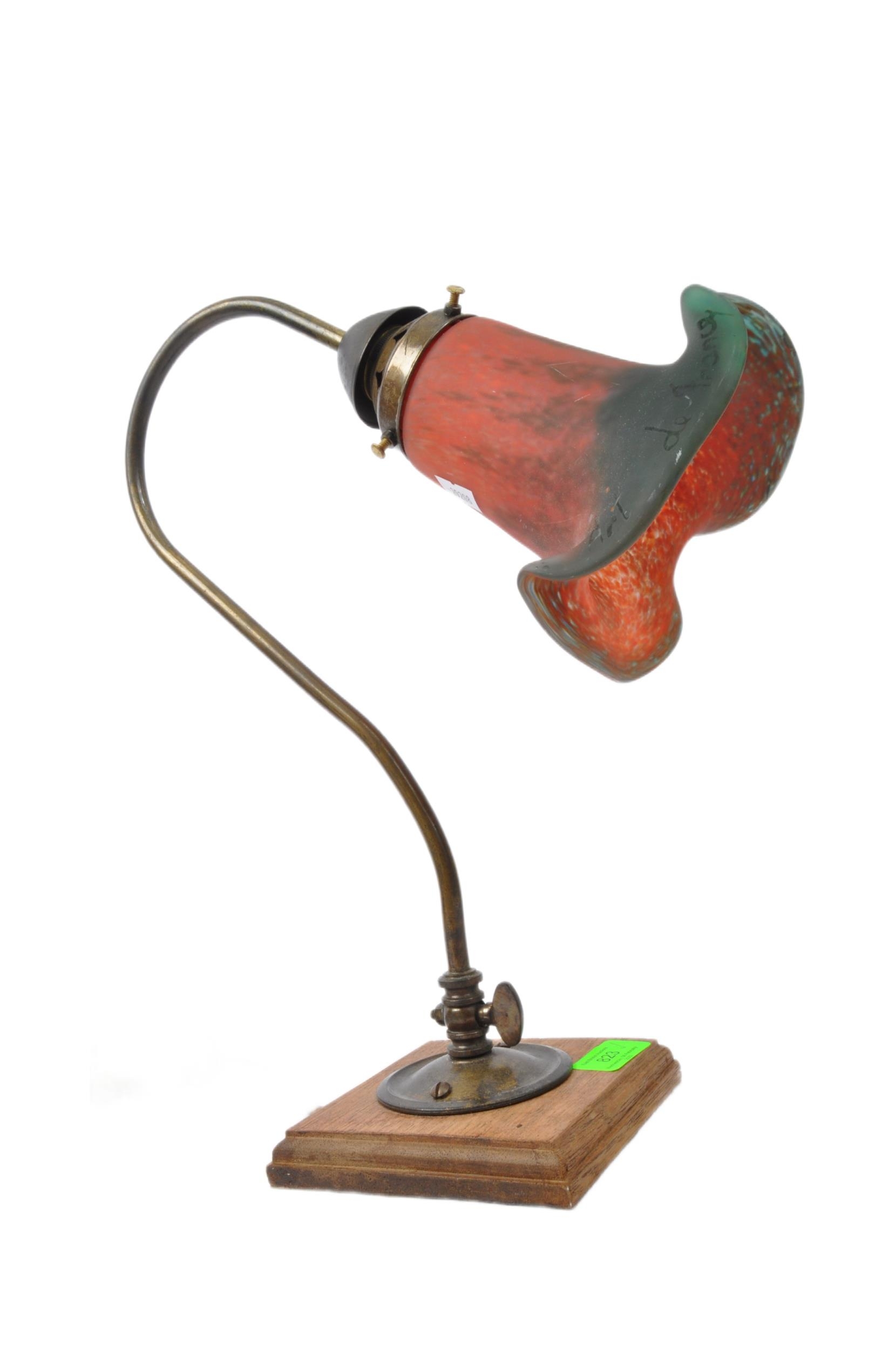 An early 20th Century French Art Nouveau glass table lamp light. Having a brass metal arm with painted glass shade on a wooden mount. Signed to the shade. Measures approx. 38cm tall.