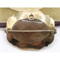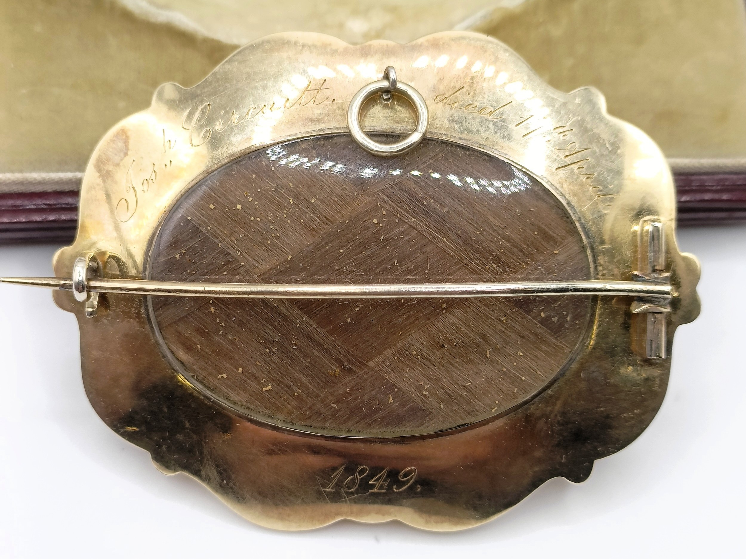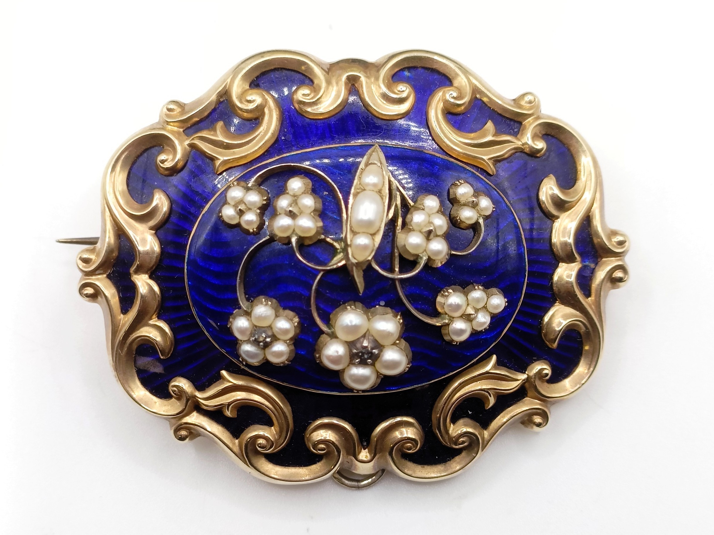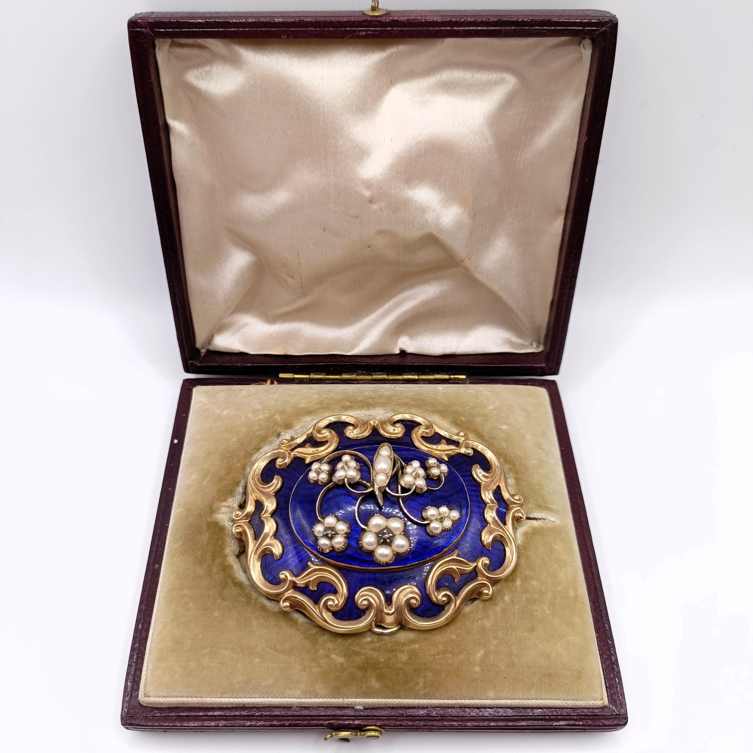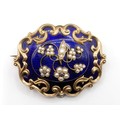 A Victorian yellow coloured metal, blue enamel and seed pearl memorial brooch, 6 cm wide, inset with a lock of hair, engraved verso, dated 1849, cased