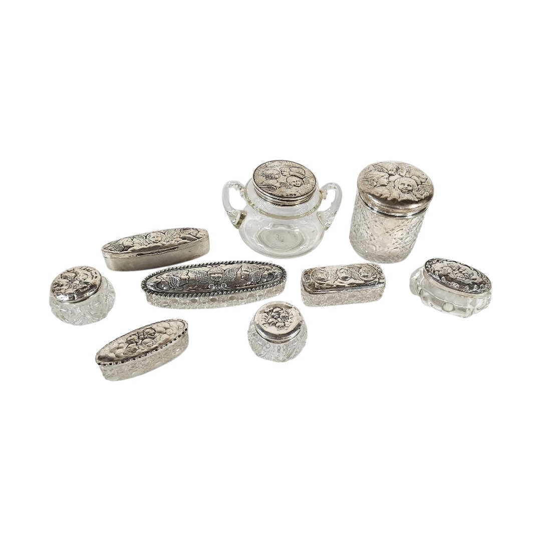 A COLLECTION OF EARLY 20TH CENTURY SILVER ‘REYNOLDS ANGELS’ AND CUT GLASS TRINKET BOXES
