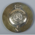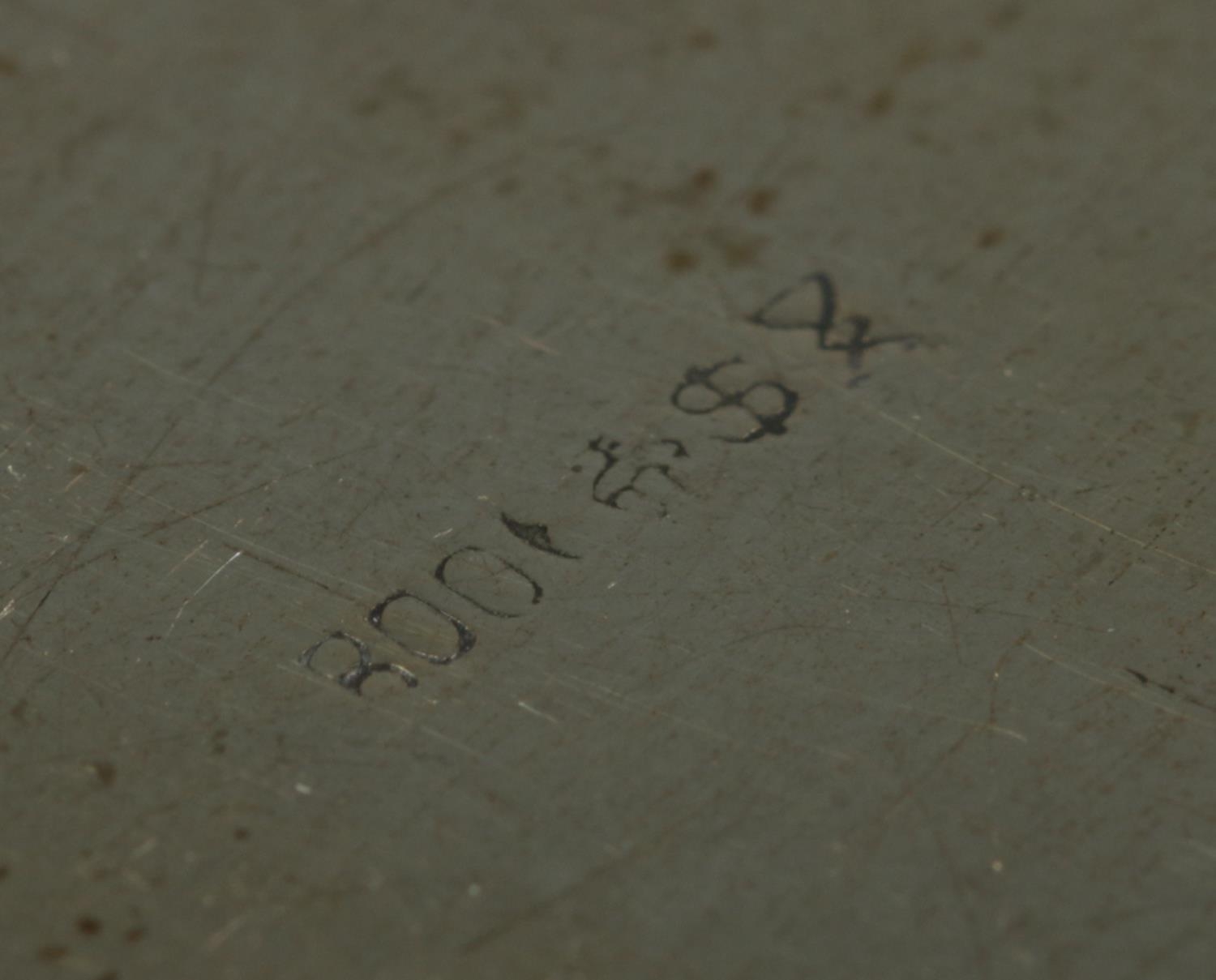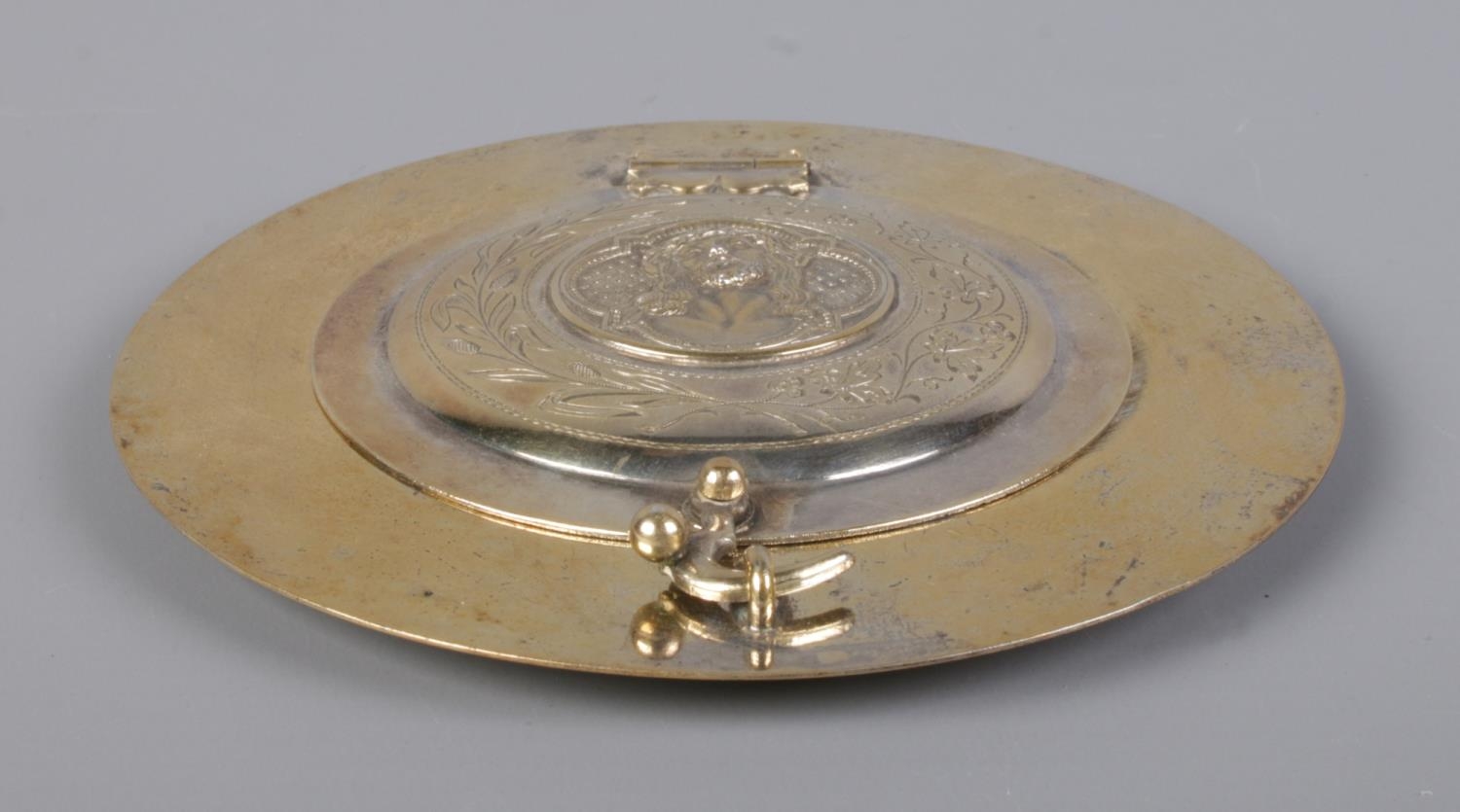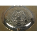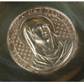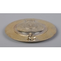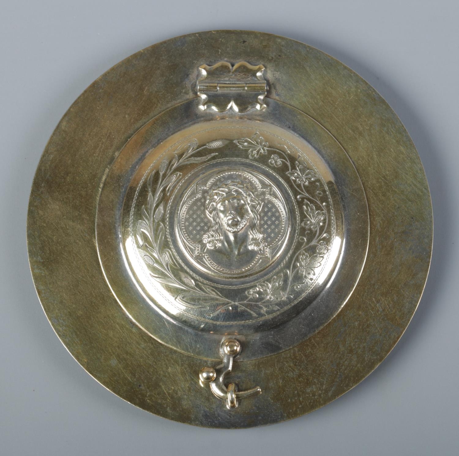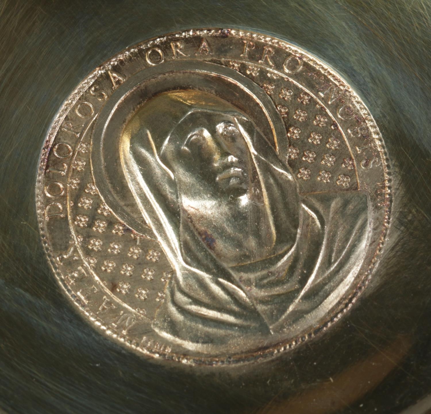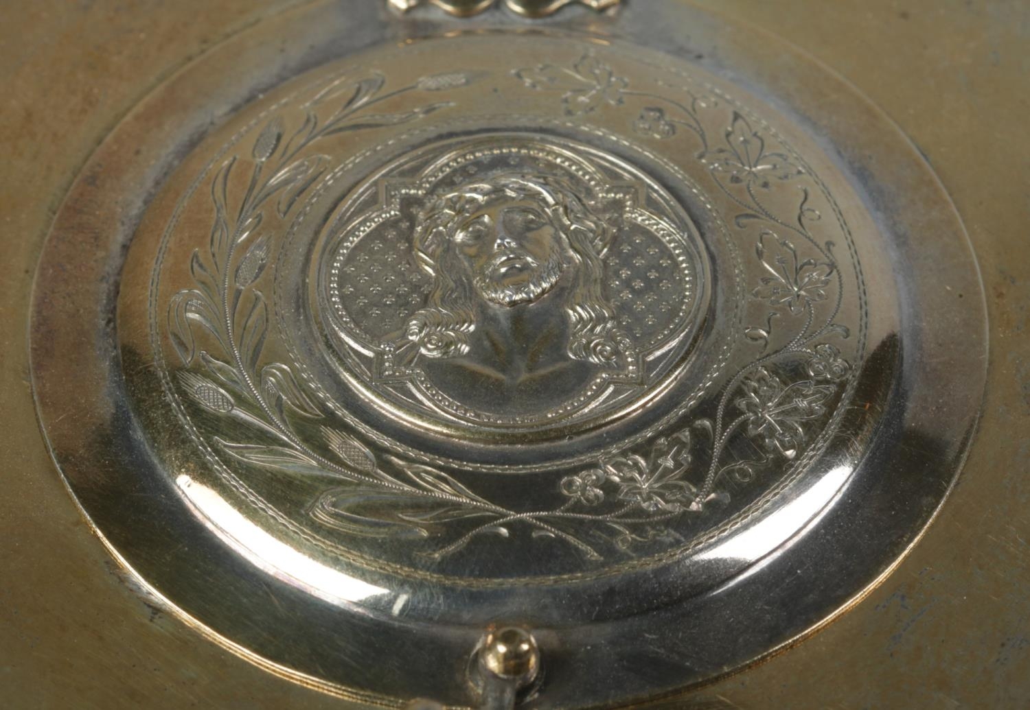 A German silver gilt religious dish with hinged cover. The front of the cover embossed with a image of Christ and the reverse having an image of Virgin Mary with Latin motto 'Mater Dolorosa, Ora Pro Nobis'. Stamped 800 with maker's mark for Otto Wolter. Diameter 11.5cm. 110g.