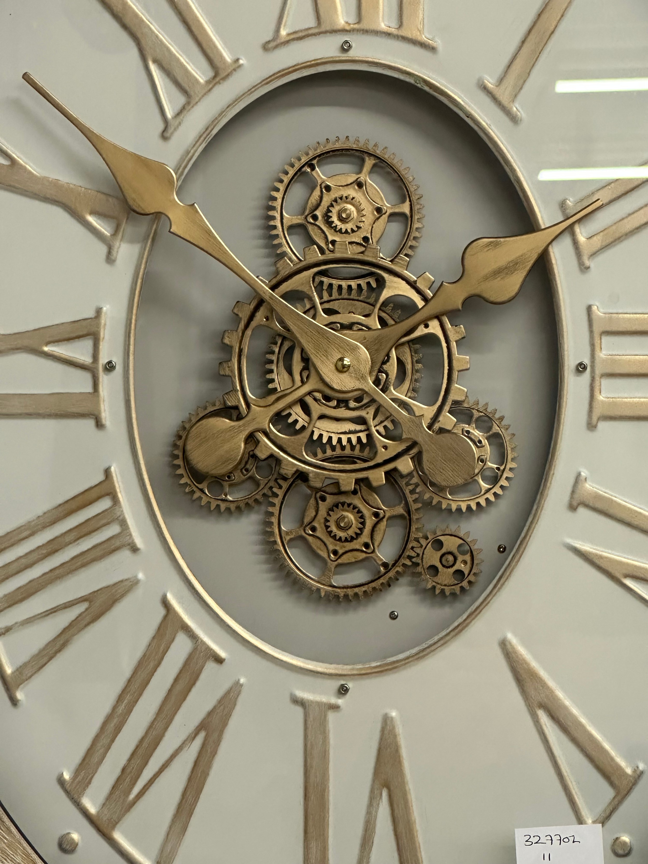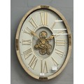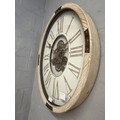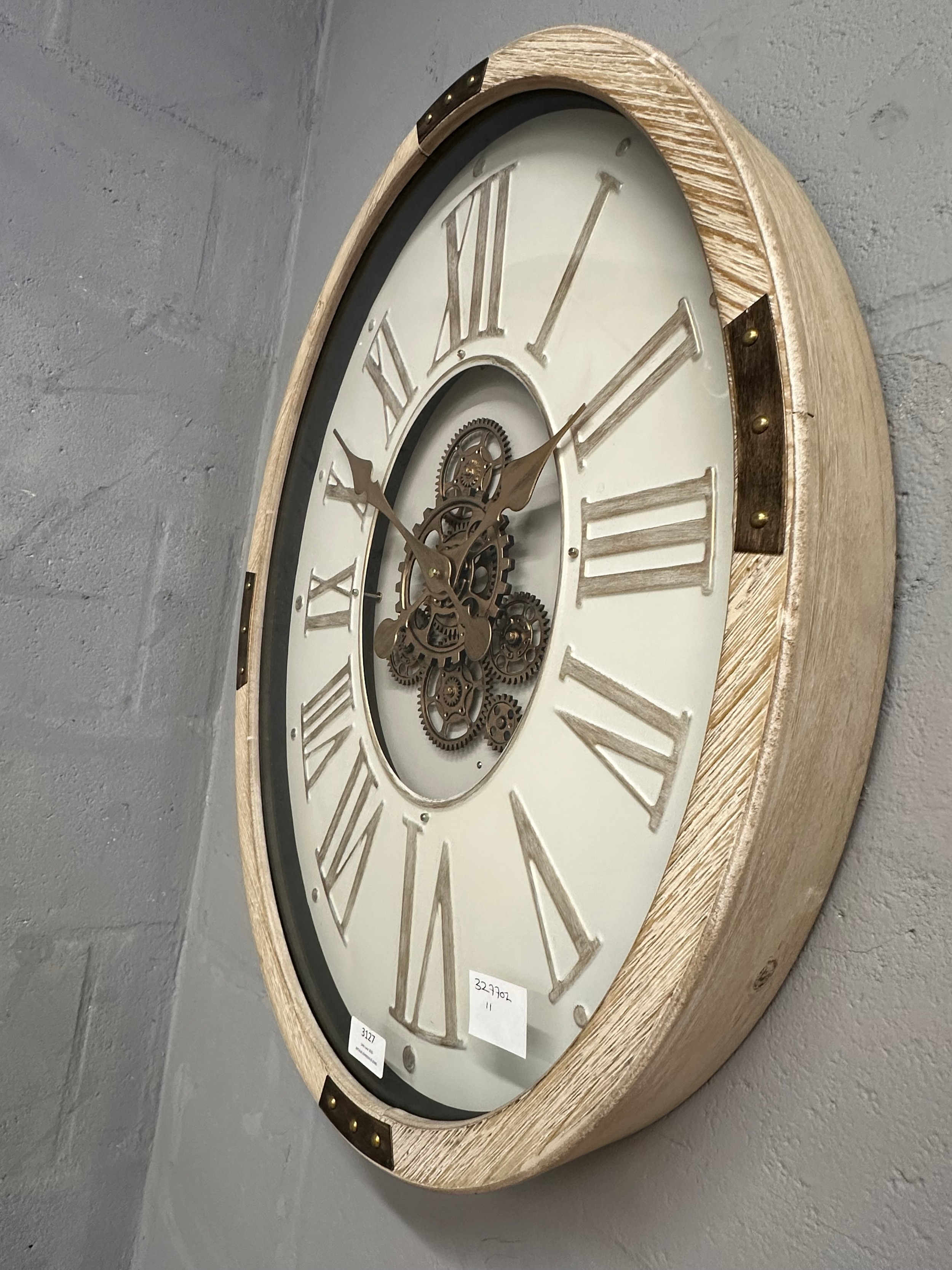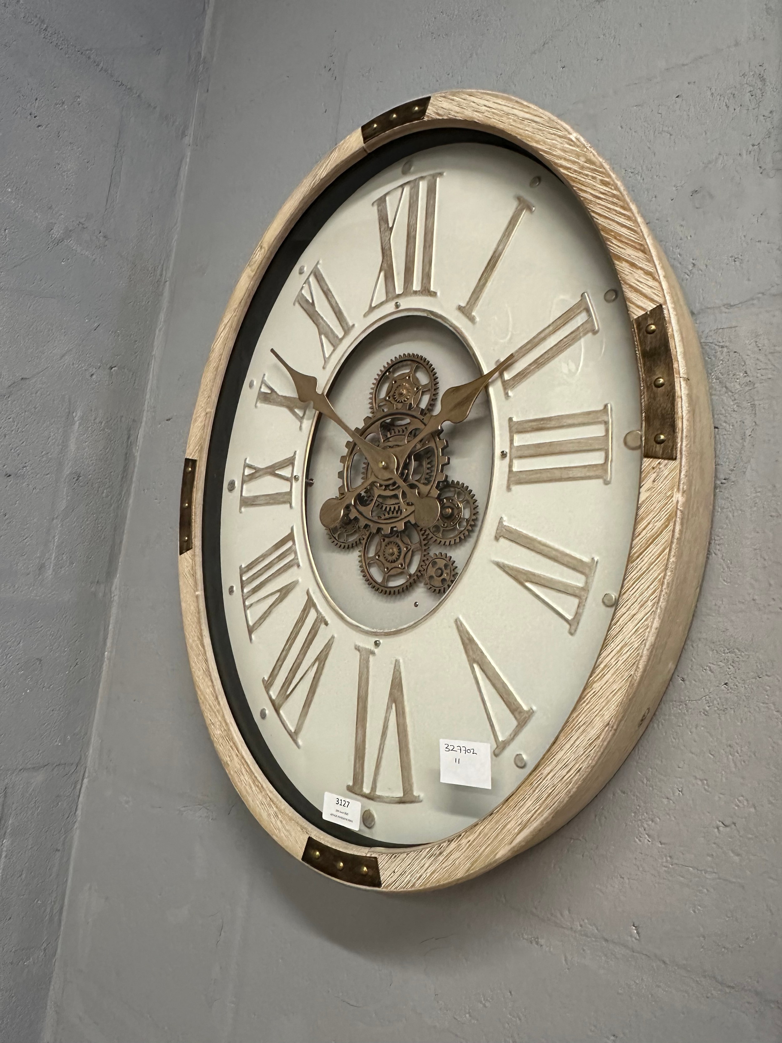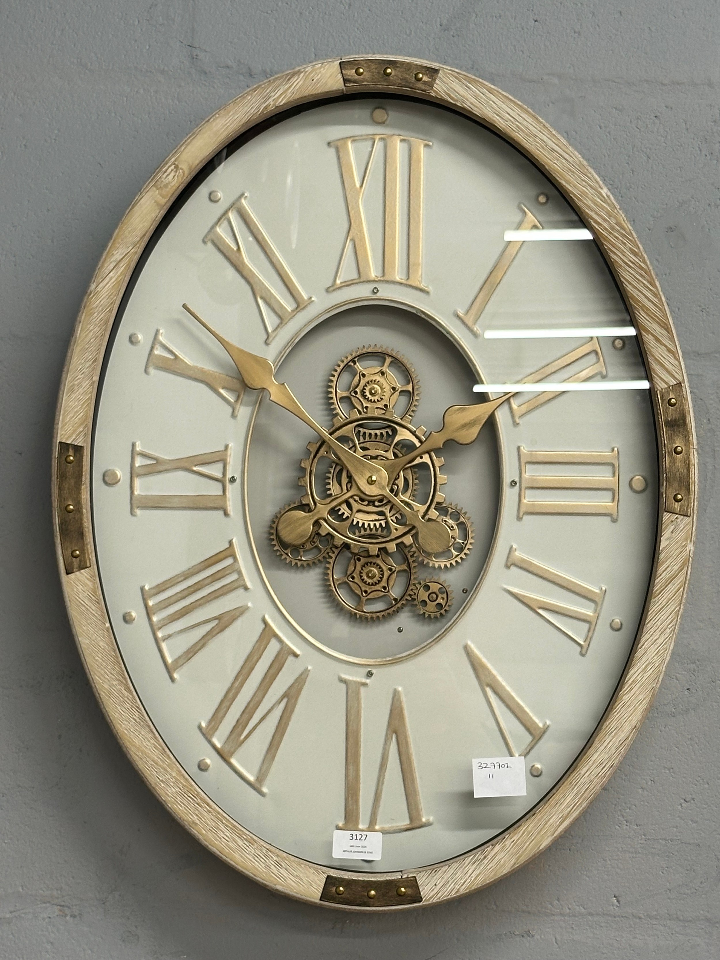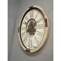 A washed wood effect oval moving gear wall clock