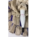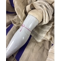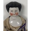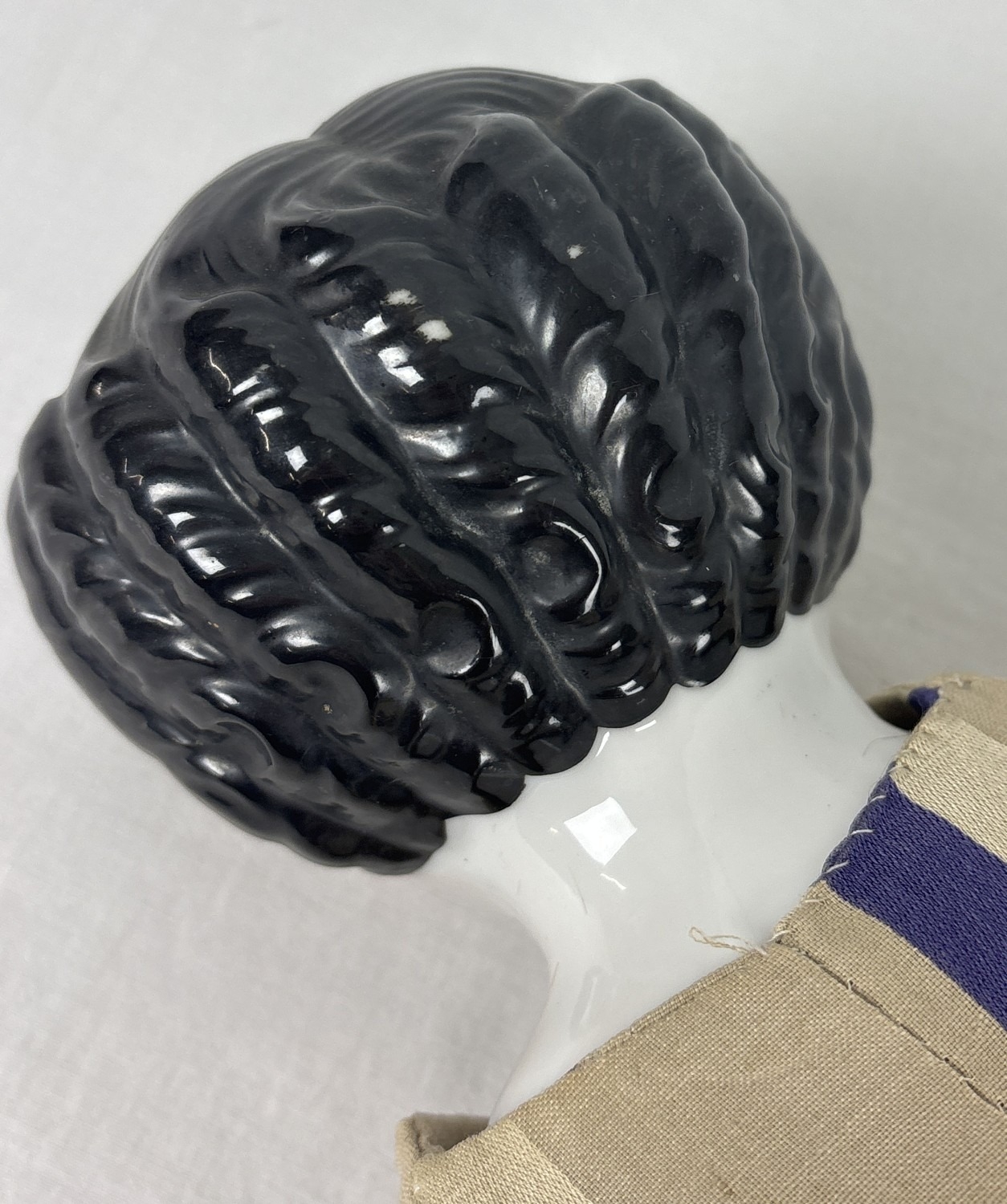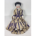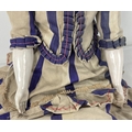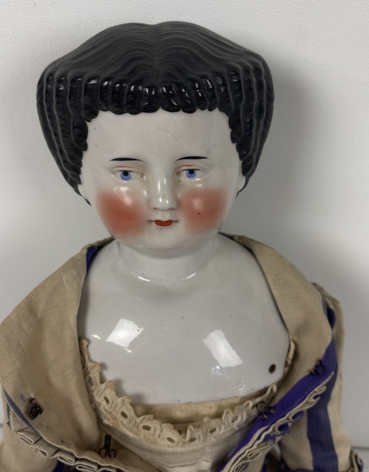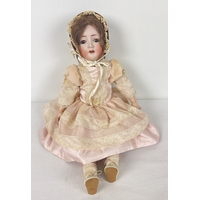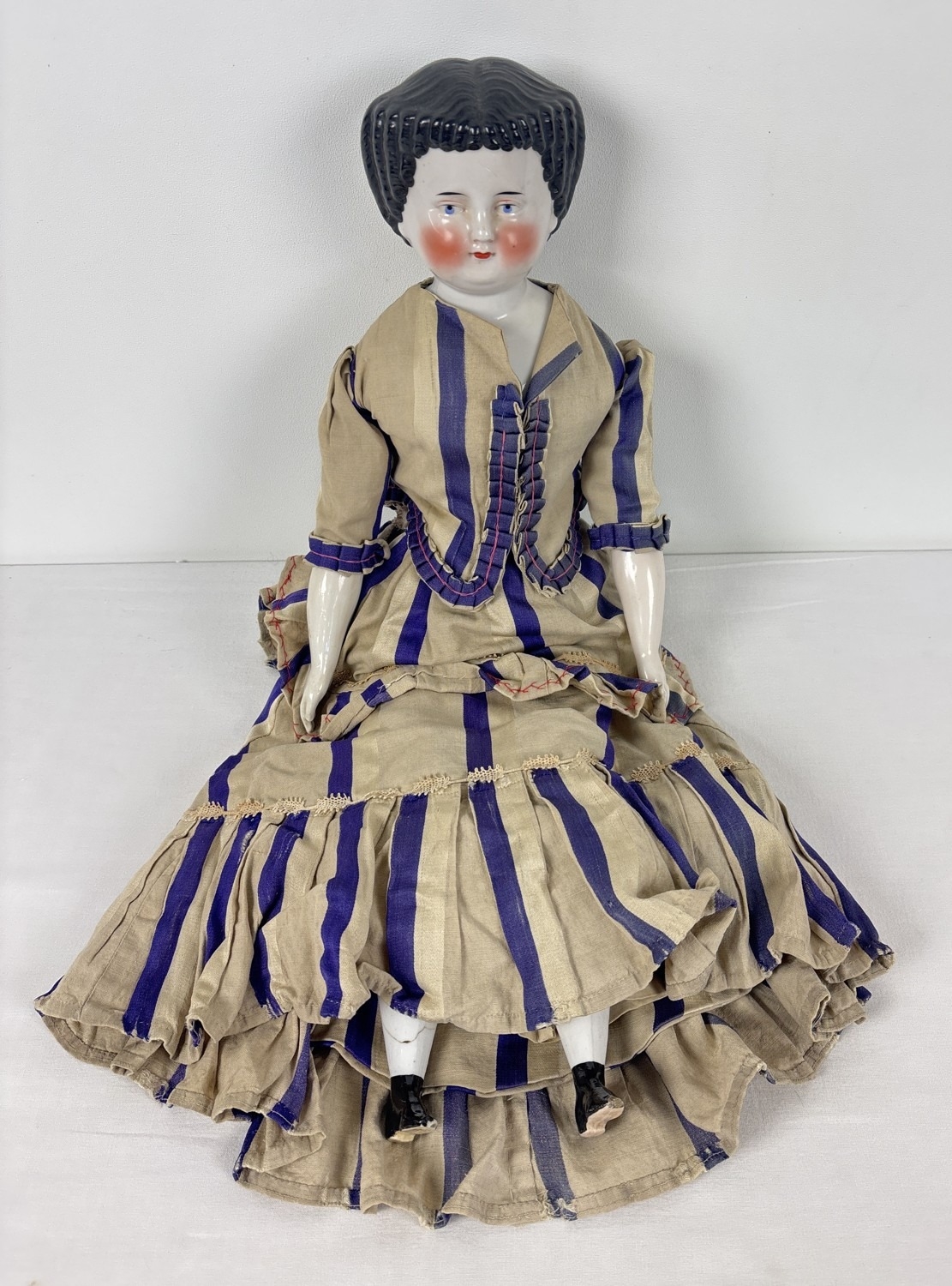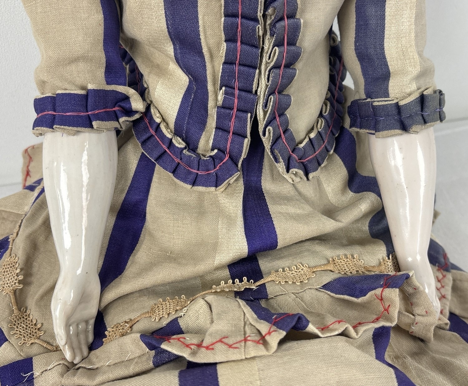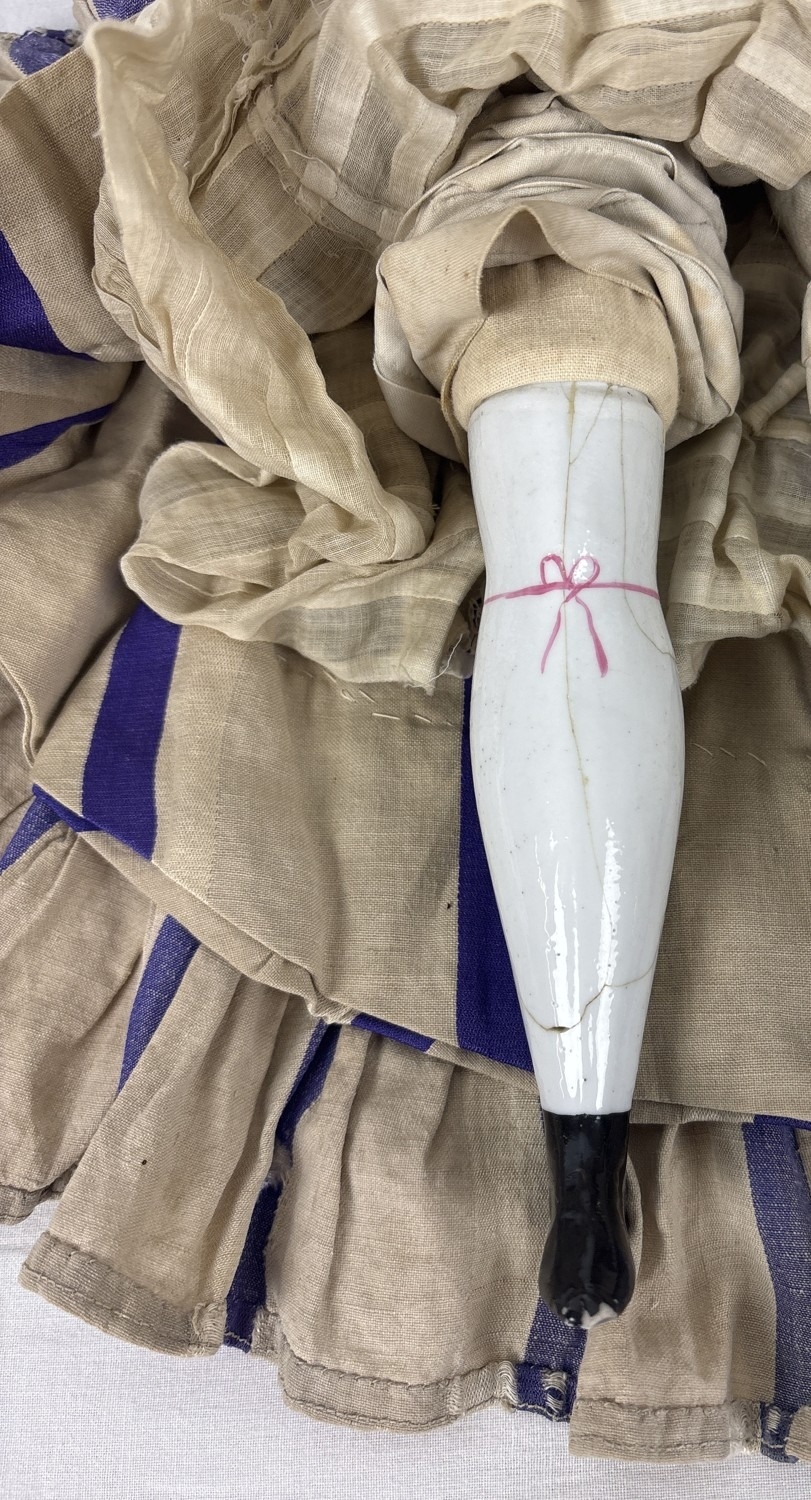 A large antique ceramic head French doll with soft body and ceramic arms and legs. With hand painted face, hair, pink bow garters and boots. Dressed in a handmade 2 piece Victorian style skirt and jacket with underskirts and pantaloons. Approx. 23 inches tall.