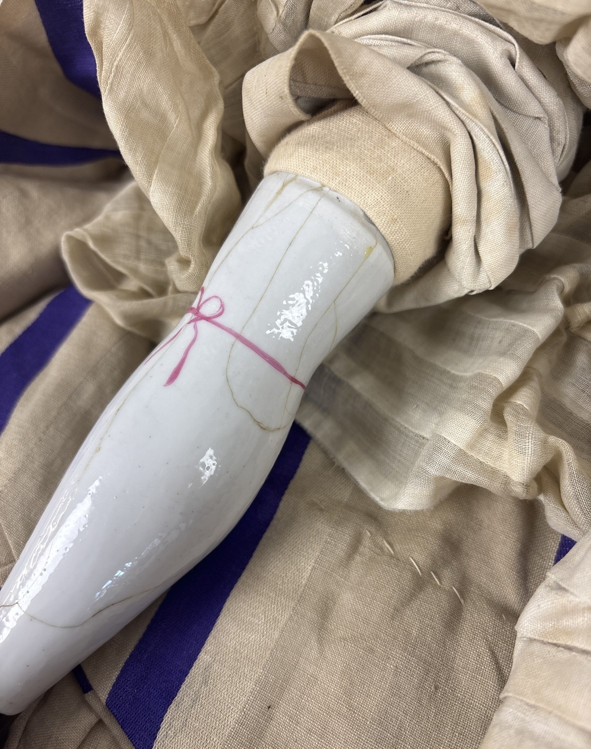 Multiple cracks to right leg, which show signs of repair. Chips to ends of both boots.