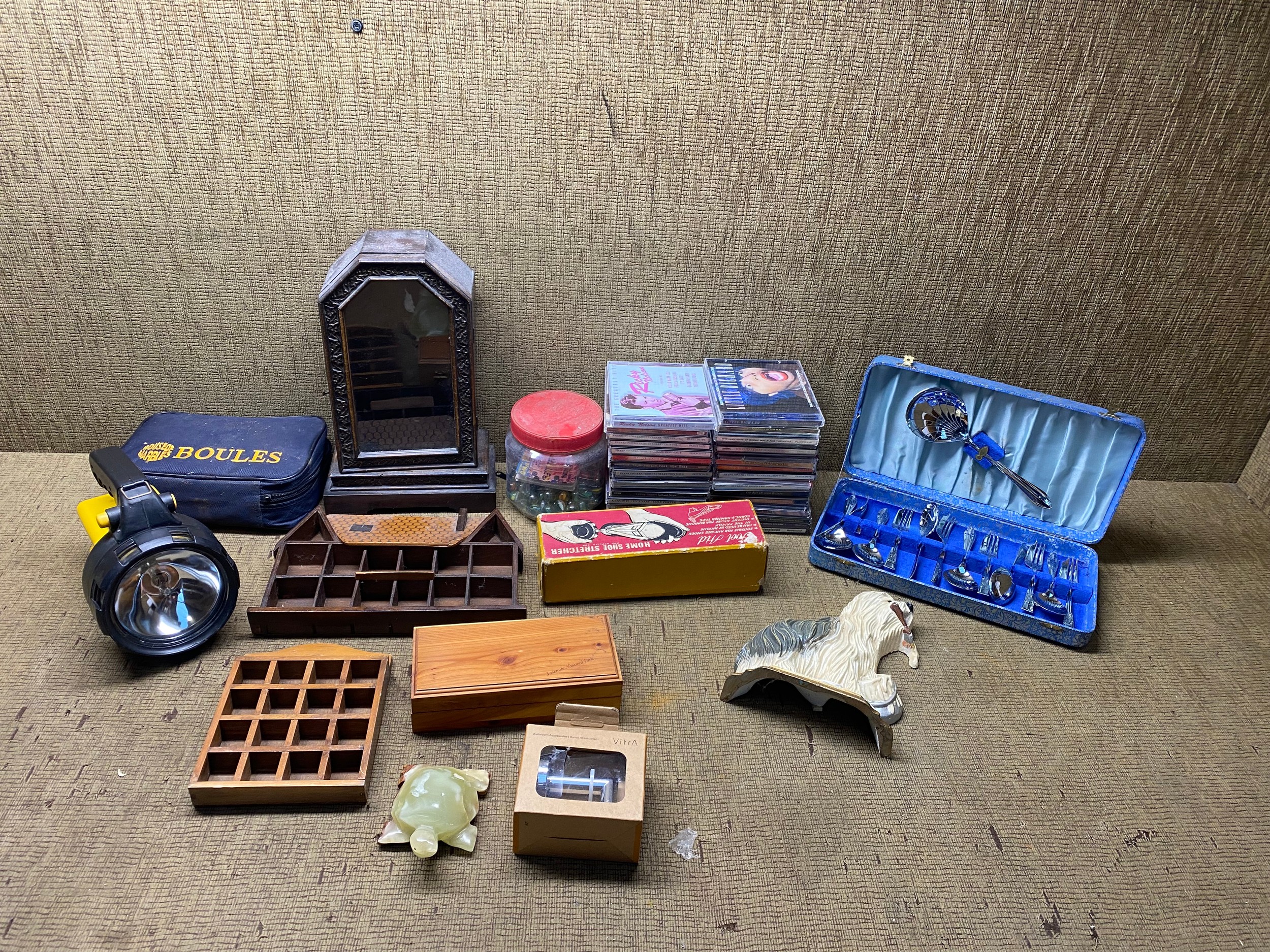 mixed items including CDs, a boules set, and a Halfords torch.