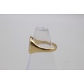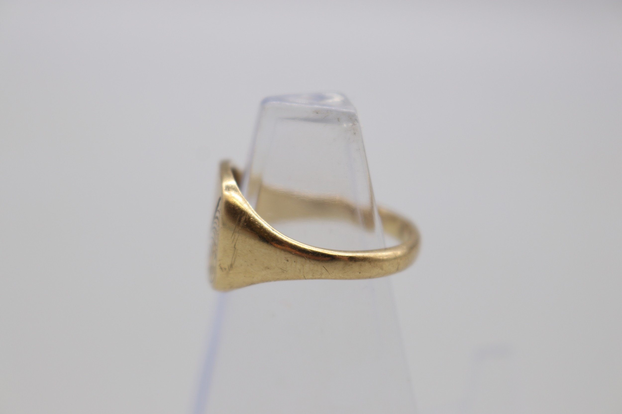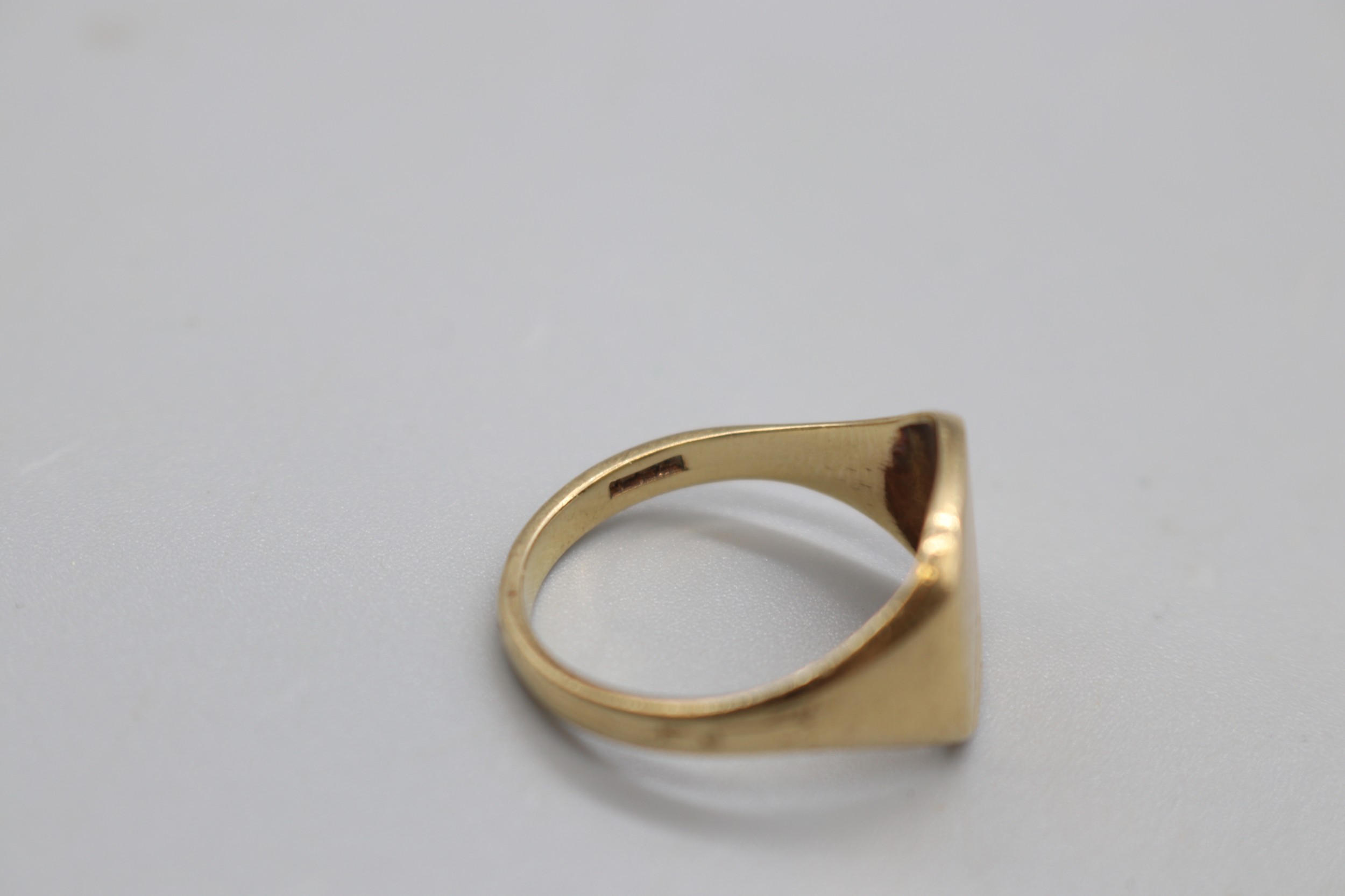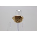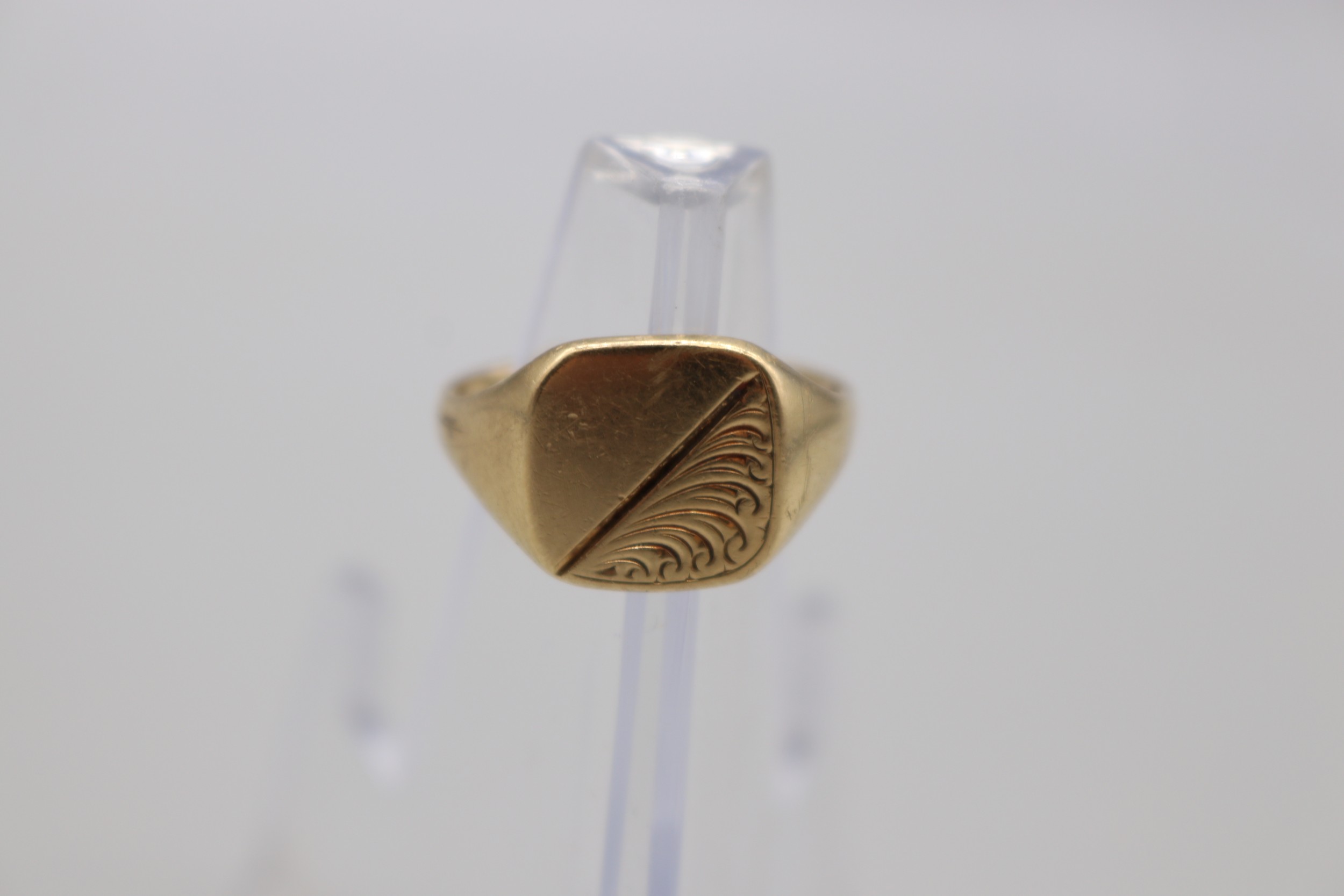 Stamped 9ct yellow gold signet ring with square engraved table, size R, weight 4.38g