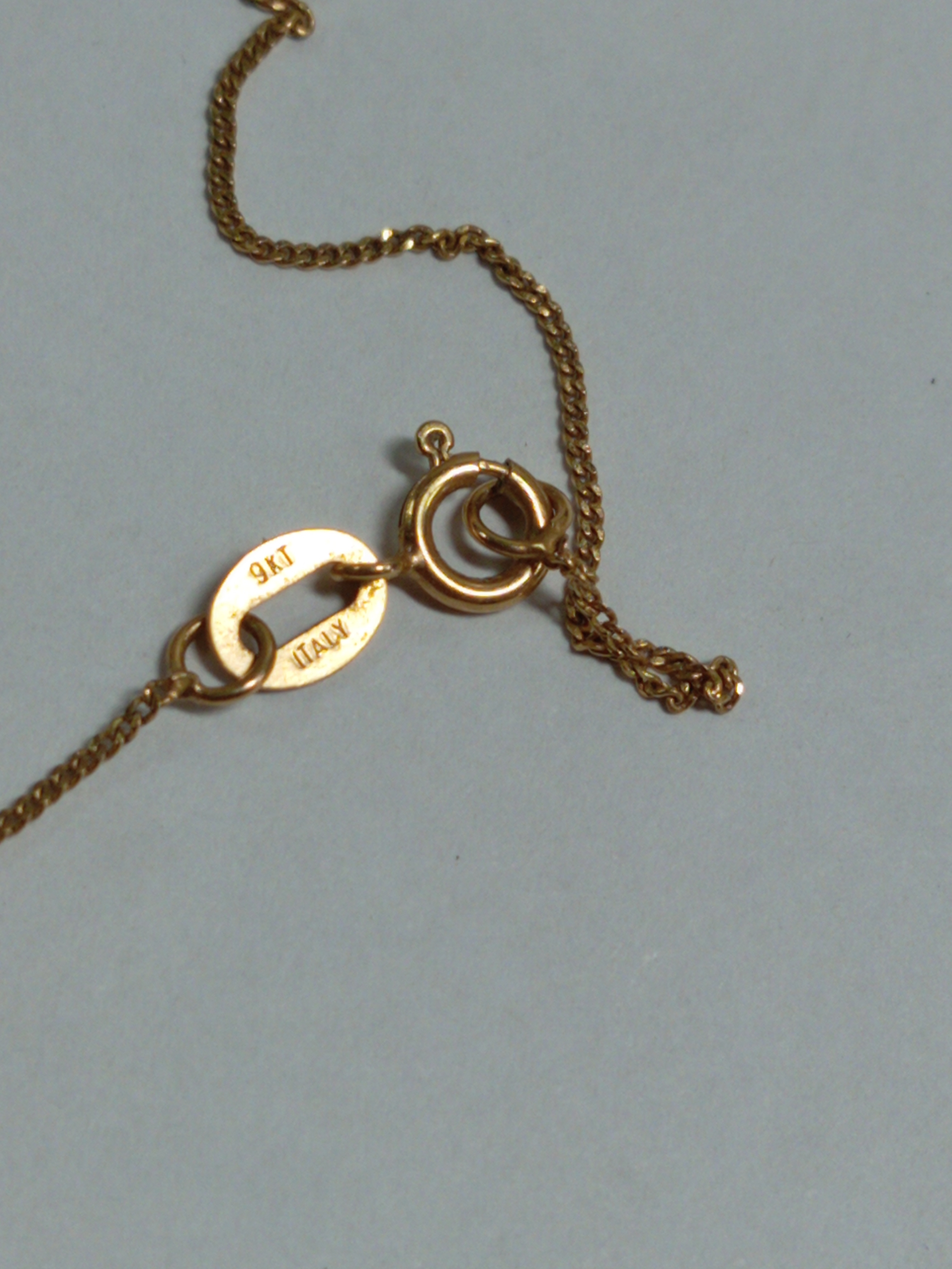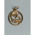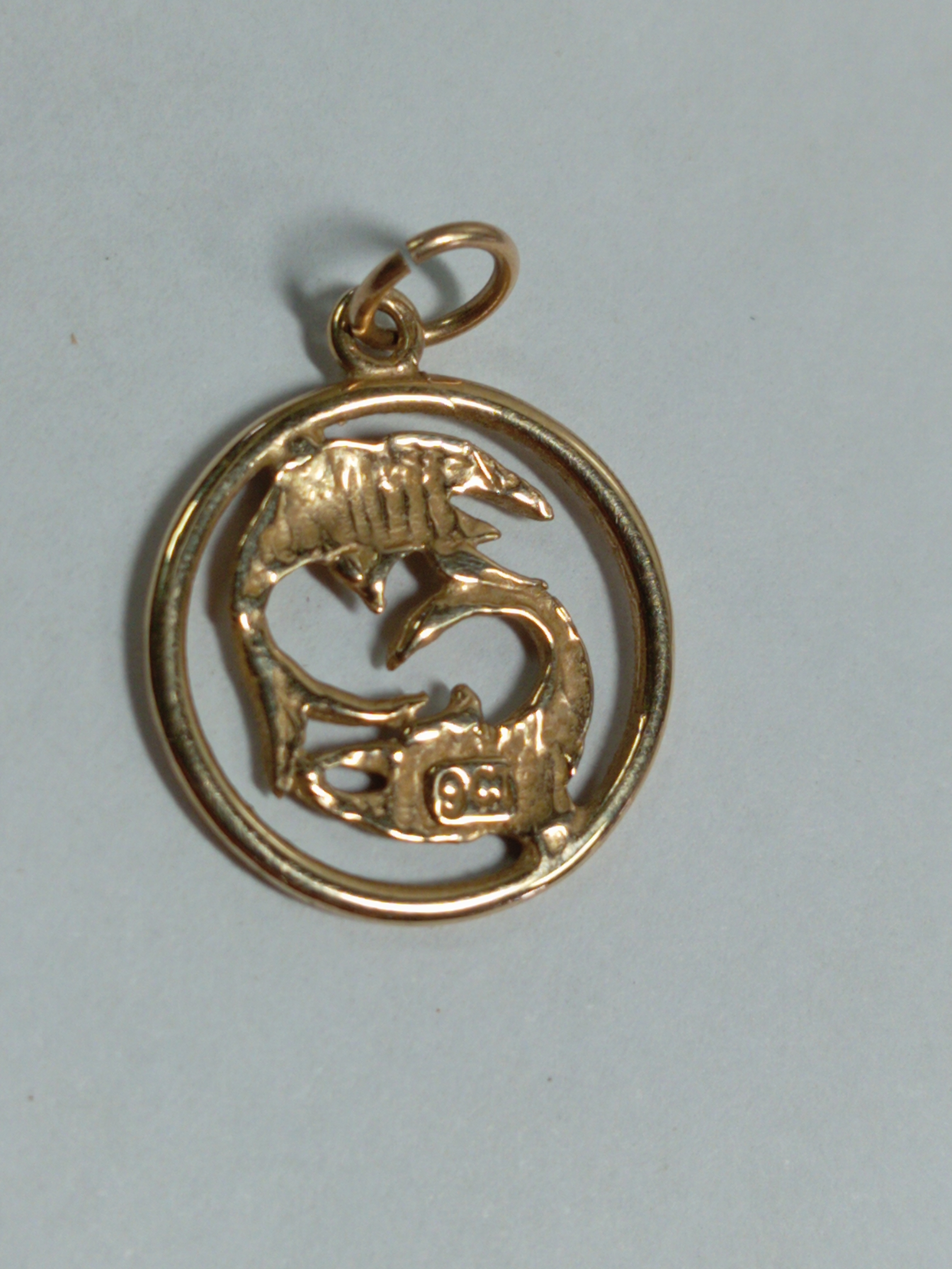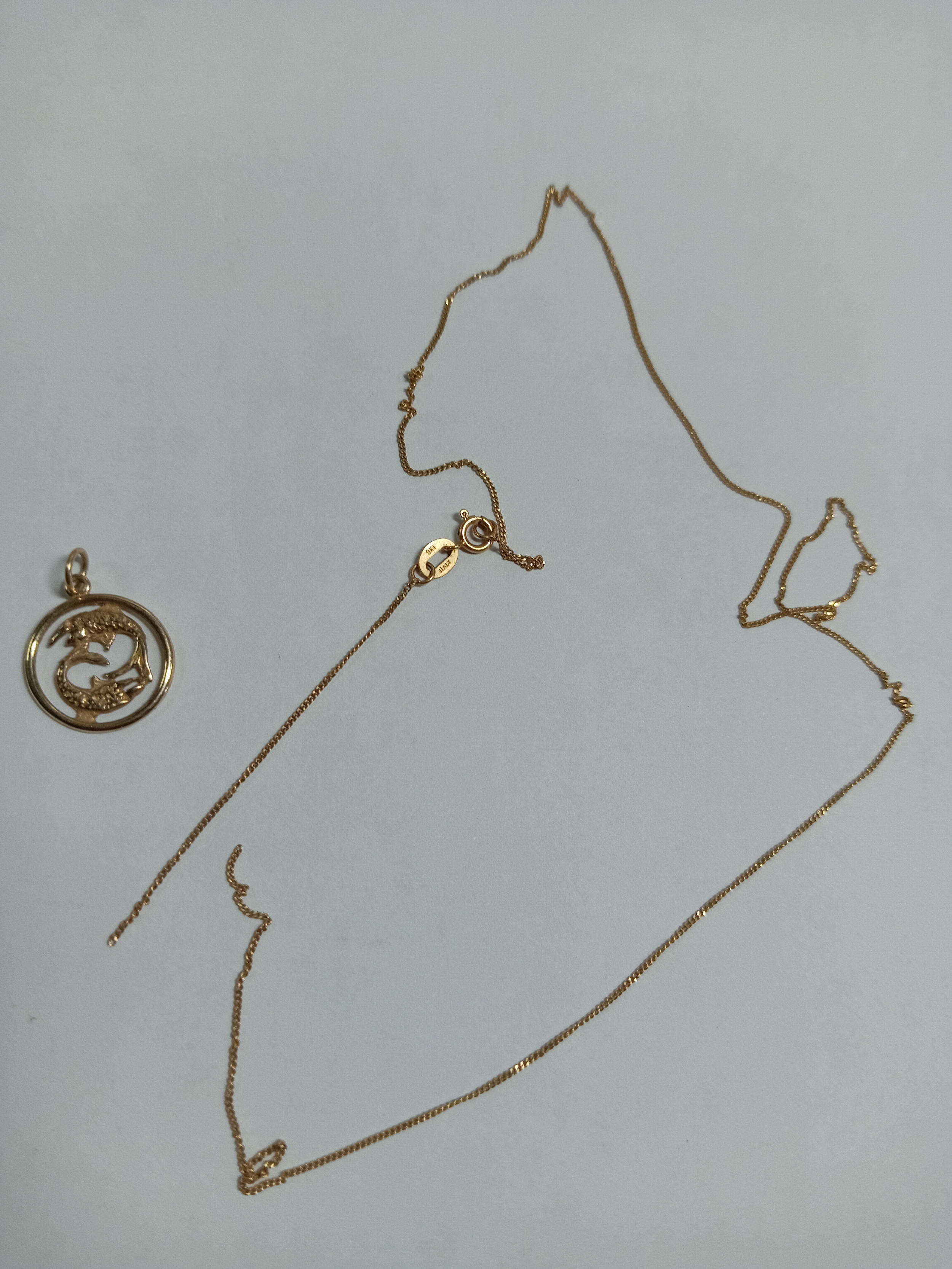 A 9ct gold fish pendant and a broken 9ct gold chain. Weight 1.7g