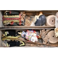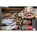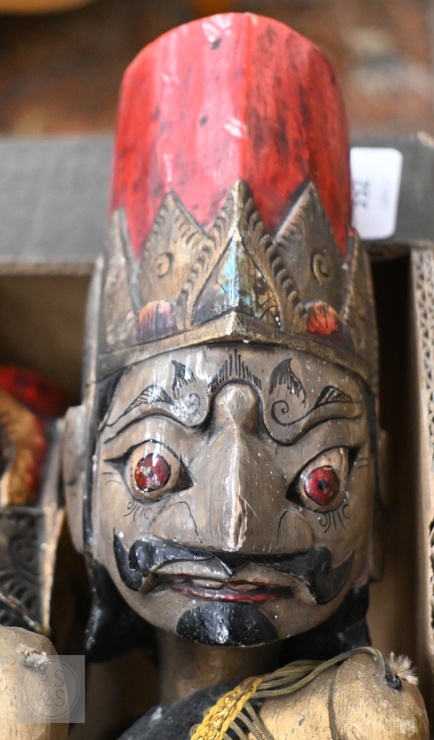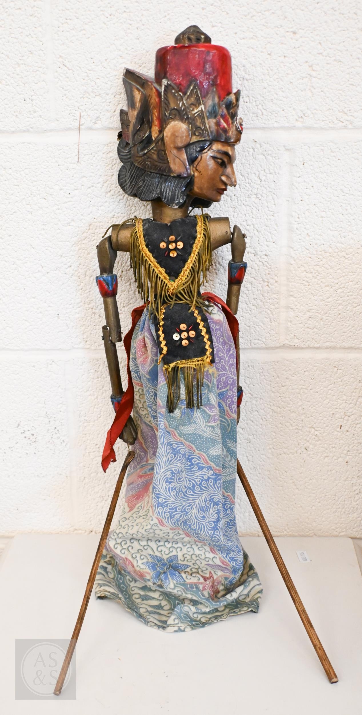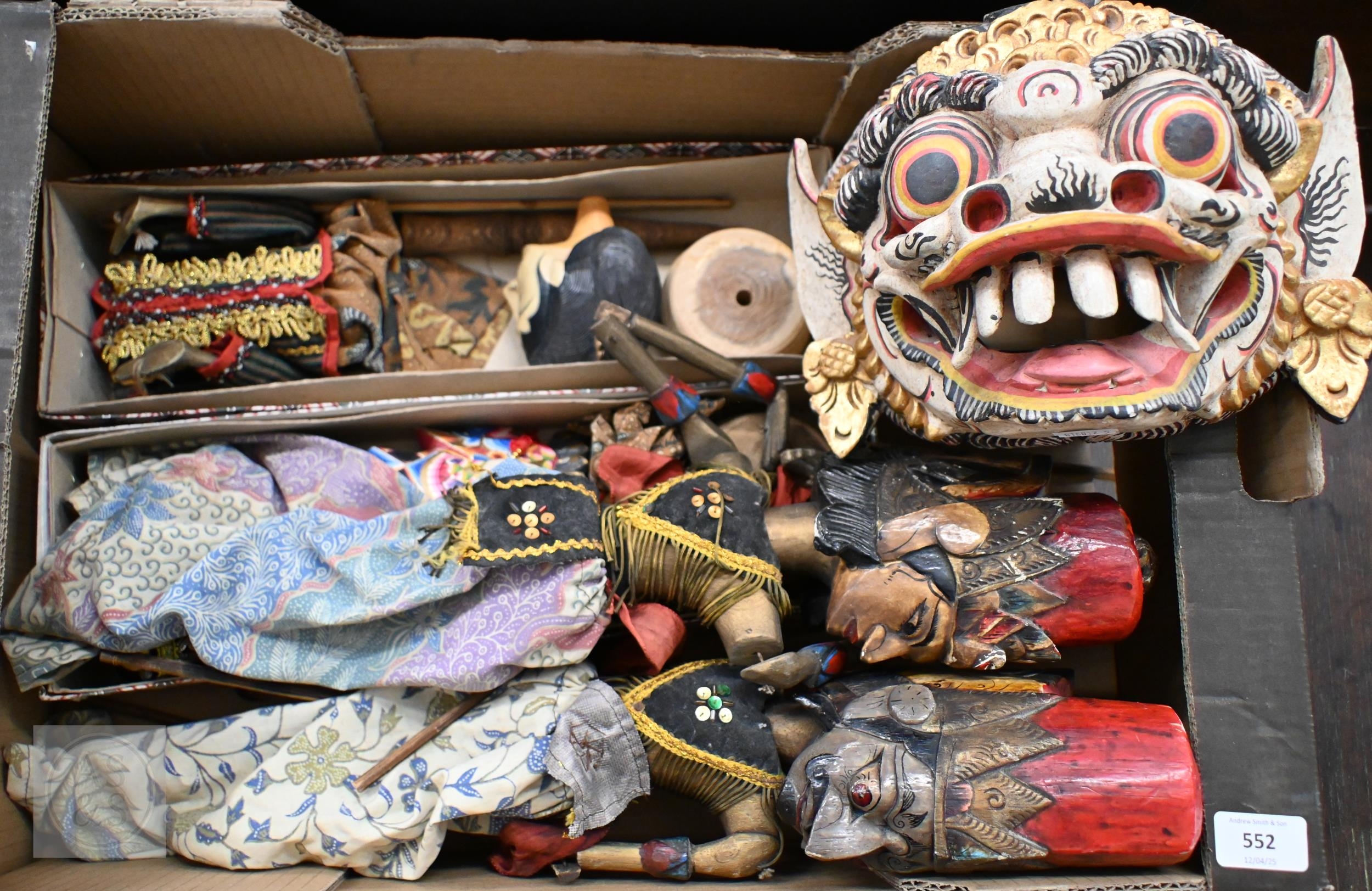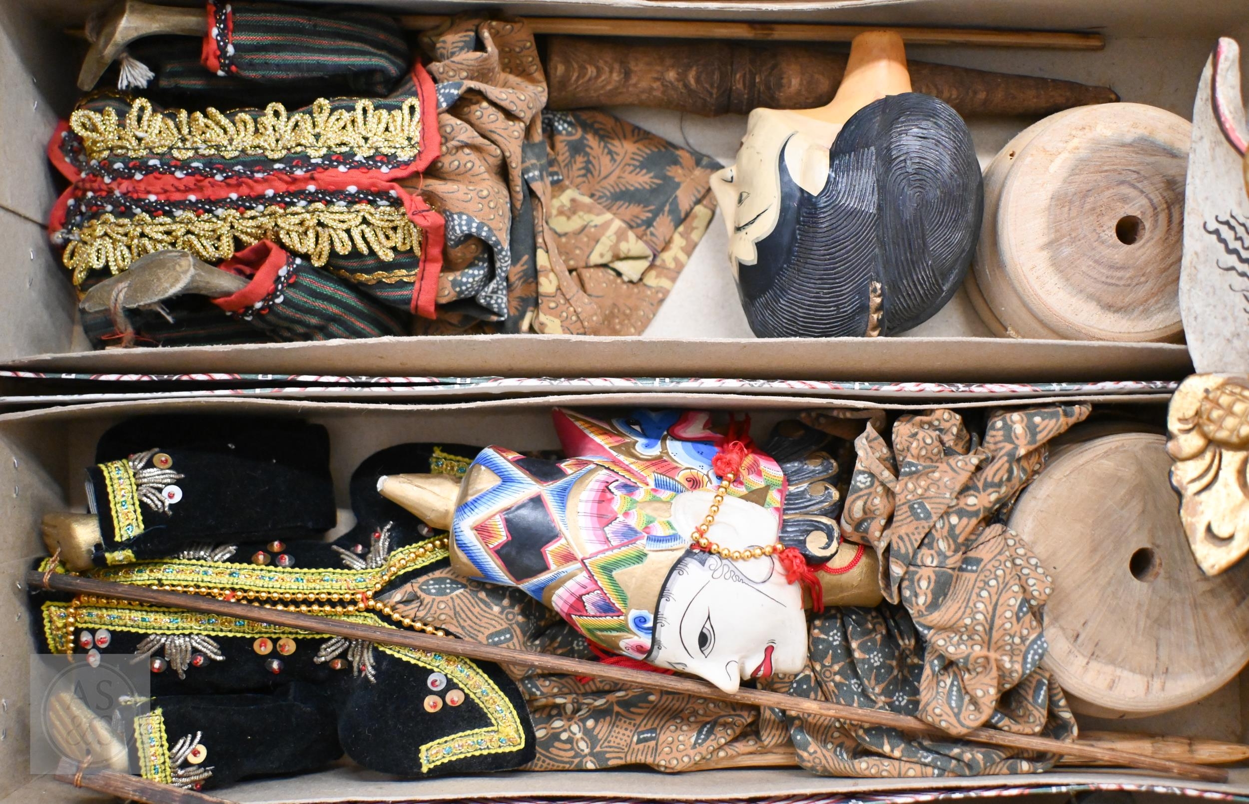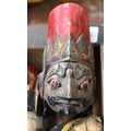 Four Javanese Wayang Golek puppets with painted wooden heads - two boxed with stands, to/w a painted wood demon wall-mask (box)