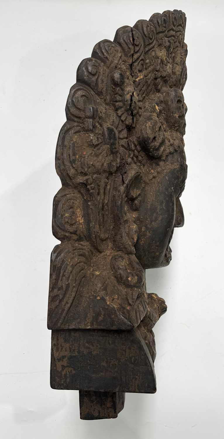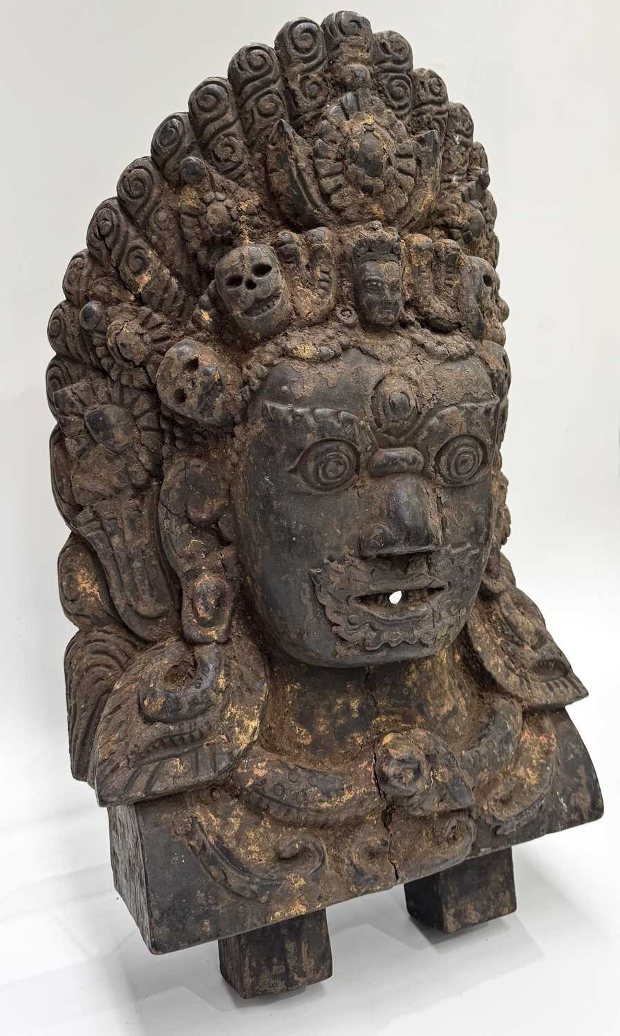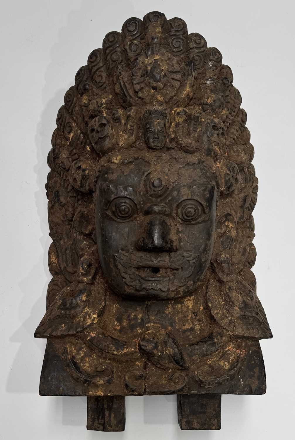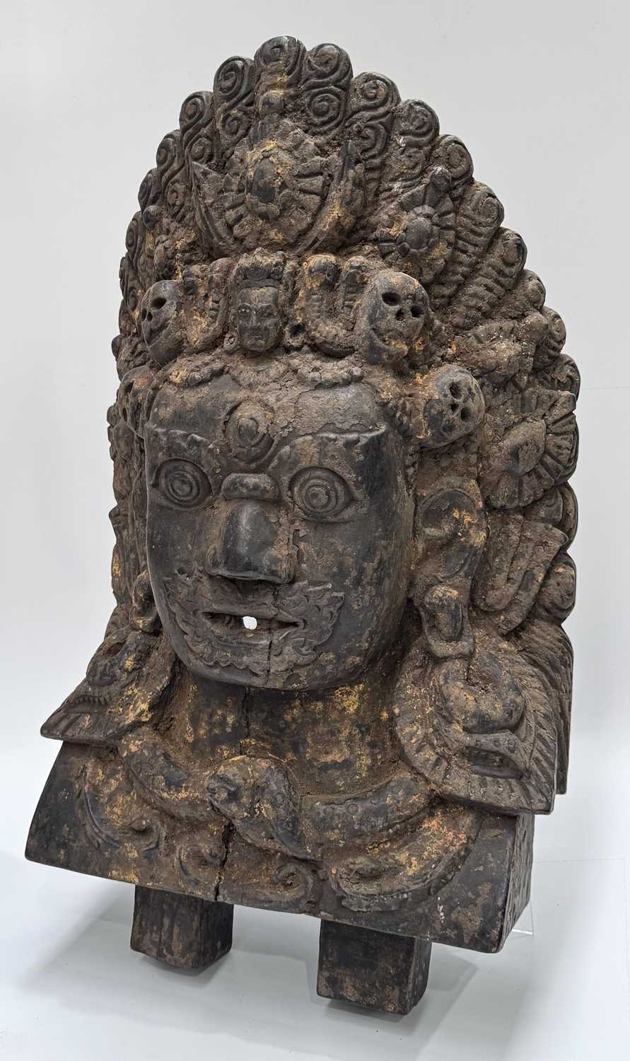 A wooden shrine bust mask of Bhairava, Kathmandu valley, 18th century or earlier, ornately carved with the God's attributes: heavy jewelled earrings and serpent necklace, coiling hair and crescent headdress topping a crown of skulls centred by a bodhisattva head, the fearsome face is punctuated with wide-open staring eyes beneath furled brows, centred by the third eye and an open flaming mouth pierced by a hole through which a straw can be placed, evidence of surface polychrome decoration, h:50cm, d:13cm, w:31.5cm Note: Bhairava is a fearsome form of the Hindu deity Shiva, particularly revered by the Newari people of the Kathmandu valley. The mask is activated during the festival of Indra Jatra, where a jar filled with liquor is placed behind the mask, from which a pipe or straw protrudes through the mouth. Crowds fiercely compete for the honour to be the first to drink from the straw; consumption conveys good health and fortune. See a more ornate gilded example in The Met Museum collection, Object Number: 2012.444.2 and a similar carved wood example sold at Bonhams, New York, 19th March, 2018, 'Indian, Himalayan & Southeast Asian Art', Lot 3040, https://www.bonhams.com/auction/24358/lot/3040/a-wood-bhairava-mask-nepal-late-15th16th-century/ Provenance: The Alain Rouveure Collection