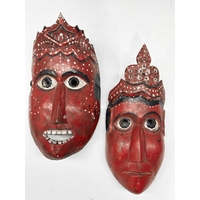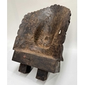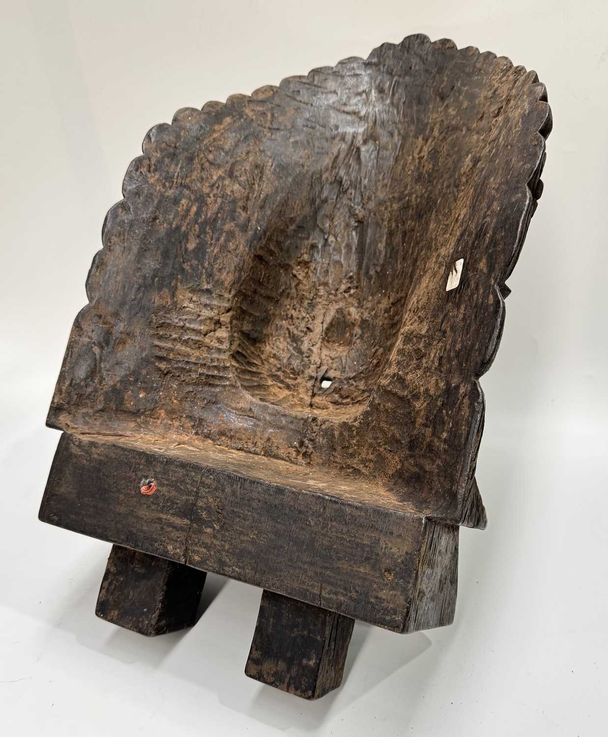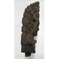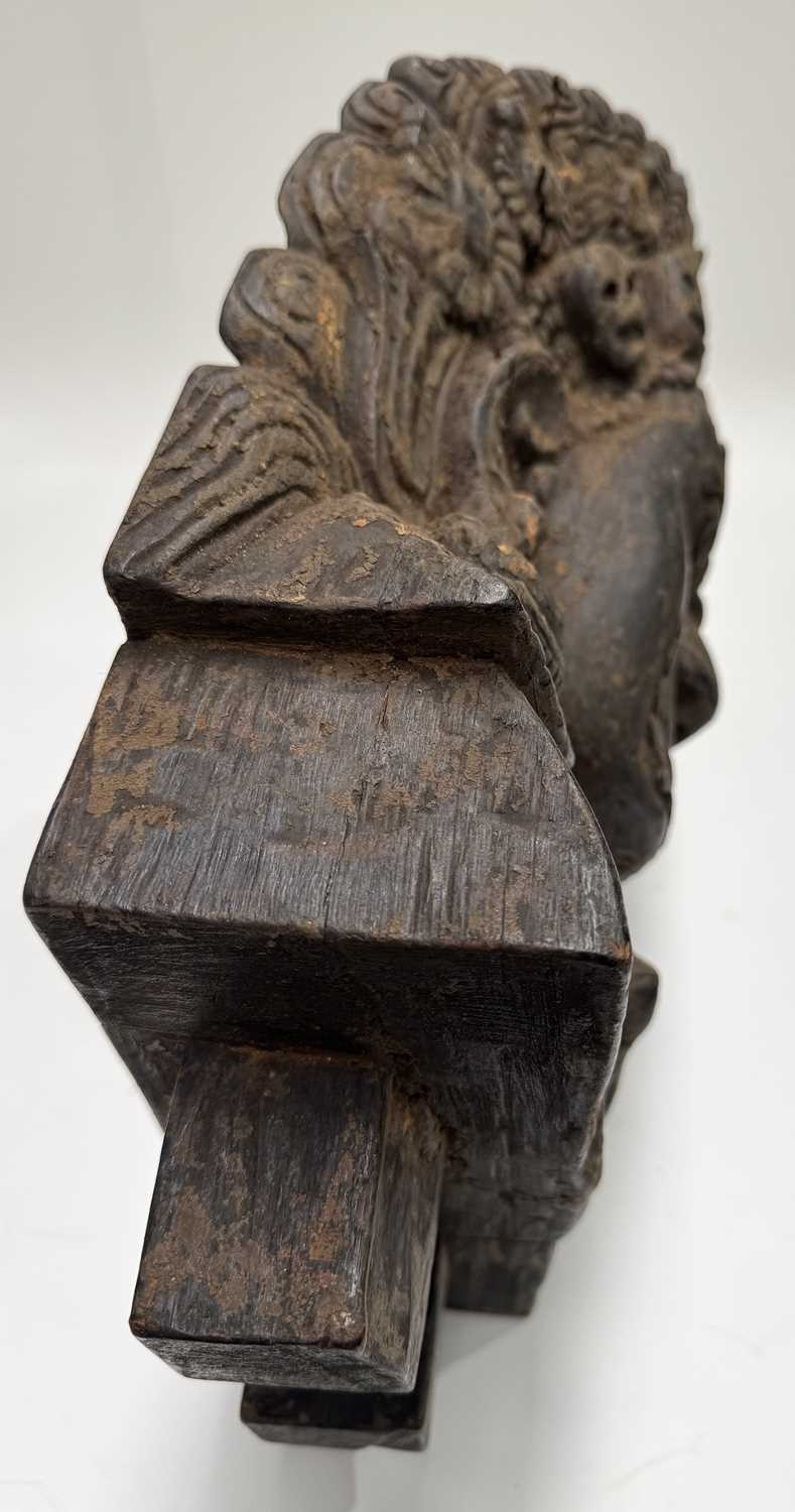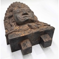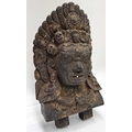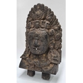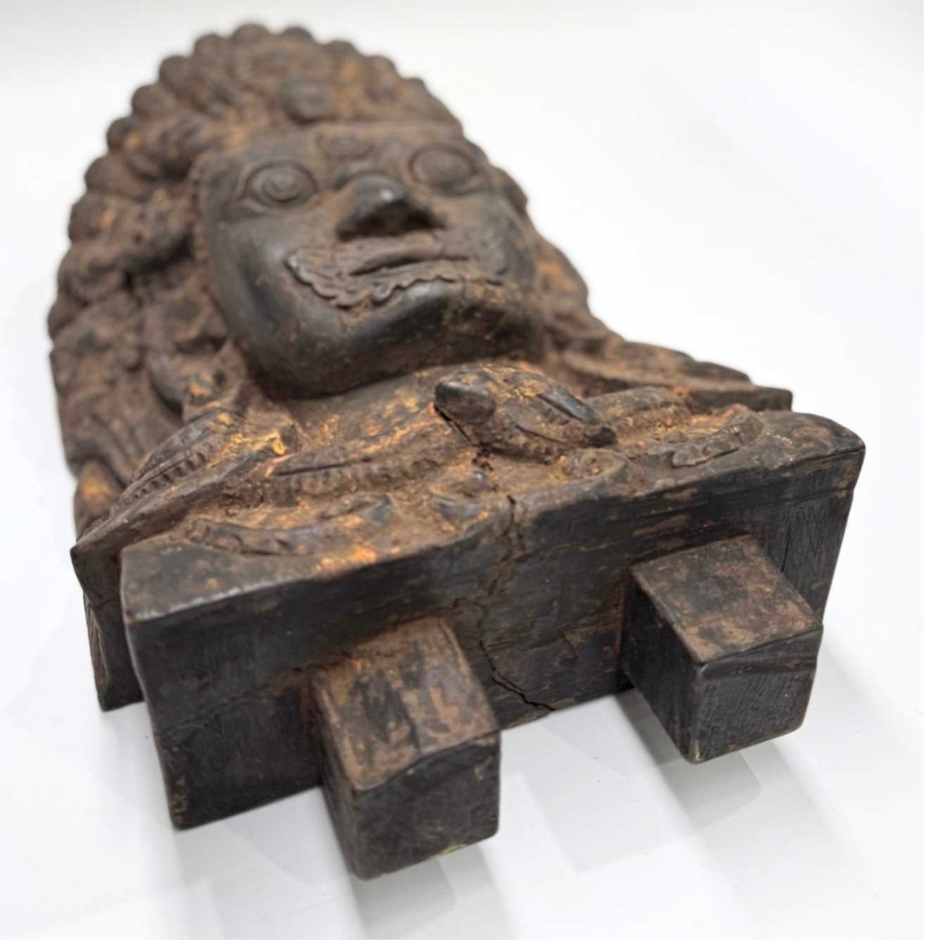 A wooden shrine bust mask of Bhairava, Kathmandu valley, 18th century or earlier, ornately carved with the God's attributes: heavy jewelled earrings and serpent necklace, coiling hair and crescent headdress topping a crown of skulls centred by a bodhisattva head, the fearsome face is punctuated with wide-open staring eyes beneath furled brows, centred by the third eye and an open flaming mouth pierced by a hole through which a straw can be placed, evidence of surface polychrome decoration, h:50cm, d:13cm, w:31.5cm Note: Bhairava is a fearsome form of the Hindu deity Shiva, particularly revered by the Newari people of the Kathmandu valley. The mask is activated during the festival of Indra Jatra, where a jar filled with liquor is placed behind the mask, from which a pipe or straw protrudes through the mouth. Crowds fiercely compete for the honour to be the first to drink from the straw; consumption conveys good health and fortune. See a more ornate gilded example in The Met Museum collection, Object Number: 2012.444.2 and a similar carved wood example sold at Bonhams, New York, 19th March, 2018, 'Indian, Himalayan & Southeast Asian Art', Lot 3040, https://www.bonhams.com/auction/24358/lot/3040/a-wood-bhairava-mask-nepal-late-15th16th-century/ Provenance: The Alain Rouveure Collection