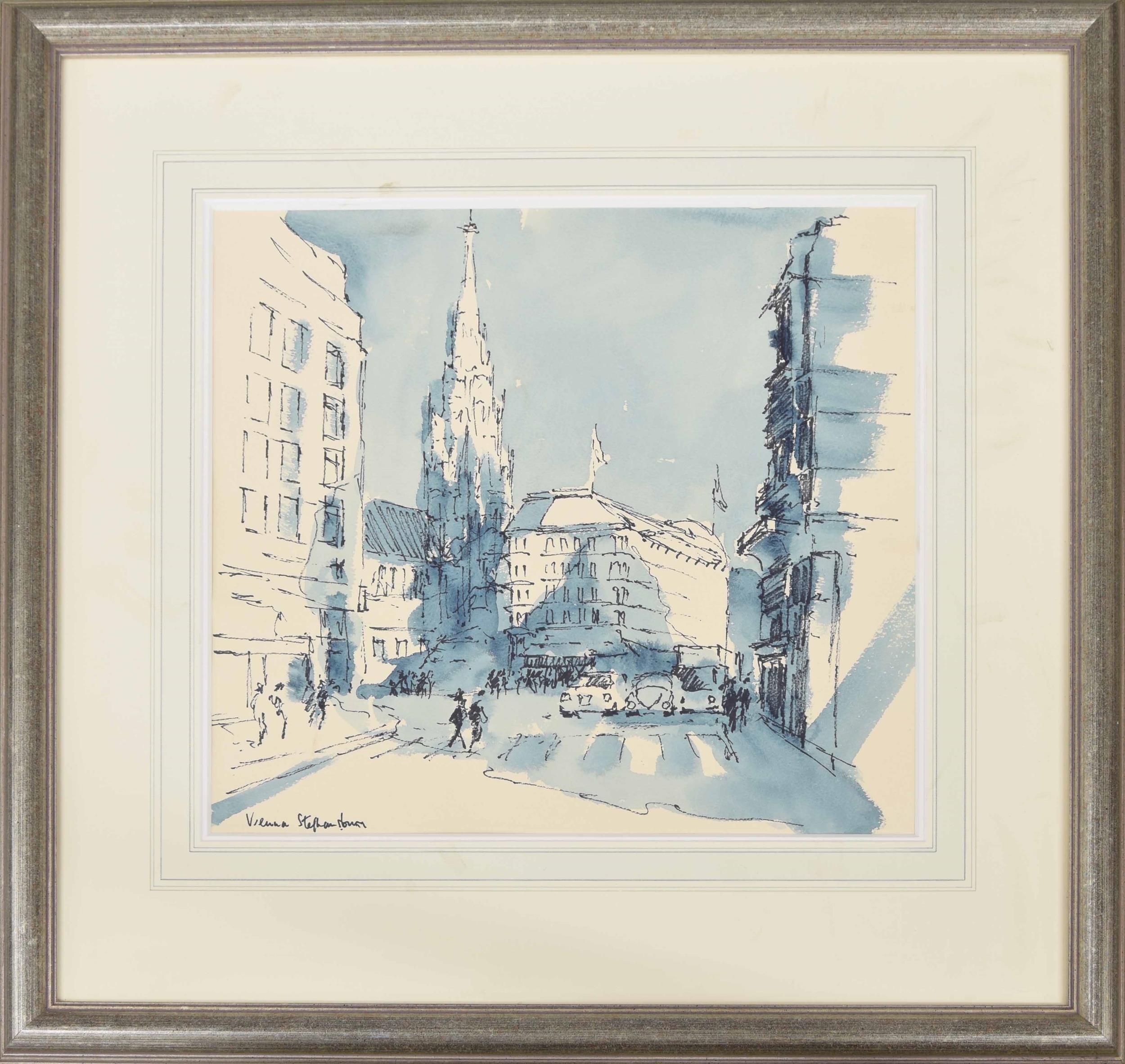 Edward Wesson RI, RSMA, RBA, RI (1910-1983) - Vienna Stefhansburg, inscribed with the title in the artist's own hand but unsigned, felt pen and watercolour, 14.75" x 16.25"