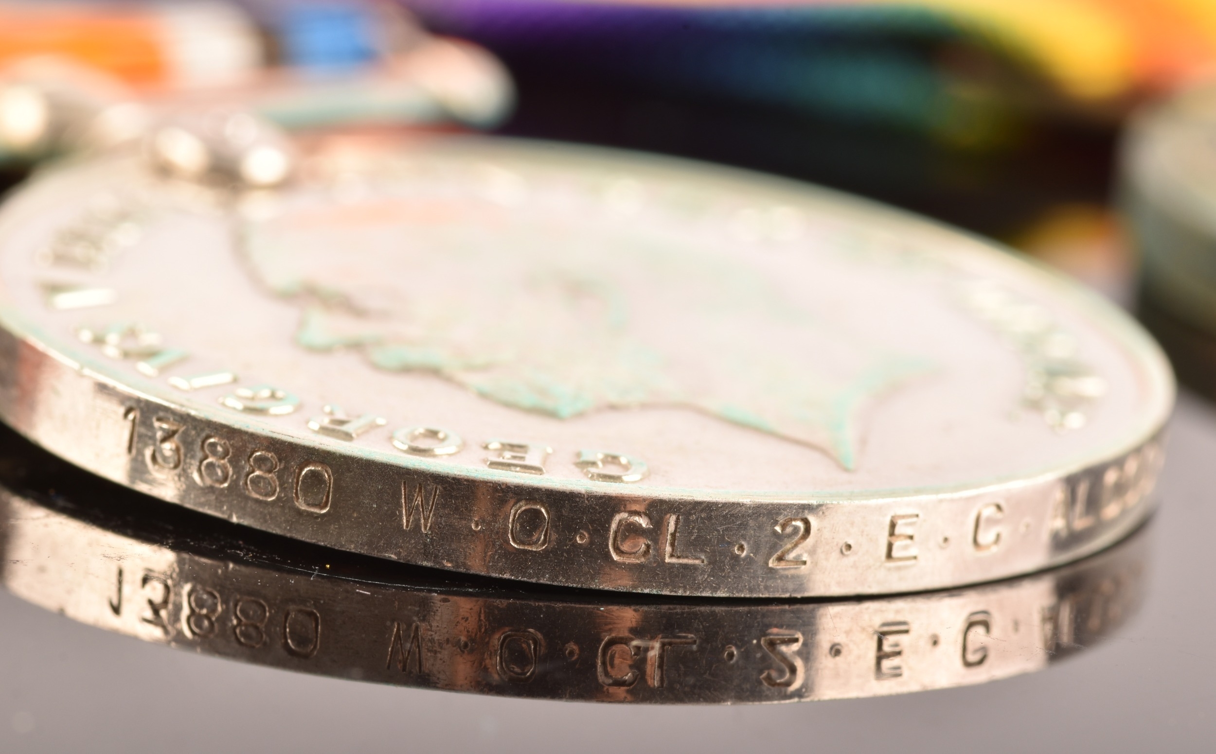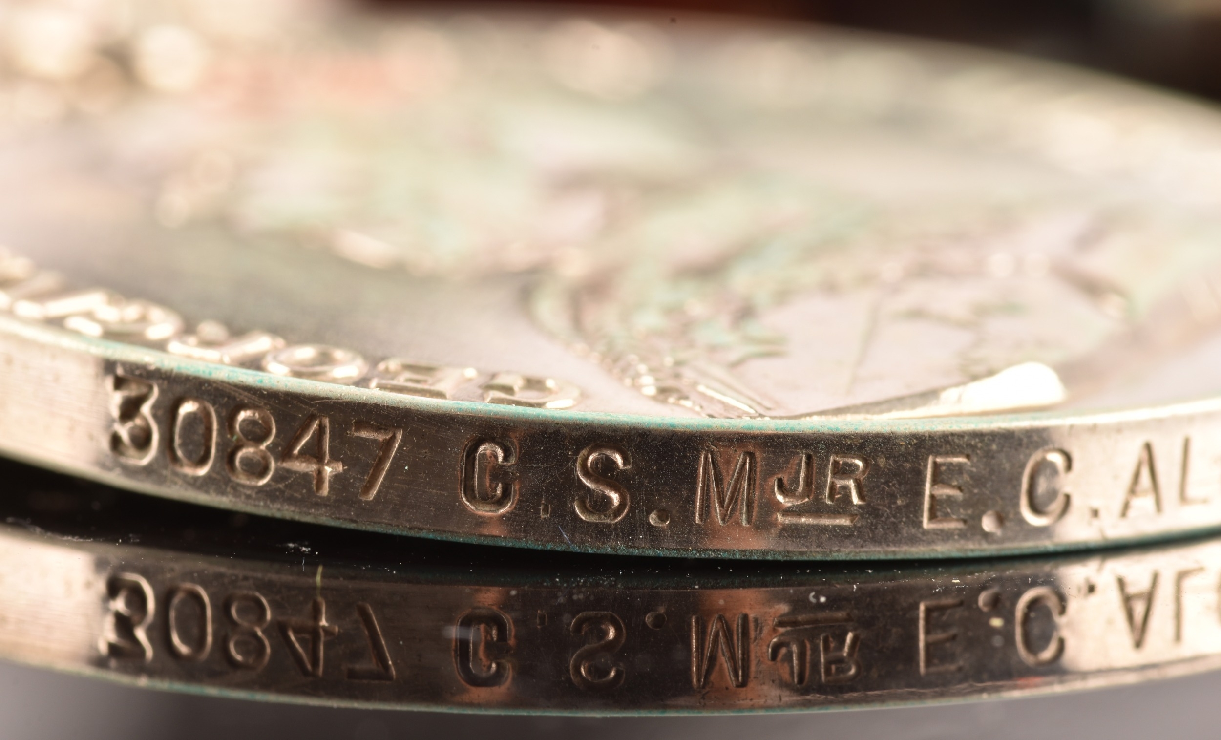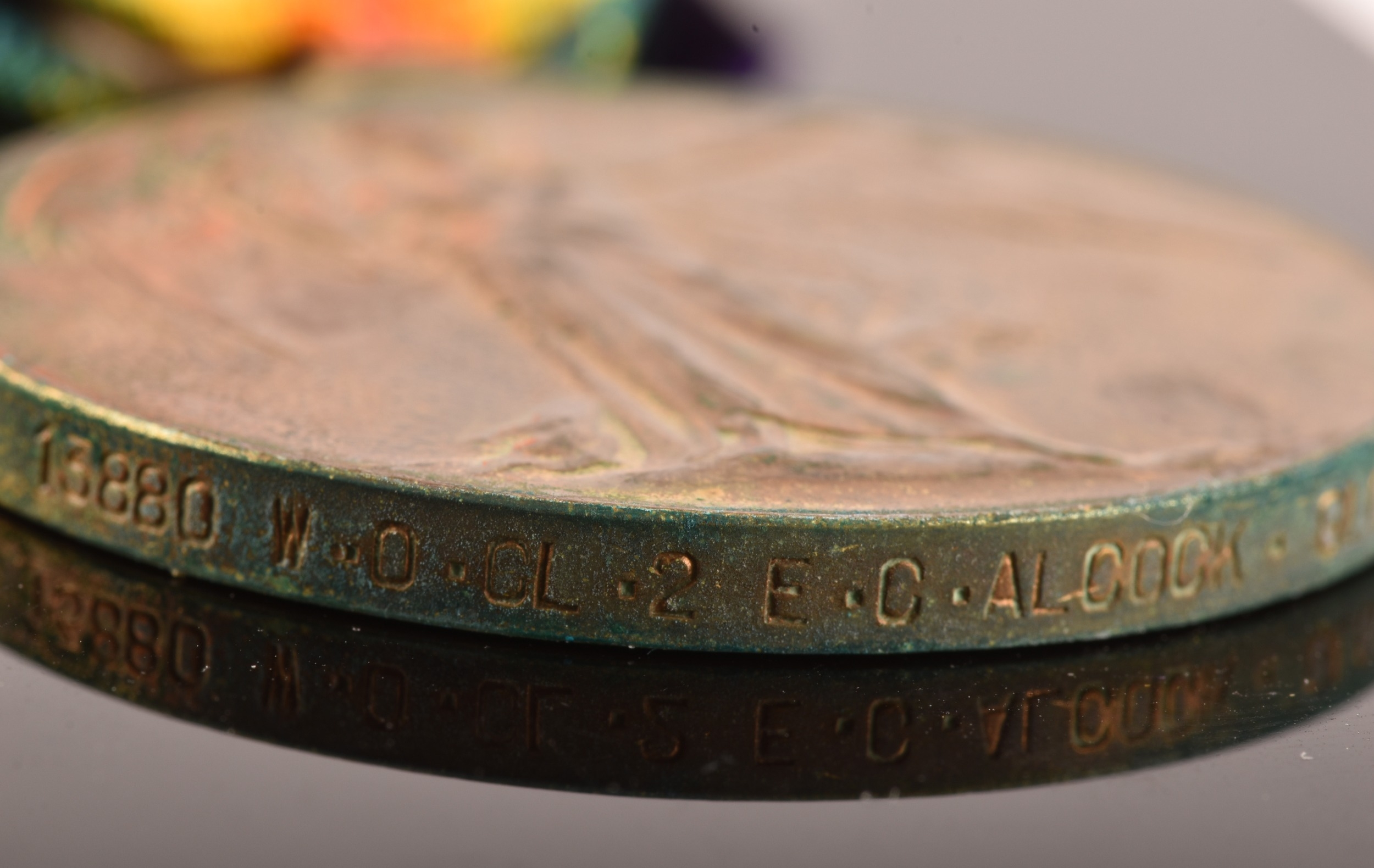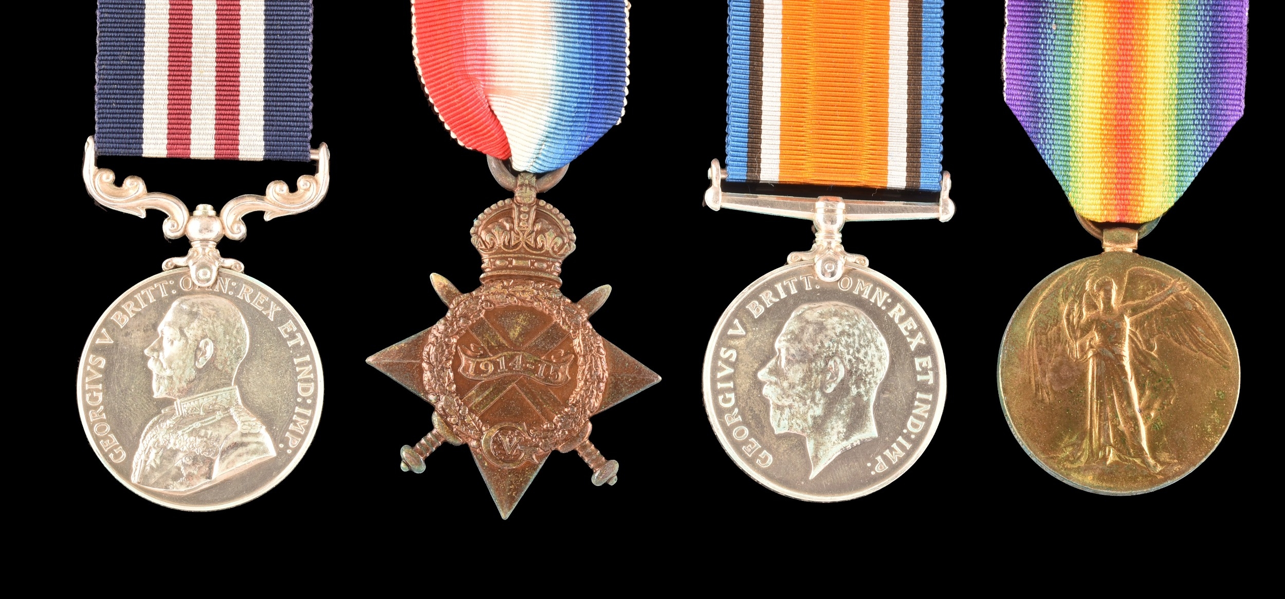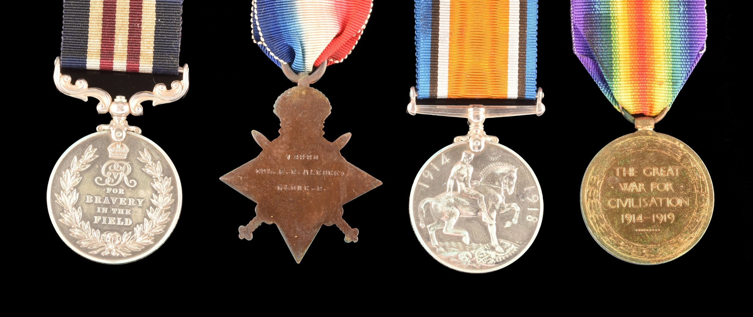 A Great War MM four medal group to: 30847 Company Sergeant Major E. C. Alcock Lancashire Fusiliers / Gloucester Regiment. Comprising a George V Military Medal For Bravery in the Field (30847 C. S. Mjr. E. C. Alcock 10/ Lan: Fus.); a 1914-15 Star (13880 Cpl. E. C. Alcock Glouc R.); a British War Medal (13880 W.O. Cl. 2 E. C. Alcock Glouc R.); and a Victory Medal (13880 W.O. Cl. 2 E. C. Alcock Glouc R.), with Gloucestershire Regiment cap badge.