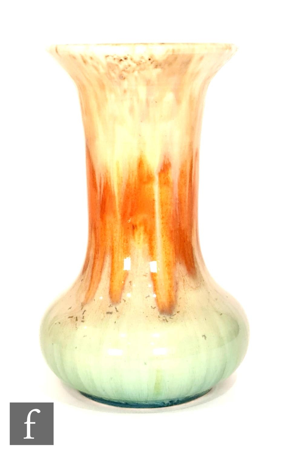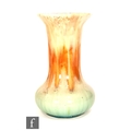Ruskin Pottery - A vase of globe and shaft form decorated with a streaked ochre to orange to pale green yellow glaze with crystalline flecks to the belly, impressed mark and incised W. Howson Taylor, height 19.5cm.