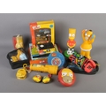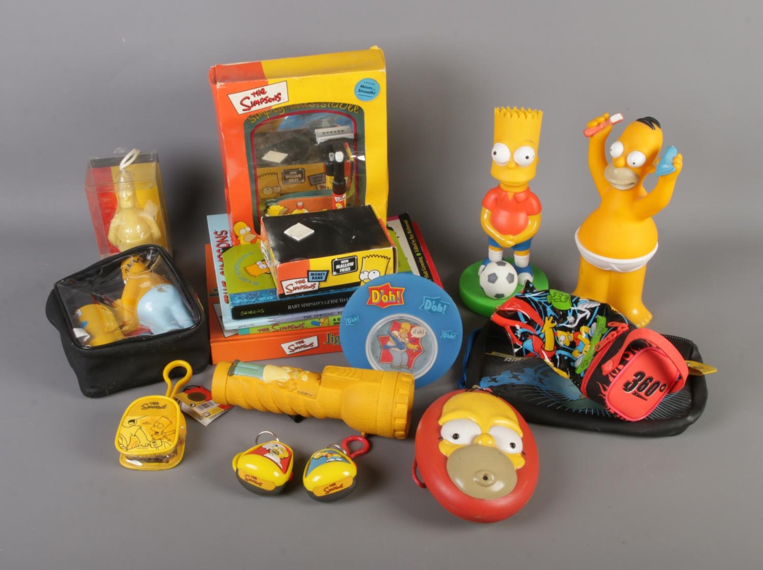A collection of Simpsons memorabilia including shampoo bottles, shaving kit, books, etc.