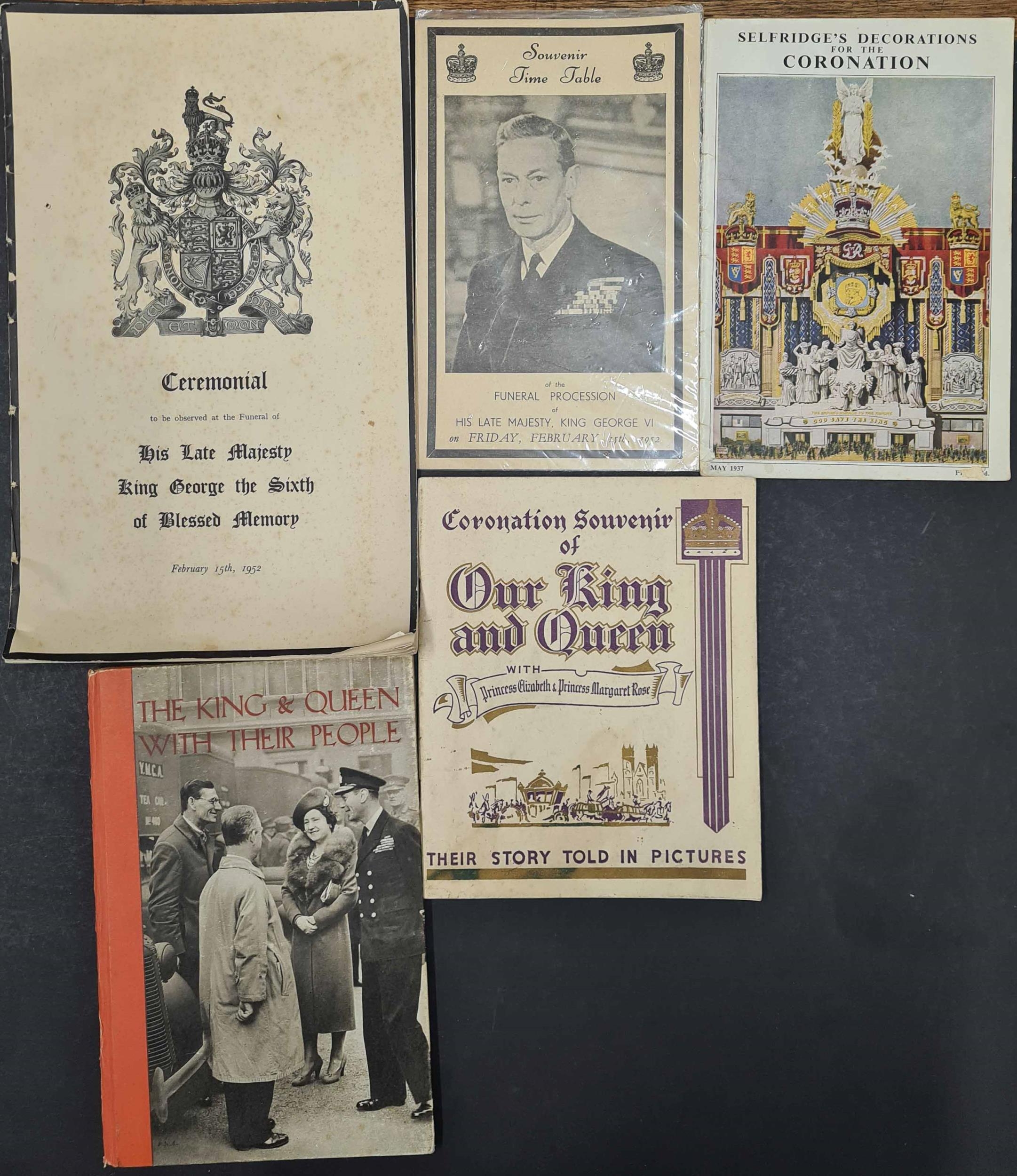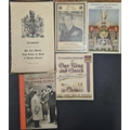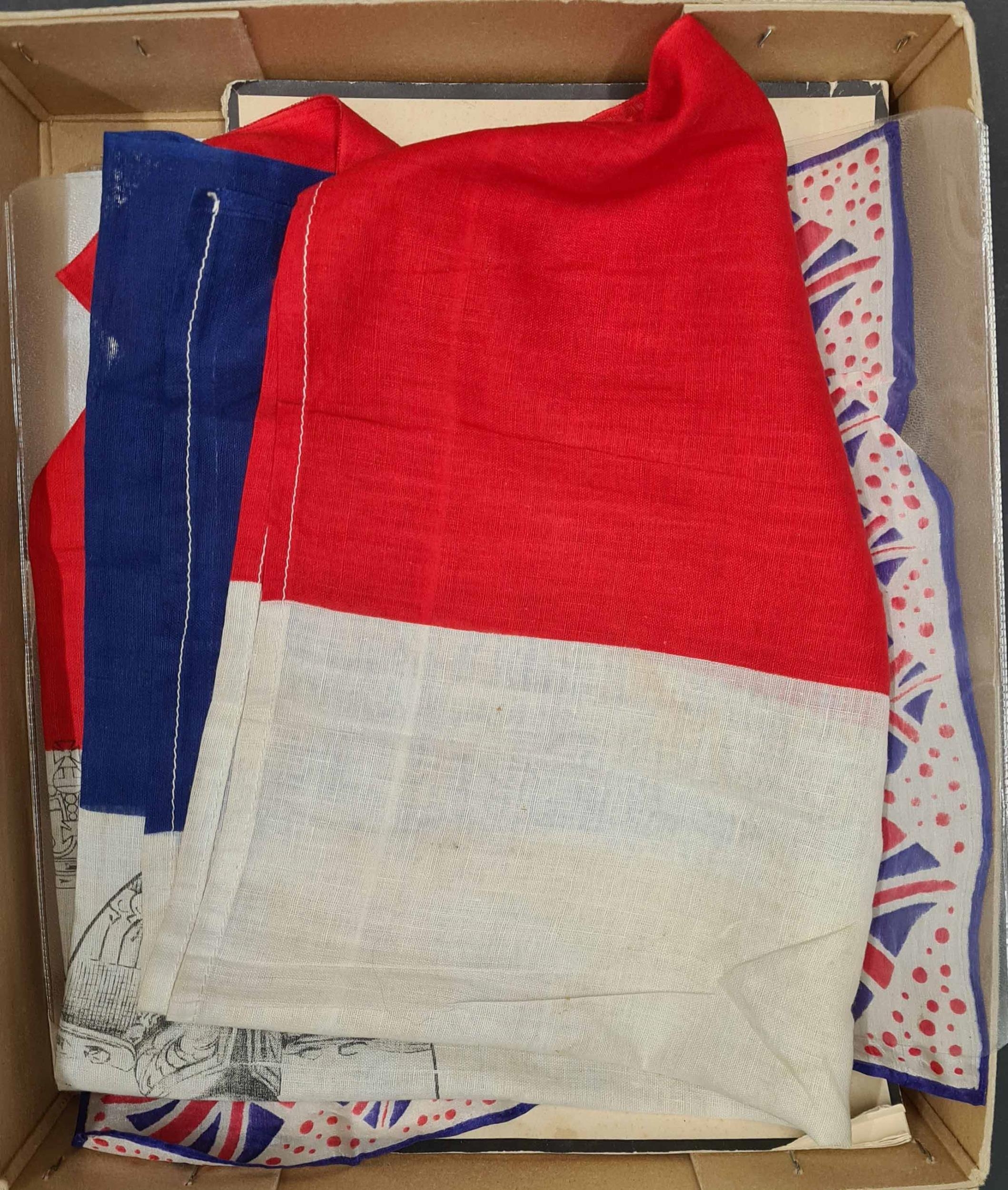 KING GEORGE VI MEMORABILIA: Flat box with a collection of ephemera relating to 1937 Coronation, 1948 Silver Wedding and 1951 Funeral: Includes various programs of events, commemorative flag & handkerchief, Coronation postcards FDI, etc. (c.15 items)