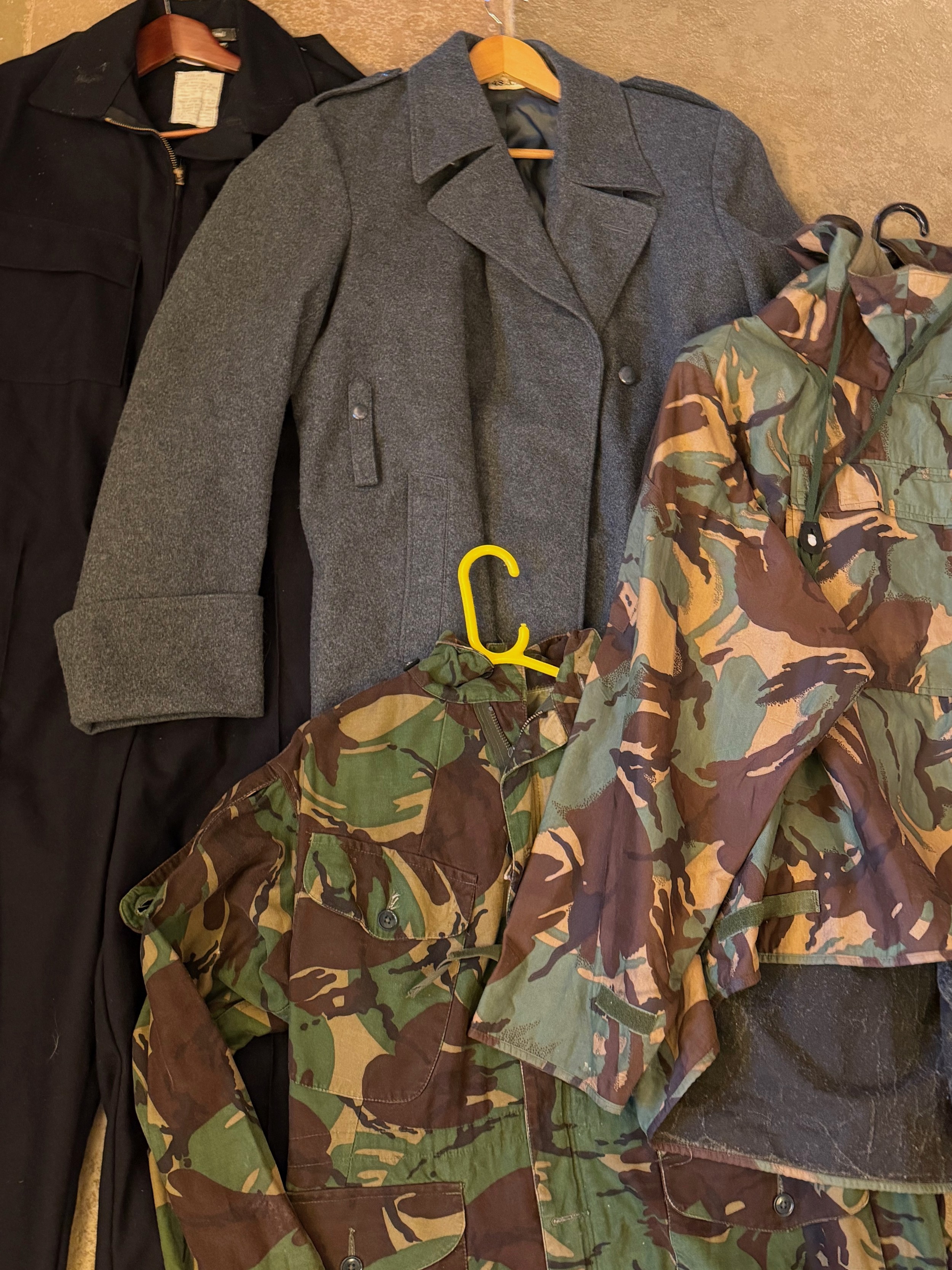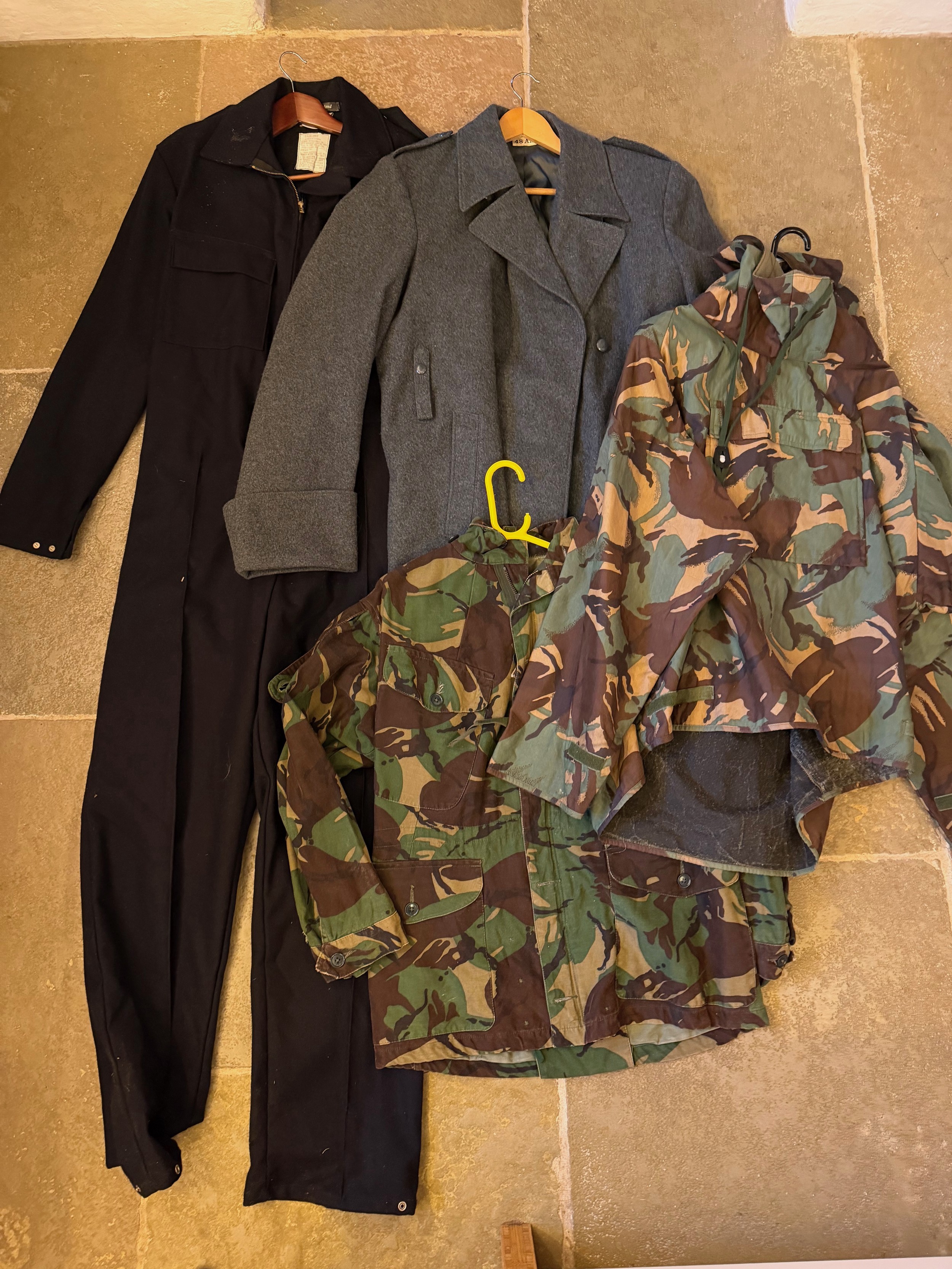 Clothing, military, workwear, jackets, overcoat, coverall. British military jackets, a nurses great coat and a set of coveralls.